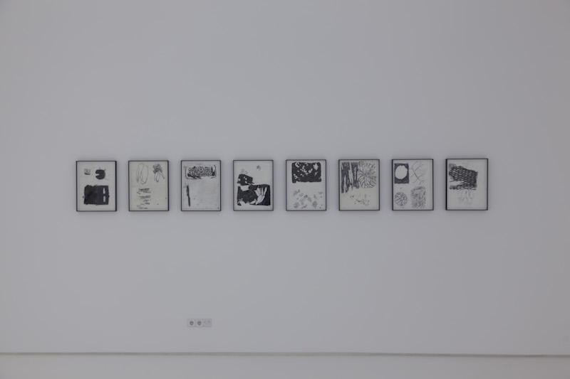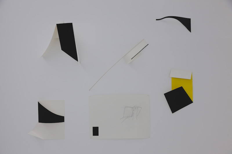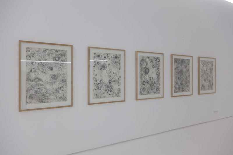 Aparentemente impossível de fixar no papel, o desenho sonoro descrito e verbalizado pela artista de um jardim em transformação, parece ganhar vida na série de cinco desenhos de Alberto Carneiro (n.1937), Os ventos de Outono no meu jardim (2009). A paisagem que se quer tornar visível, a intensidade e rapidez dos movimentos e dos gestos que se repetem, o toque do lápis na superfície de papel e a direção das linhas sugeridas por Luisa Cunha como que se concretizam nos desenhos do artista. Não se tratam de desenhos calmos e estáticos, pelo contrário, há um sentimento de tensão constante, uma força, uma transformação que nos atraí e move na sua direção. Desenvolvida a partir dos ritmos da natureza e reminiscências dos ventos, a série de desenhos Os ventos de Outono no meu jardim revela-nos - tornando visíveis - as energias contidas nas matérias naturais, numa procura do artista em desvendar os seus movimentos. A relação de intimidade que Alberto Carneiro estabelece com o seu jardim, com a terra, com a arte e com o corpo, a relação entre o indivíduo e a natureza, correntes na sua prática artística apresentam-se nesta série em que o desenho se assume como território de experimentação, revelador dos segredos da terra. Por meio do desenho, intermediário entre o pensamento e a mão, Alberto Carneiro transmite para o papel a realidade que observa e que o rodeia, fixando em imagens as impressões obtidas pelo vento sobre os elementos que faz mover: folhas e pétalas de flores em rodopio sobre o chão. Recordando-nos figuras microscópicas ampliadas, à medida que observamos as imagens, deixamo-nos envolver por uma plasticidade orgânica, pelos movimentos elípticos e coreografados das formas, pela inquietude e tensão dos elementos naturais e também pela sua simplicidade, reveladora da capacidade do artista em fixar através do desenho registos breves, espontâneos e tão imediatos como o sopro do vento no espaço. Estabelecendo uma relação e diálogo com a série apresentada, Num plano qualitativo #20 (2020) de Sara Chang Yan (n.1982), promove à semelhança de Os ventos de Outono no meu jardim de Alberto Carneiro, uma reflexão sobre as potencialidades do desenho enquanto pensamento e disciplina que possibilita ao artista o registo da matéria em movimento e transformação. Assumindo o desenho como uma forma de descoberta, revelador de uma certa realidade [4], a prática artística de Sara Chang Yan move-se pela definição de espaço e pelo modo como este pode ser ativado oferecendo-nos algo. Em Num plano qualitativo #20 a artista confronta-nos com seis realidades, formas abstratas, a partir das quais explora a potencialidade espacial do suporte – o papel – através de gestos e intervenções. Quais cometas, a composição de seis desenhos fixa na parede parece querer saltar e expandir-se pelo espaço expositivo, ideia de movimento reforçada pelas dobras no papel, pequenos detalhes inscritos no plano da obra e que o espetador vai descobrindo à medida que se aproxima do conjunto. A simplicidade das formas contrasta com a multiplicidade dos gestos impressos que estão na origem de diversas realidades num mesmo plano. Traços, linhas, pontos, formas geométricas, incisões e orifícios, conjunto de signos, gestos e qualidades que a artista constrói assumindo uma dimensão quase escultórica, refletem o seu interior, o seu tao.
