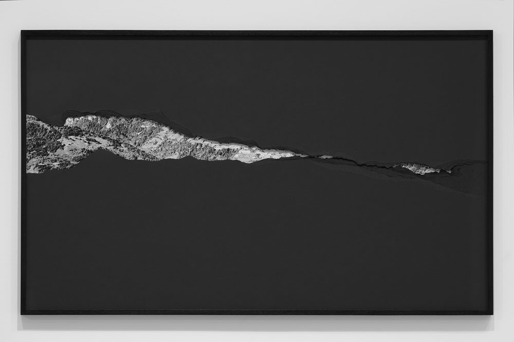 IF: Então, como te dizia, algumas fotografias faço eu própria, e outras compro pela sua beleza imediata, pela sua singularidade. Questiono a imagem de forma diferente consoante a série em que estou a trabalhar. Há séries, por exemplo, como Par la nuit, em que recorro a imagens da sociedade Lapie, uma empresa francesa que trabalhou entre 1958 e 1962 e realizou fotografias aéreas de todo o território francês. Descobri este trabalho fotográfico, que me pareceu muito bonito, e adquiri as fotografias relativas aos Pirenéus. Datam do mesmo período em que esses homens fizeram a travessia nos anos 60, constituindo documentos de arquivo muito relevantes para questionar geograficamente essas imagens. Ao cobri-las com um cartão preto, deixando apenas alguns pontos visíveis da fotografia por baixo, pude explorar a relação com as paisagens, a vigilância da Guarda Civil espanhola e, simultaneamente, com a memória.