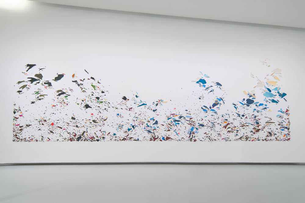 Quando se chega é que se vê este título em latim — Fatum (Azur) —, a palavra fado vem também daí. Significa destino e evoca todos os caminhos possíveis. Só que, em vez de mostrar as linhas da mão, escolhi mostrar os elementos da linguagem visual com que trabalho: papéis rasgados, coloridos. É a minha mão no atelier, mas é sobretudo a relação direta: mão–gesto–papel–cor.