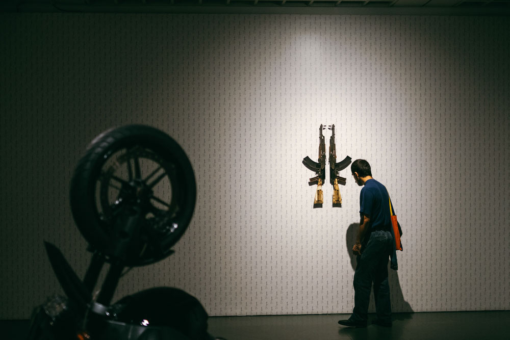 PV: É como as fake news, certo? Sempre houve fake news, e até Júlio César morreu por causa de fake news. Mesmo até os guerreiros tinham as espadas como uma extensão de si mesmos. Então, isso é como um tema milenar que simplesmente se cruzou com a contemporaneidade. E quando chegaste à Culturgest, qual foi a tua experiência em relação ao espaço e à instalação da exposição? Como tem sido trabalhar com a espacialidade do edifício e a energia que ele contém?