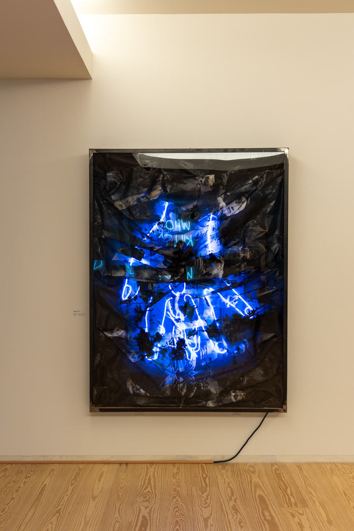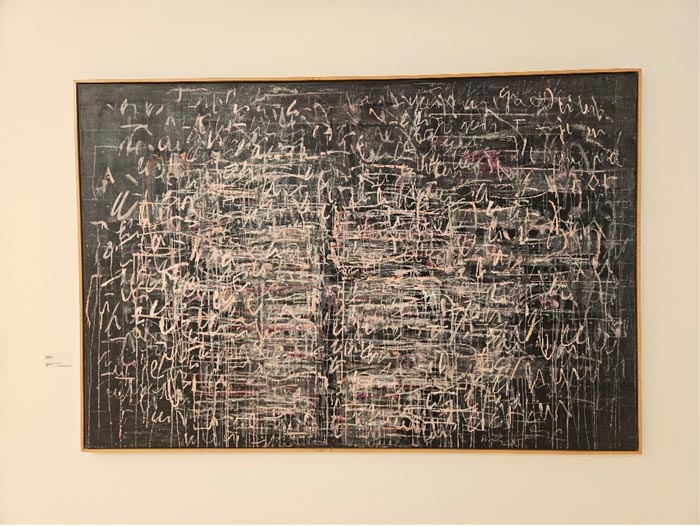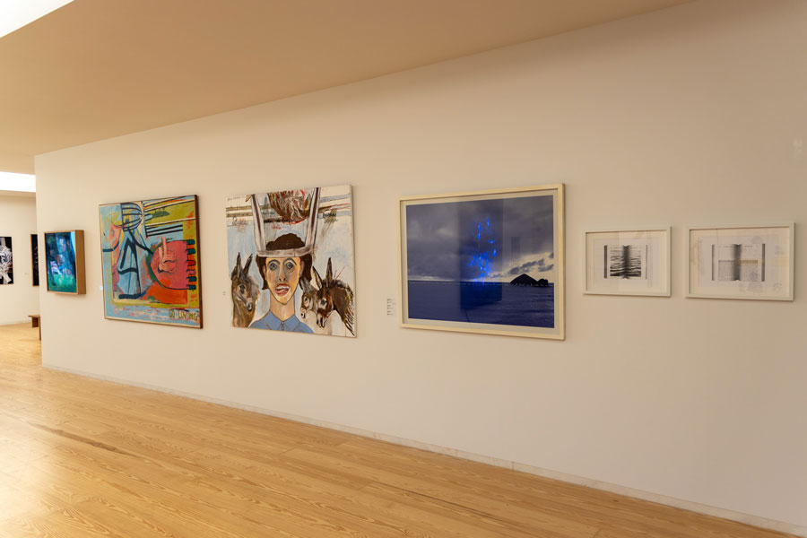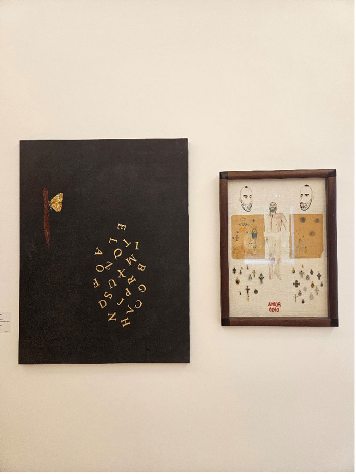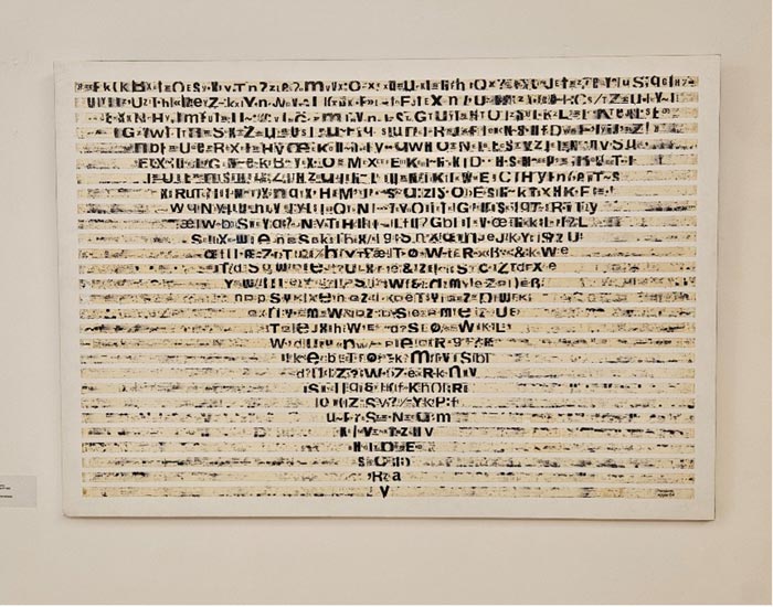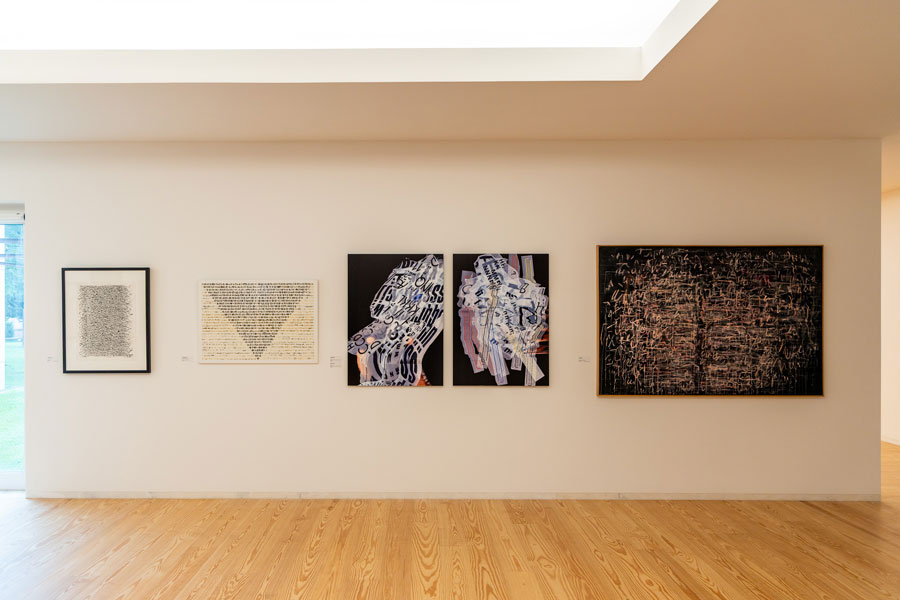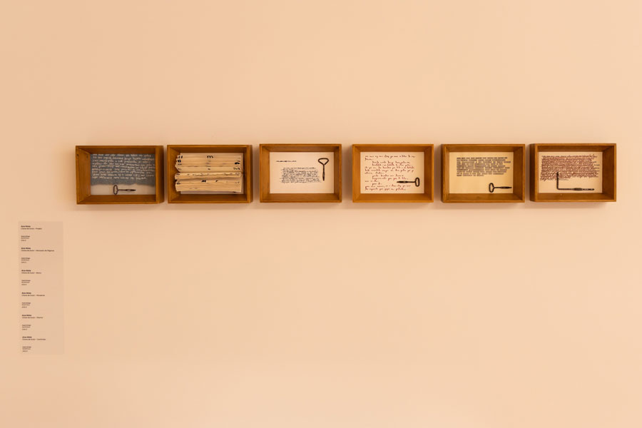 Philippe Sollers na sua obra Le Parc (tanto influenciada pela narrativa ambígua fictícia/real do roman à clef como exemplo concreto do nouveau roman) coloca na voz do narrador a ideia da contínua cambiância que a palavra escrita, formada textualmente numa sucessão frásica, apresenta numa aparente rígida e hirta manifestação imperturbável de um parágrafo. Pois, se ele (narrador) tentava ler, esse excerto se desencaixava, se abria, se interligava numa metamorfose como se dotado de um poder exorbitante (pouvoir exorbitant). Qualquer frase se transmutava em imagens, em rememorações, em viagens, em lembranças, ou sensações de presenças transversais multiplicadas. O ensemble parecia se movimentar, encavalitando-se, sucedendo-se em todos os sentidos, fazendo perder o pé a quem dele se aproximasse [1]. Esta escrita prestes a derrapar no sentido do informe, em contínua dilatação, ou prestes a abrir-se ao ilimitado, inclinando-se para uma visualização dos seus significantes em detrimento da sua exclusiva e auto-proporcional manifestação dos significados, induz-nos numa estetização da escrita pictórica, exarada numa superfície como continuação plástica, juntamente com os ritmos cromáticos, as texturas e as execuções formais, que podemos observar nos artistas em exposição (exemplo claro dado pela assemblage intitulada Chave de Autor de Ana Mota, que numa série de 6 obras, desenvolve metodologias de velamento ou de ocultamento de processos de escrita, polarizando as leituras, através de mecanismos de retenção de sentido, a favor de uma polivalência dinâmica de encobrimentos visuais). O que não deixa der ser interessante, já que nos permite abrir um espaço de controvérsia entre os distintos âmbitos metodológicos, pois se a pintura nada diz, na sua primordial incomunicabilidade e inominável gestualidade, a sua abrangência detém a possibilidade de catalisar todas as manifestações de sentidos excrescentes ou externos, num albergue incondicional, não garantindo que com ele, a escrita se possa diferenciar da pintura (a obra Dobble de Maria José Aguiar é um claro exemplo disso, ou mesmo as obras em exposição de Xai, onde os processos textuais se tornam elementos intrinsecamente pictóricos). No indizível que é a pintura, o dizível da escrita entra em confronto, em contacto de forças antagónicas, ou se quisermos, antitéticas, que por intermédio de uma solução de continuidade descomunicativa, leva a que estas duas placas tectónicas, outrora desfasadas e apartadas na sua geomorfologia, se introjectem (e colidam) na hibridez mirífica que é a obra de arte.