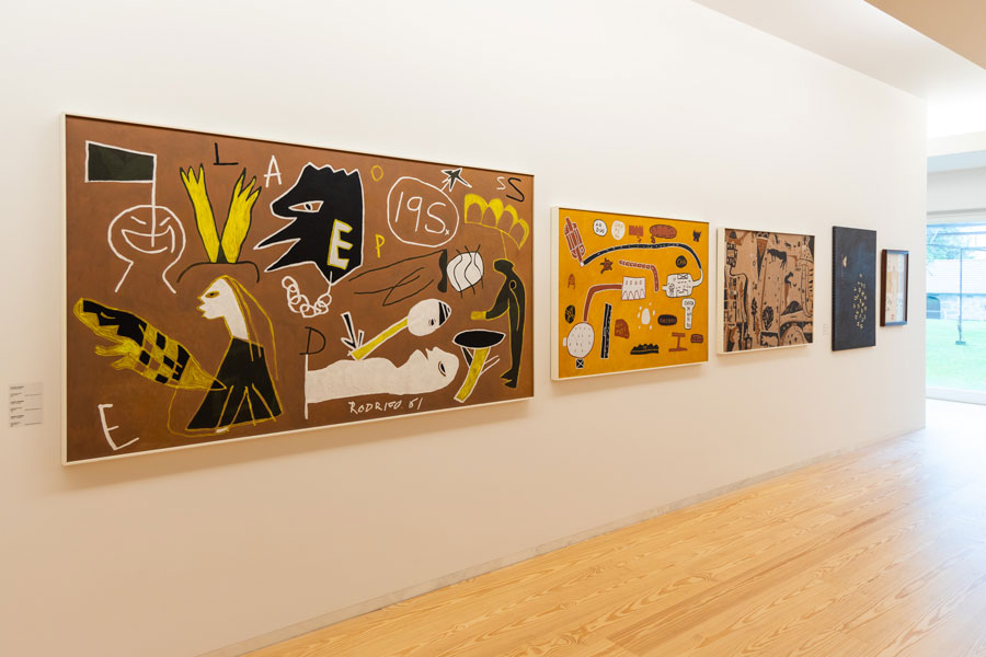 Já a obra de Joaquim Rodrigo revela uma extrema economia de meios expressivos e técnicos utilizando cores naturais da terra como amarelo-escuro, vermelho acastanhado, branco e preto. Em Lisboa – Burgos as imagens flutuam em espaços indeterminados, pois ao rebater o espaço topológico, o artista desintegra as próprias leis da narrativa, espalhando signos, indefinindo a mediação ou a relação entre figuração e expressividade, numa impropriedade pictórica, devedora da transgressão ou subversão dos moldes representacionais. Parece existir uma substituição da imagem pelo ícone linguístico, representando fragmentos de memória, nomes de cidades ou regiões (Burgos e Oropeza), nomes de artistas (Costa Pinheiro) ou despojos cumulativos de inscrições ambivalentes gerando espaços de equivocidade sígnica, na apresentação do poder (des)comunicativo da revelação de sentidos impressos. Leem-se e reveem-se imagens e reconhecem-se (ou não) significados remotos e sentidos visionários, escreve Maria de Fátima Lambert. Em Vasos Comunicantes II, temos acesso a uma panóplia de inscrições escreventes, de aventuras escriturárias, de multiplicações de grafias e agenciamentos de anotações e registos de sinais, em aliança profícua com as concretizações plásticas de uma pintura, aberta o suficiente para despoletar torrentes infindas de percepções, na possibilidade de enfatizar esse corpo comunicante, que é por tradição, a expressão artística.