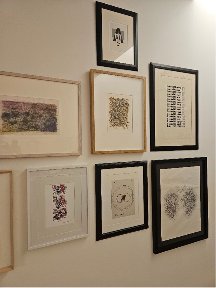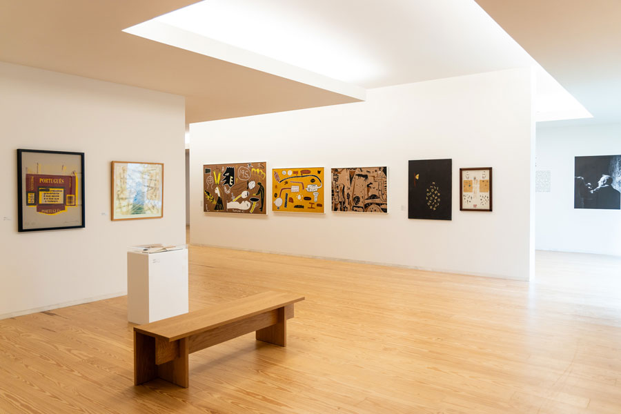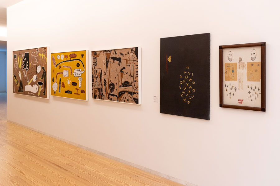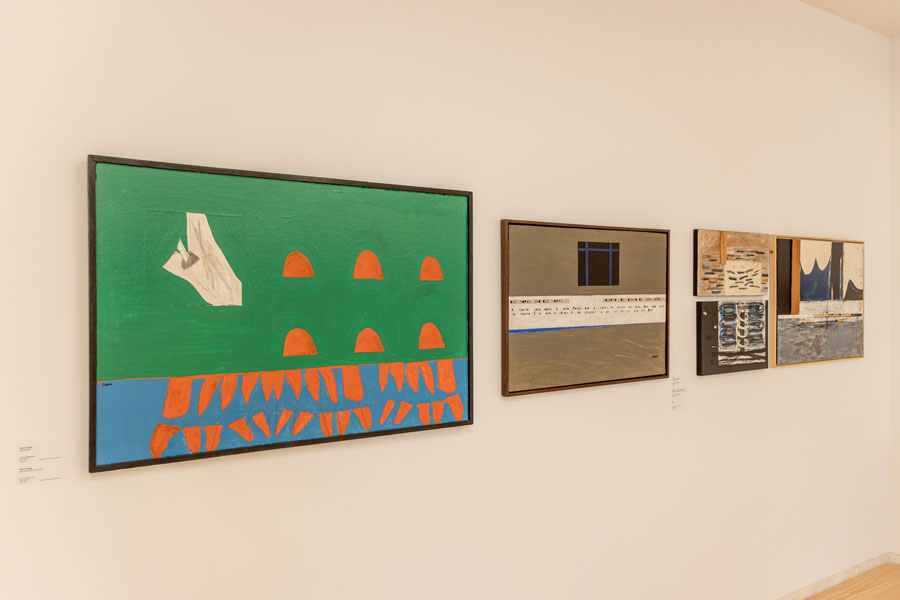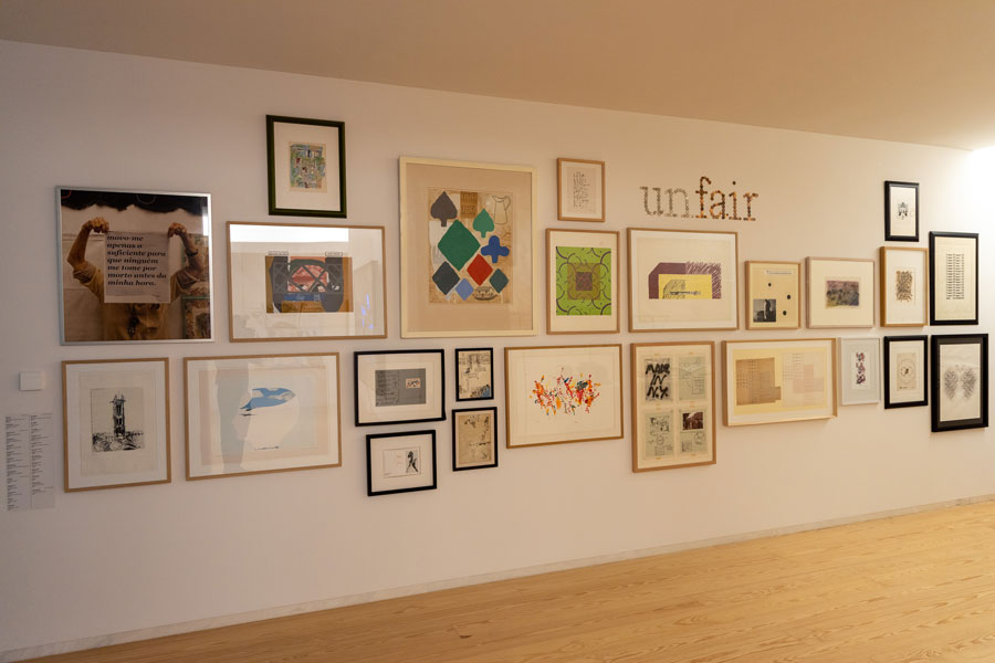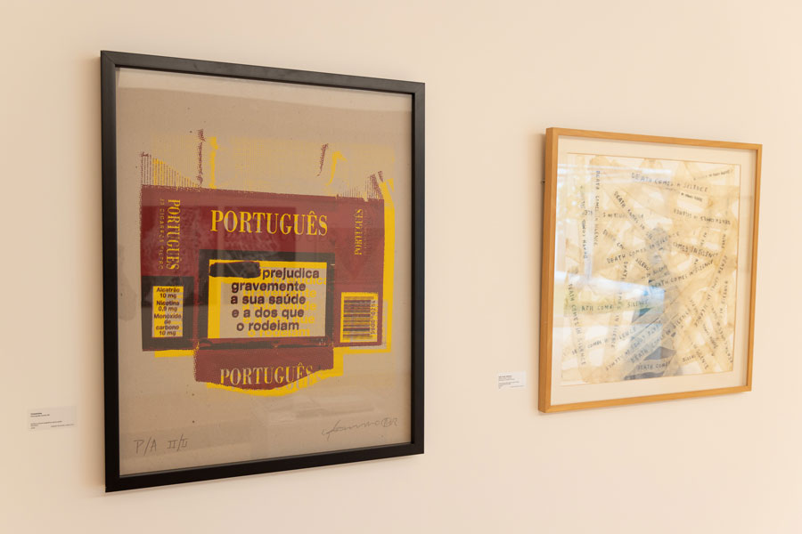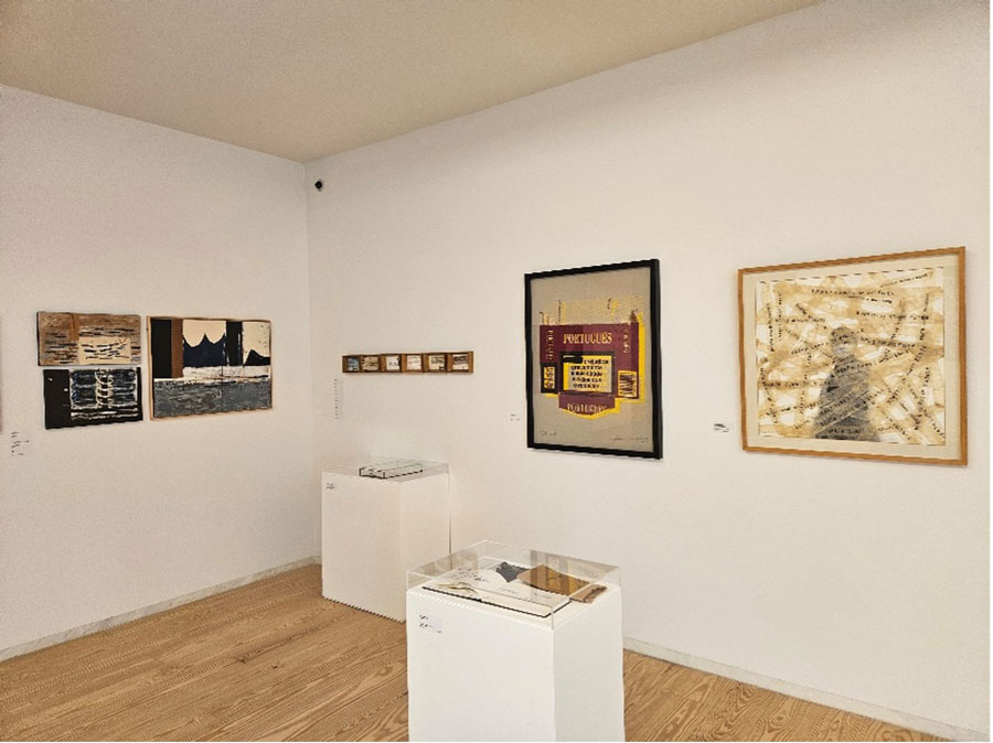 As obras inserem-se em vertentes plásticas subsumidas à invenção de Olhares e Escritas, escreve Maria de Fátima Lambert, alertando-nos para a bífida representação destes artistas, nunca sabendo quando o pêndulo oscilará mais para o campo da escrita em detrimento da pintura, ou vice-versa. Estas contaminações são posições de ultrapassagem da simples figuração, automatizada (ao longo da história das artes visuais) pela posição representativa e denotativa de uma génese matricial da bela-pintura, a favor de uma tendencial usurpação pelos poderes taumaturgos dos processos escreventes pois, esta exposição, permite-nos uma espécie de saudação a Mnemosine, possibilitando-nos traçar ou proceder a uma inventariação historiográfica da palavra e/ou do alfabeto ínsitos na pintura, como condição relacional. Estas incursões históricas, como refere a curadora permitem-nos um levantamento, ou melhor um exercício de percepção de sintaxes e gramáticas - mais do que lógicas ou ilógicas - destituídas de logicidade, afastadas das tradicionais presenças representativas das artes plásticas. Os casos trazidos para esta exposição de Alberto Pimenta, Ana Hatherly, Ernesto de Melo e Castro, Fernando Aguiar e Salette Tavares, instabilizam os campos delimitados do foro textual e visual, numa espacialização da poesia concreta, que alastra consigo uma indeterminação multívoca de sinaléticas e versificações visuais, exponenciando as perturbações e polarizações de escritas altamente dinamizadas no recinto visualizável das suas formatações. Nesta alogicidade que é a pintura da escrita, as redes de consubstanciação da heterogeneidade plástica (tensão entre texto e pintura), elevam a obra para uma radicalidade de imprevistos e de intensidades recrudescidas de criação programática de originalidades, no desmoronamento das clausuras habituais e totalitárias das identidades distintas.