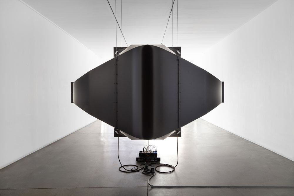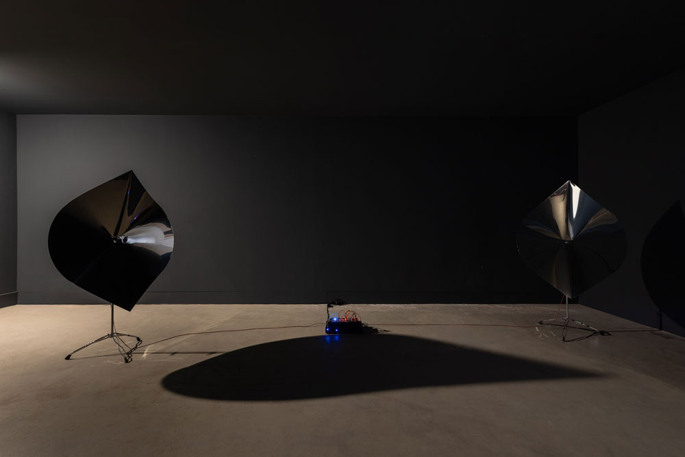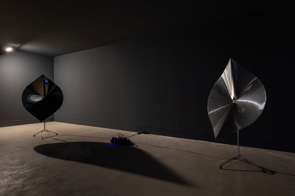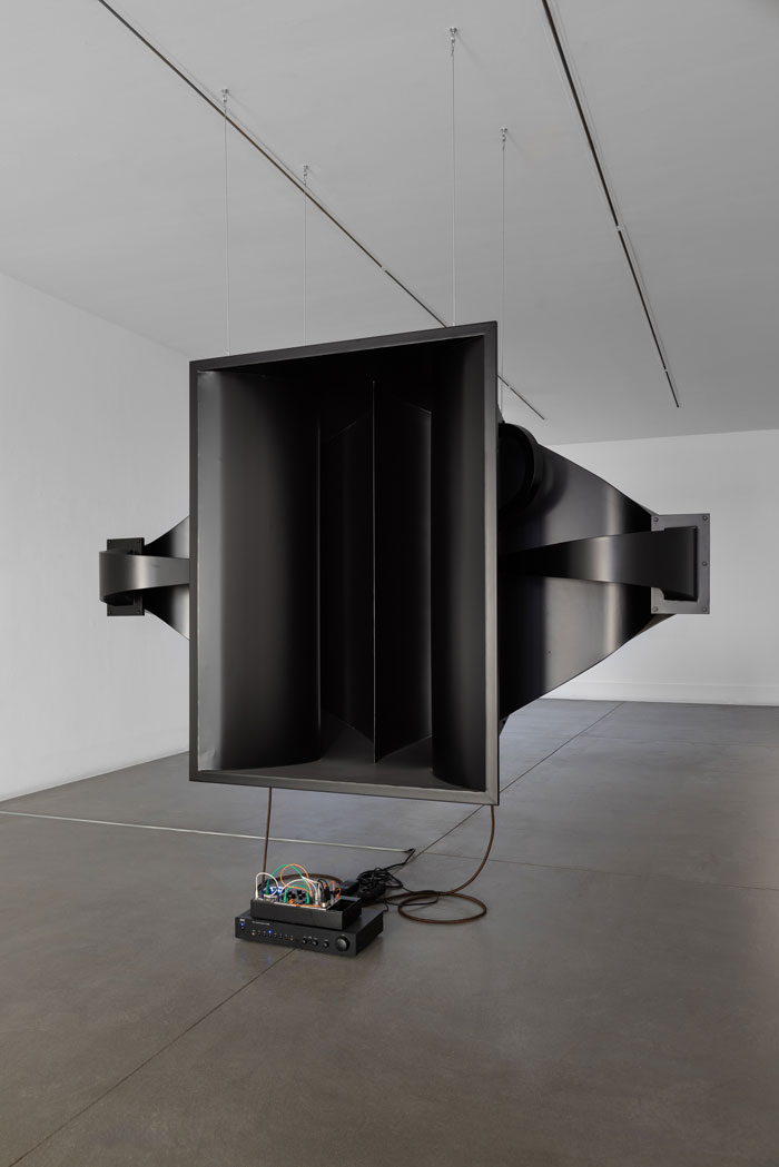 O título da mostra já expressa as questões que nos confrontam ao adentrar a Galeria da Boavista: os duplos, a imaginação do espaço, o aspecto sônico enquanto condutor da percepção espaço-temporal. “Dois Stereos” inclui a ideia de duplicação, entretanto é, também, um nome meta-semântico, uma vez que o próprio som estereofônico é um sistema binário: dois “estéreos” são, na verdade, quatro saídas de som. A multiplicação implícita no título indica o procedimento que apresentará as muitas outras camadas sensíveis emergentes no percurso expográfico. Na primeira sala da galeria, nos deparamos com um objeto contundente: um enorme volume preto alocado no centro do espaço — uma estranha escultura com aparência futurista. Trata-se da réplica de uma corneta acústica utilizada em salas de cinema na década de 1920: o sistema Western Electric 16A. Conectados a ela, encontram-se quatro módulos para o sistema Eurorack de sintetizadores: um sampleador, dois filtros e um LFO (Low Frequency Oscilator). O som etéreo que infiltra a sala, composto por vozes humanas, conjura a própria história do cinema ao assinalar a transição dos filmes mudos para os falados, marcada pelo lançamento do longa-metragem The Jazz Singer, em 1927. O áudio produzido envolve aquele imponente objeto em uma aura tão misteriosa quanto sublime. Subimos as escadas ao fundo e entramos em outra sala para conhecer o segundo sistema sonoro de Gomes. Ao contrário do primeiro cômodo, composto por paredes brancas e pela ampla vitrine da galeria, este é um espaço menos arejado, configurando uma black box — portanto, mais propício à imersão. O convite à demora é figurado na presença de um banco posicionado de frente para a instalação sonora. Aqui, podemos ver dois objetos grandes e pretos, sustentados por tripés e colocados paralelamente, embora voltados para a parte interna do quarto. Seu formato é ainda mais intrigante do que aquele observado na primeira obra: com desenho nitidamente orgânico e um material metálico de brilho intenso, as duas pétalas maquinais nos remetem simultaneamente ao nível molecular da vida biológica e à plasticidade acética do mundo inorgânico. Aqui, a referência é o instrumento musical Cristal Baschet, criado em 1952 a partir da polêmica Glass Harmonica: um idiofone friccionado do século XVIII que foi descontinuado e até mesmo proibido em alguns territórios europeus [2]. Entre essas duas estruturas, outro sistema modular Eurorack que contém cinco módulos: um sampleador, dois filtros, um LFO (Low Frequency Oscilator) e um mixer. O sintetizadores são conectados às pétalas metálicas, fazendo-as vibrar e amplificar o som — como no Cristal Baschet original. A tensão entre o orgânico e o inorgânico é refletida, também, no próprio aspecto sônico da obra: no lugar de osciladores, fontes sonoras comumente utilizadas na síntese eletrônica convencional, o artista escolhe uma origem orgânica para o áudio produzido — vozes humanas são sampleadas e moduladas pelos sintetizadores. Esta decisão ainda atualiza a fonte sonora corporal do Cristal Baschet, um instrumento totalmente acústico cujo som era produzido pela fricção dos dedos umedecidos contra cristais de vidro. Sem emitir nenhuma palavra definida, o ambiente é imerso em uma suavidade estranha e fantasmagórica. Por último, ao descer as escadas de volta para a sala principal, surge inesperadamente a última obra da exposição. Doppelgänger encontra-se entre os dois ambientes da galeria, no corredor que os conecta. A pequena Polaroid quase passa despercebida, mas é precisamente o caráter furtivo aquilo que sublinha sua função na mostra. Um entre-lugar omitido no preciso título da exposição, Doppelgänger emerge como um excedente, um substrato sobressalente e residual das duas máquinas escultóricas-sonoras em pleno funcionamento: uma diminuta imagem aparentemente deslocada. Salomé Voegelin argumenta que apesar de não ser um atributo do visível, o som atinge profundamente o âmago da visualidade, mostrando movimentos subterrâneos e invisíveis da organização visual do mundo, de modo a questionar a centralidade do olhar [3] A única fotografia presente na mostra reside no centro dessa disputa. O título da obra novamente explicita o dispositivo binário que conduz Dois Stereos, mas não apenas: ao evocar a ideia de sósia — um duplo vicário — ela também convoca o caráter espectral e fantasmático que permeia todo o projeto. Evidentemente, a fantasmagoria é um conceito fundamental para a fotografia, mas também o é para o cinema. Nesse sentido, a obra na sala principal que replica o Western Electric 16A se inspira na ideia de som duofônico, isto é, um sistema estereofônico falso que emula a percepção tridimensional ao dividir um sinal mono em dois canais, criando diferença temporal e sonora entre eles. Essa discrepância normalmente é gerada por uma pequena defasagem entre os canais e pelo uso de filtros low pass em um, e high pass no outro. Uma espécie de doppelgänger sônico, aqui, mais uma vez, o que está em jogo são mais as reverberações do que os objetos em si. A exposição estabelece uma ressonância sensível, também, entre múltiplas temporalidades, criando um campo de fricções, ecos e sobreposições históricas no mesmo espaço físico. A década de 1920 é evocada pela réplica do Western Electric 16A, marco da engenharia acústica de seu tempo. Os meados do século XX surgem na referência ao Cristal Baschet, cuja sonoridade e estrutura remetem ao ancestral Glass Harmonica do século XVIII. Em seguida, a fotografia Polaroid convoca a sua época icônica, entre as décadas de 1970 e 1980. Por fim, o Eurorack é um sistema modular desenvolvido nos anos 1990 e difundido nas duas décadas seguintes. As diversas camadas históricas são acessadas de forma fragmentária e não linear através de percepções sensíveis provocad