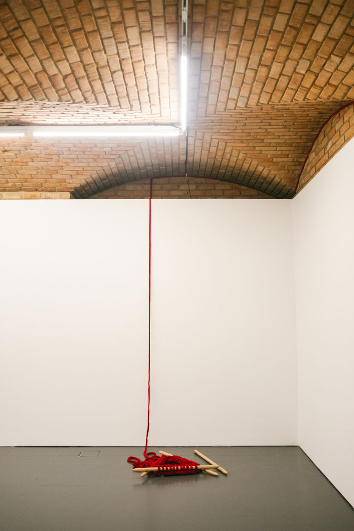 O salto dos cabos, na sua desconformidade e desconfiguração, é, por um lado, um salto de algo que se rompeu, que se revelou detrás das telas. Mas também expressa que a costura, os fios e as tramas que ligam a nossa vida estão presentes de formas diversas — que tudo no mundo se trata de uma espécie de assemblage. Costurados, misturados, assemblados, estamos. E há, entretanto, espanto e desconforto com essa estranha composição. A aproximação e o entrosamento entre o interior e o exterior estão muito bem conseguidos neste trabalho. Na verdade, arriscaria até dizer que a interioridade sumiu. Não se trata de uma exposição intimista; a artista está imersa no seu tempo e nas suas respetivas alegorias e materiais. A interioridade aqui é uma interioridade possível, de certa forma até mesmo questionada, uma vez que, por meio do vasto uso de roupas e têxteis, a ideia de interioridade aparece como fabricada, misturando-se ao exterior, estando nele implicada.