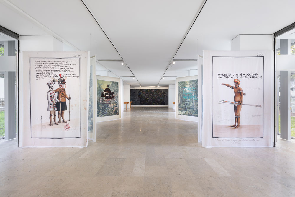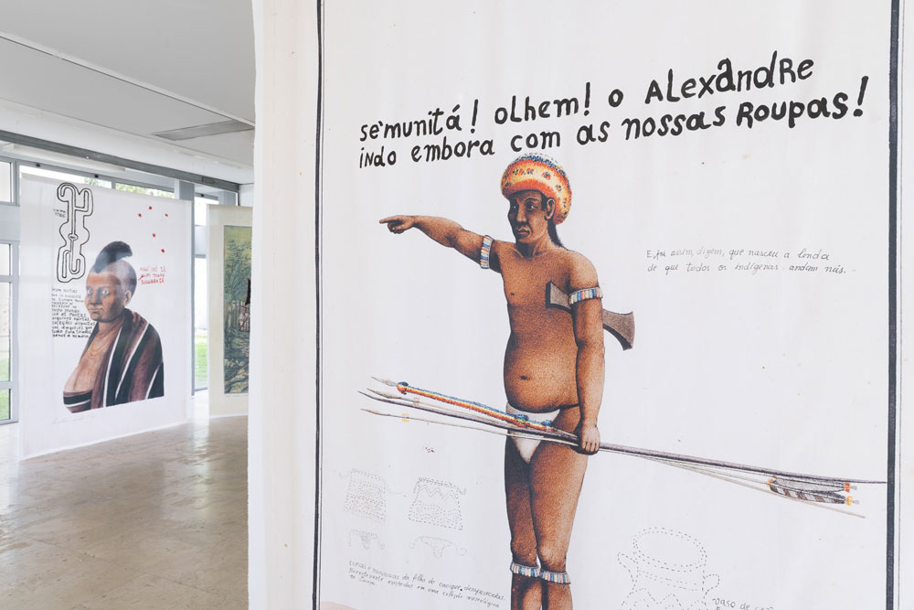 Nascido em Barcelos, no Amazonas, Denilson Baniwa desenvolve uma prática que atravessa múltiplas linguagens, como pintura, desenho, performance, intervenção digital e apropriações críticas de acervos iconográficos. Cada gesto que compõe sua produção configura-se como uma insurgência poética, capaz de tensionar as estruturas que ainda organizam a memória ‘oficial’, abrindo brechas por onde outras histórias, cosmovisões e narrativas podem emergir. Fica evidente, ao percorrer a galeria, o potencial da arte como espaço de cura e de confronto, articulando de forma indissociável dimensões éticas, espirituais e políticas. O conceito de contra-feitiço se conecta ao feitiço colonial, que transforma elementos das culturas indígenas em fetiches ou mercadorias, funcionando como instrumento de controle simbólico e cultural. Diante das obras, observa-se como o gesto de Baniwa subverte a lógica colonial, questionando quem detém o poder sobre a memória e a narrativa, ressignificando imagens para restaurar protagonismo. Ao reorganizar acervos coloniais, Baniwa pratica esse contra-feitiço, revertendo o feitiço colonial que transformou territórios, seres humanos e não-humanos em objetos de consumo e espetáculo, reafirmando a identidade indígena. Essa desprogramação atravessa o espectador, provocando uma experiência de tensão, reflexão e consciência sobre a resistência indígena, evidenciando um gesto insurgente que desfaz a dominação colonial e afirma a criação contínua das culturas indígenas. Logo na entrada, o chão deixa de ser suporte neutro, cartazes coloridos e vibrantes se oferecem aos pés do visitante, convocando o corpo a atravessar a obra e a se confrontar com ela desde os primeiros passos. Neles, lê-se a frase “Lisboa é terra indígena”, que afirma que o pensamento e a continuidade indígena não se limitam à geografia da floresta, funcionando como performance permanente. Ao percorrer a exposição, torna-se notória a forma como a presença ancestral e o território se articulam no espaço, ao mesmo tempo que esses cartazes evocam a memória de objetos sagrados aprisionados em museus e arquivos históricos e etnográficos de Lisboa e Coimbra, como, por exemplo, o manto ritualístico. A atuação deste trabalho provoca a reflexão sobre a persistência do colonialismo nas instituições ocidentais, suscitando a consciência da continuidade e existência indígena. No percurso da exposição, a série Rasuras (2025) merece atenção especial. Nela, Baniwa intervém sobre impressões digitais em tecido do acervo do naturalista Alexandre Rodrigues Ferreira, disponibilizadas pelo Museu Nacional de História Natural e da Ciência da Universidade de Lisboa. As obras tornam visível a dívida histórica do etnocídio contra os povos indígenas e revelam como os acervos iconográficos reforçaram a mercantilização de objetos sagrados, das vidas indígenas e da fauna e flora local. Nesse gesto, a obra estabelece um diálogo com o pensamento do ativista e escritor Ailton Krenak, autor de Ideias para Adiar o Fim do Mundo (2019), que alerta para a necessidade de desestabilizar as lógicas de dominação antropocêntrica que estruturam nossa relação com o mundo. Como ressalta Krenak, “talvez estejamos muito condicionados a uma ideia de ser humano e a um tipo de existência; se desestabilizarmos esse padrão, nossa mente poderá sofrer uma ruptura, como se caíssemos em um abismo. Mas quem disse que não podemos cair? Quem disse que já não caímos?” (Krenak, 2019). A obra de Baniwa ecoa com o pensamento de Krenak, evidenciando a necessidade de repensar as estruturas que condicionam nossa relação com o meio em que vivemos e com as formas de existência. O artista amplia sua crítica ao intervir em imagens do acervo colonial, inserindo nos corpos representados elementos da cultura visual contemporânea, como marcas globais, objetos tecnológicos e signos da vida urbana para deslocar a percepção do espectador e provocar um choque visual, rompendo estereótipos que associam os povos indígenas a um passado fixo, alheio à modernidade. Ao evidenciar que o uso de roupas de marca ou de aparelhos tecnológicos não implica a perda da identidade indígena, Denilson afirma a contemporaneidade desses povos, reposicionando a tecnologia como instrumento de comunicação, resistência e afirmação política. É possível notar também que Baniwa articula imagem e palavra em obras de grande escala, incorporando inscrições textuais que funcionam como camadas de leitura crítica. Pintadas à mão, de forma sutil, sobre o tecido impresso, essas frases exigem aproximação física, instaurando um gesto de atenção e escuta que se contrapõe ao distanciamento do olhar museológico dominante. Entre estas frases, destaca-se “Pensamentos decoloniais em conflito com a conta de energia elétrica atrasada”, que emerge da cabeça de um homem indígena, expondo o choque entre a produção de pensamento crítico e as urgências concretas da vida cotidiana, revelando sujeitos indígenas atravessados por responsabilidades econômicas e desigualdades estruturais. Outras frases, como “todo acervo fechado é uma coleção de mortos, sem ânimo, sem paixão”, denunciam o carácter fetichista das coleções coloniais, em que corpos, objetos e até espíritos de animais permanecem aprisionados. Já a pergunta “Mas afinal, o que é arte?” desloca o debate para o campo artístico, convidando o público a refletir sobre os critérios institucionais que definem o que é considerado arte e quem detém o poder de legitimá-la. Ao condicionar a compreensão da crítica a um gesto ativo de aproximação e atenção, Baniwa transforma sua prática em ato político, revelando que palavra e imagem juntas têm o poder de questionar as narrativas e os sistemas de poder que determinam o que pode ser visto, preservado e reconhecido como arte. No contexto português, marcad