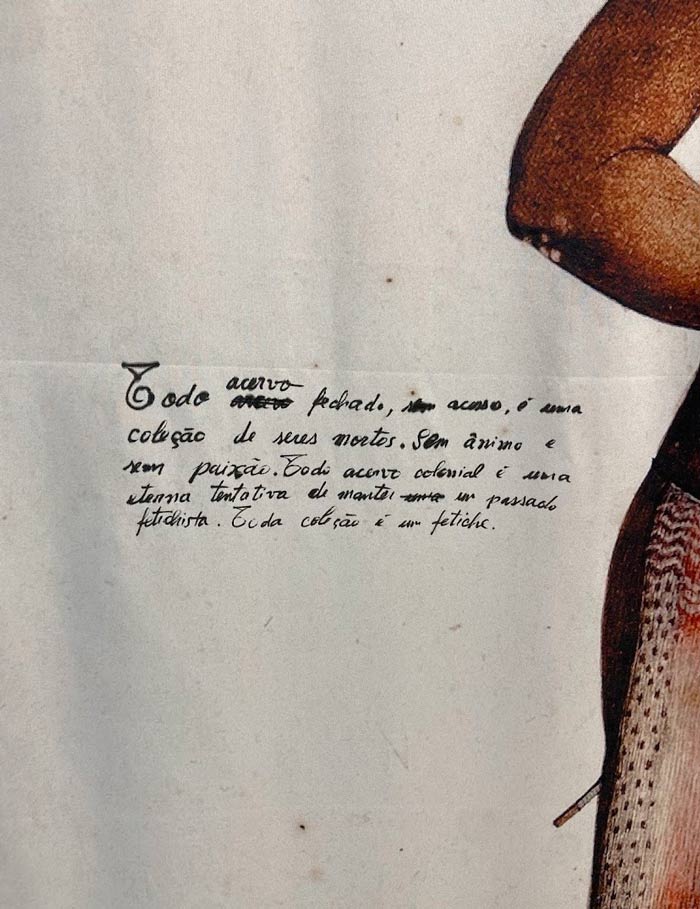 A partir desse encontro com a exposição e de suas reverberações realizou-se uma entrevista com o artista. Esta aprofunda as principais questões que atravessam sua prática, tais como a relação com acervos coloniais, a urgência da reconfiguração das imagens, os caminhos de resistência, cura e criação. Foi neste sentido, que refletimos também sobre o papel da arte enquanto potência político-espiritual na afirmação de retomadas históricas e imagéticas, que conectam passado e presente, reposicionando os povos indígenas como protagonistas de suas próprias narrativas.