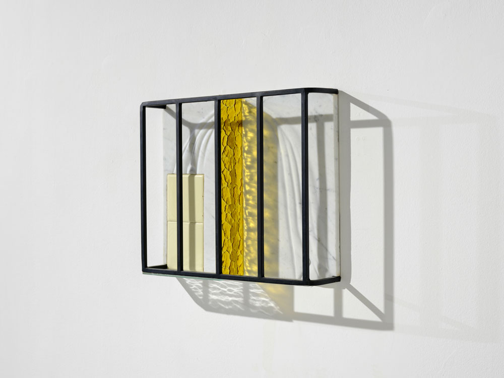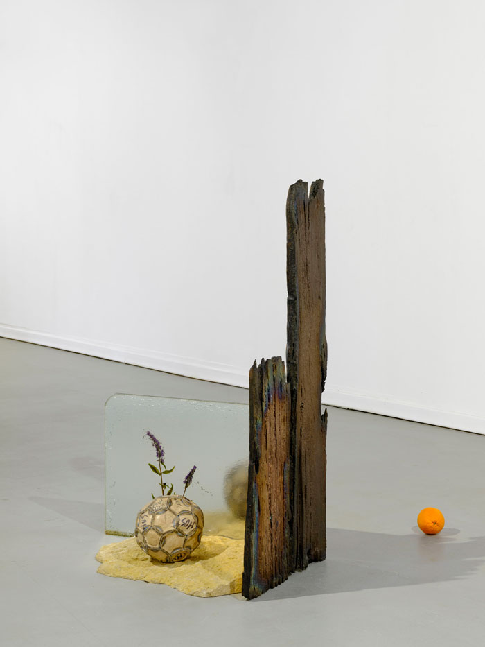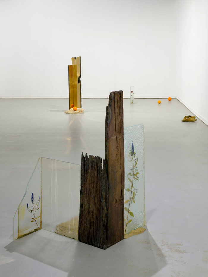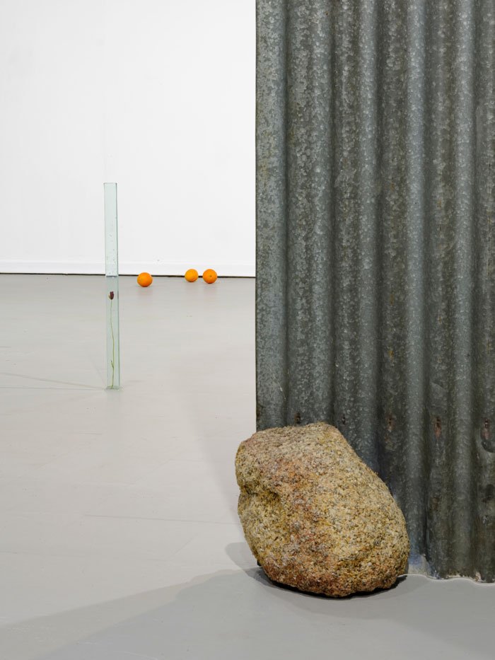 No começo do percurso, Almendra colocou uma estrutura ténue, delgada, sobre o solo, ao centro da sala. Vários materiais, alguns de frágil construção, como chapas onduladas entre outros, assomam, articulados entre si, de modo débil. A estrutura, que aparenta ser uma amostra de um pequeno habitat, um abrigo, ou vedação, foi construída com o recurso a vários materiais reciclados, que terão sido encontrados ao acaso, no campo ou na cidade. Intuímos essas pequenas construções, como os espaços imaginados em que se inserem. Almendra consegue, primeiro, transportar-me para fora da galeria, e depois, fazer-me perceber, através da transitoriedade, a inexistência de barreiras arquitectónicas.