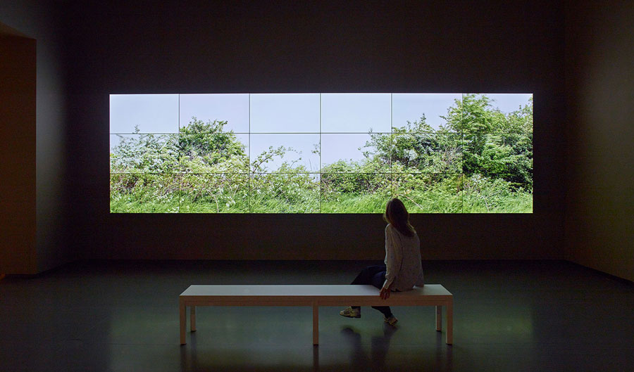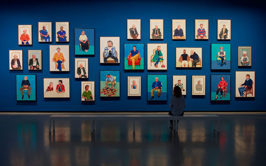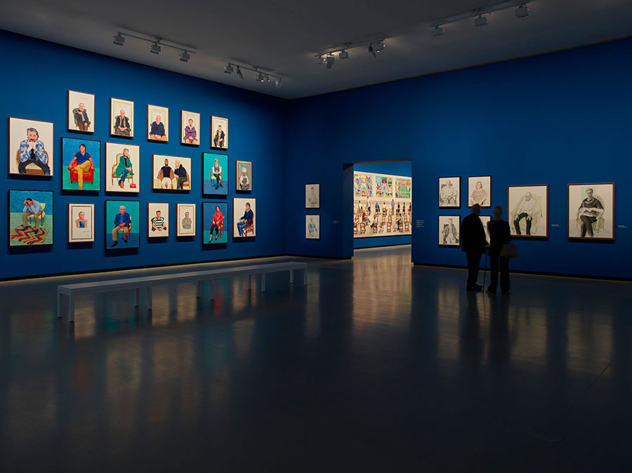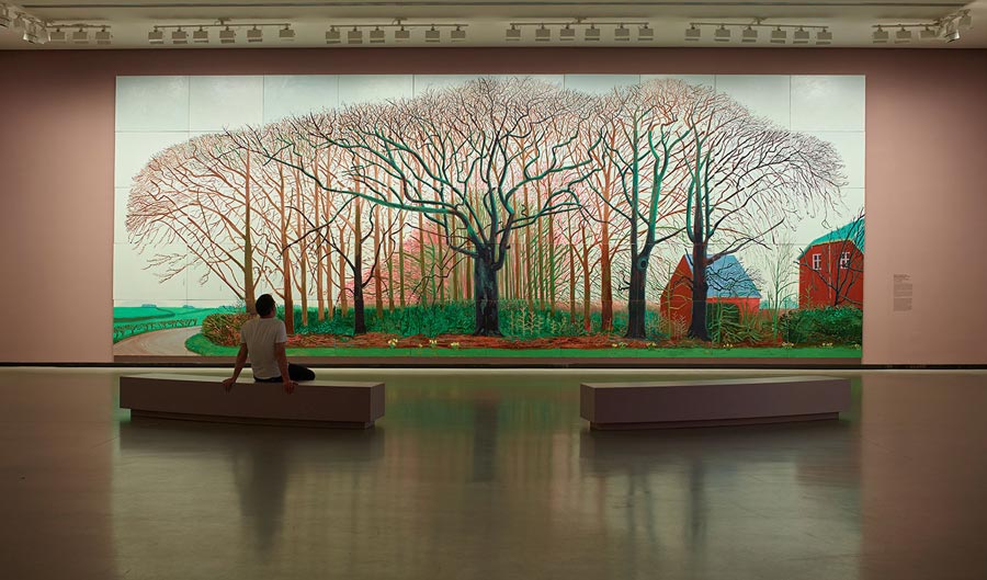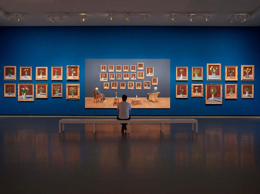 A primeira secção começa com Portrait of My Father (1955) que pintou aos 18 anos, idade que marca o início da vida adulta e a partir da qual Hockney se aventura nos temas, na linguagem pictórica e na média escala, com uma diferenciada sensibilidade pop para o desenho e pintura. Reconhece-se os indícios: a apropriação de imagens da história de arte, a tendência pictórica para a criação de espaço, o retrato, a paisagem, a cor, o reconhecimento da sua homossexualidade. O anúncio dos duches com homens nus (ex. Boy about to Take a Shower, 1964-1969) é o convite para a próxima sala, a do calor da Califórnia e das míticas pinturas de L.A, para onde se muda em 1964. Estão presentes A Bigger Splash (1967), Portrait of an Artist (Pool with Two Figures) (1972) - a pintura mais cara de um artista vivo, vendida em leilão -, os retratos duplos de Mr. and Mrs Clark and Percy (1971), e de Christopher Isherwood and Don Bachardy (1968). E podia continuar a nomear as pinturas desta divisão (a minha preferida foi The Room,Tarzana (1967), uma pintura que não conhecia e que, talvez por isso - sem ter uma reprodução mental para comparar - tenha experienciado a pintura genuinamente). Apesar desta secção fazer as delícias a qualquer visitante, - pois é uma oportunidade única ver este conjunto emblemático que, dificilmente, se verá noutro contexto semelhante e próximo - as pinturas reunidas servem mais para mapear, de forma genérica, um percurso geográfico e visual dos seus temas prediletos, do que para dar a conhecer a obra deste período. O tão esperado início expositivo peca por serem poucos os trabalhos expostos, quando existe uma extensíssima obra nos hiatos temporais entre eles. Nada em Hockney é pontual, tudo é uma preocupação constante e multiplicada, o que nos fez estar preparados para a abundância que prescreve e que aqui não existe dado o compasso de 43 anos. A passagem do erotismo dos corpos e da temperatura saturada refletida nas paredes vermelhas desta primeira secção, é substituído pelo ar fresco das paisagens verdejantes do Yorkshire e sente-se o salto entre o Hockney de 30-40 anos e o de 60. A gradual mudança de território fá-lo levar a luz e a cor da Costa Oeste dos EUA para o norte de Inglaterra. Inicia-se a ode às estações do ano e ao género da paisagem. Desde que Hockney se apercebeu da chegada da Primavera em 2002, em Londres, quando se dirigia para o atelier de Lucien Freud, tem vindo a pintar a passagem das estações e dos dias, nas suas constantes variações (séries The Arrival of Spring) e inspirado por pintores como Constable, William Turner, Monet e Van Gogh. Mas Hockney não pinta apenas paisagens. Hockney e a sua obsessão pelo ato de ver fá-lo ser detentor de um conhecimento profundo da história das imagens, e sabe conciliar os meios tradicionais da representação pictórica com os mais recentes e tecnológicos, combinando-os para conseguir capturar cada variação formal e lumínica nos mais diferentes meios e escalas - a carvão, caneta, aguarela, acrílico, óleo, no digital do iPad, ao ar livre ou em estúdio, mapeando as imagens através da fotografia e vídeo. A gigante pintura Bigger Trees near Warter or/ou Peinture sur le Motif pour le Nouvel Age Post-Photographique (2007) é disso exemplo: é composta por 50 telas pintadas in situ, por observação directa, durante 6 semanas, o que também coloca sobre a mesa a problemática temporal e sazonal do que é representado. Esta pintura transporta o observador para um ambiente envolvente que desafia a escala e a nossa noção de espaço e perspetiva. O uso de ferramentas como o Photoshop e o iPad deram origem à realização dos 220 desenhos da Normandia durante a pandemia do Covid-19 em 2020, em que explora a panóplia de pincéis e a construção por camadas editáveis, além de que o tempo de execução é mais acelerado. Na exposição, grande parte dos desenhos são impressos sobre papel, numa escala maior que o ecrã, o que permite re-avaliar os pontos positivos e negativos do digital. As sobreposições de mancha e linha são controladas com mestria por Hockney o que, ao primeiro olhar, podem ser confundidas com uma pintura tradicional. Mas rapidamente se percebe que é uma imagem lisa, sem a textura e as nuances da pintura, mesmo assim com maior profundidade do que uma fotografia. No entanto, graças à luminosidade do ecrã, Hockney foi capaz de se introduzir nas paisagens nocturnas, sem nunca deixar de parte a pintura em acrílico. Paisagens do luar são apresentadas numa sala escura, em grande e média escala, criando uma relação subtil entre os dois media, mesmo que diferenciada. O compromisso com a natureza neste primeiro quarto de século em que Hockney passou em Inglaterra e França, não impediu o regresso ao seu estúdio em L.A. para retratar família, amigos e visitas, atividade que continuou também na Europa. A seleção que se mostra junta trabalhos em diferentes técnicas, sendo os mais icónicos aqueles cujo fundo se divide em tons de azul turquesa. Recentemente, Hockney tem optado por manter o fundo branco, sem qualquer enquadramento espacial, salvo a representação da cadeira/poltrona ou de uma moldura rectangular. Não obstante, os retratados são alvo da mesma atenção com que pinta uma paisagem, mesmo que os mais recentes sejam de pincelada mais solta. A sua capacidade de desenho é formidável, e é pena que a quantidade de desenhos expostos (falo daqueles feitos por materiais riscadores) não iguale a das pinturas. Chegando ao último piso da exposição dedicado às influências de David, senti que até aqui, existiram momentos em que houve demasiado para ver - são, ao todo, 13 salas expositivas, com bastante informação visual. Esta estratégia, como referi anteriormente, não surpreende vinda do entusiasmo de Hockney e é sinónimo da sua enorme curiosidade pela beleza do mundo e pela forma como o podemos representar bidimensionalm