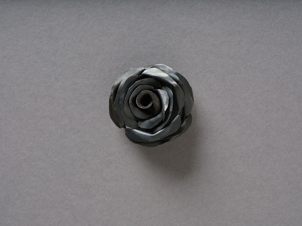 Também na parede do espaço expositivo, uma lista de palavras [imagem 5] –– em grande formato, dispostas em coluna, como um poema –– que indicam o processo, a forma das joias e a estrutura expositiva. As peças, que se destacam pelo material utilizado e pelas formas puras e orgânicas e facilmente identificáveis, foram criadas a partir da linguagem sugerida pelo próprio material e da intervenção manual intuitiva do artista [imagem 8]. Na sua maioria, sugerem insígnias [imagem 9]. No ensaio «Owner’s Manual» [Manual do Proprietário], a autora afirma que estes emblemas ou símbolos são «pequenos milagres de compressão. Eles falam com força e economia sobre ideias e compromissos partilhados, mesmo (ou especialmente) aqueles que ainda não encontraram a sua voz» [7] (Ewington,1995). Escreve também sobre os portadores destes símbolos, mais precisamente sobre o significado que as joias de Freeman têm para os seus proprietários. Ambos são apresentados no texto e nas fotografias de Patrick Reynolds. Contudo, ao contrário do que é habitual, as joias surgem de forma reservada e discreta, tal como o próprio artista se mostrou durante a visita. Os seus portadores são muitas vezes vistos ao longe na paisagem, ou noutros contextos, e as joias constituem pequenos sinais no corpo de cada um, símbolos identitários. O encontro com Freeman na Pinakothek der Moderne, no âmbito da sua exposição, foi como revisitar virtualmente o «Owner’s Manual», guiada, agora, pela voz do artista, que anteriormente ecoava na escrita de Ewington. No livro, ao apresentar-nos a sua Black Rose, a autora escreveu: «Todas as flores devem morrer. Após uma breve temporada de esplendor, as pétalas escurecem, murcham e caem, cumprindo o grande ciclo predestinado. No meio da vida, estamos na morte. […] Black Rose [imagem 10] foi criada em 1990, o ano do 150.º aniversário do Tratado de Waitangi, celebrado entre os britânicos e o povo Maori da Nova Zelândia. Trata-se de um emblema de luto, mas também um símbolo de uma nova vida.» [8] (Ewington,1995). Já o avô de Freeman usava emblemas que a sua avó lhe deixou em testamento e o artista, em 1985, reuniu essa coleção num pequeno gabinete de madeira e vidro forrado a feltro vermelho, como relíquias a que designou My Grandfather’s Jewellery [imagem 11]. Esta peça integrou a exposição Share of Sky: Emblems 1985-90 no Dowse Art Museum e, nas notas da exposição, escreveu: