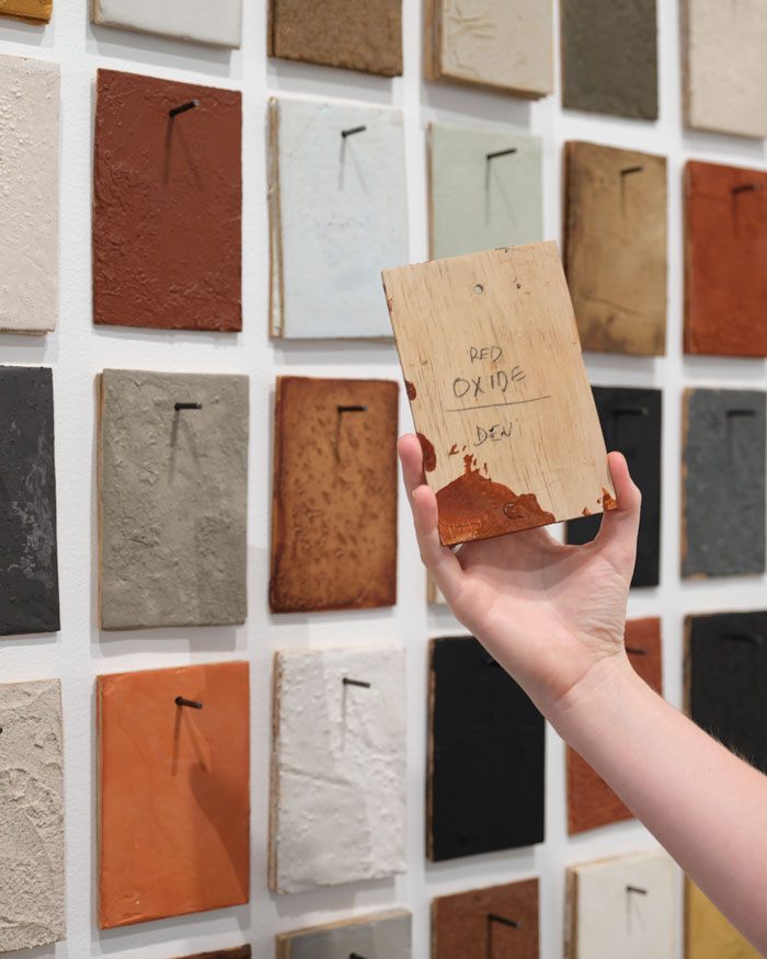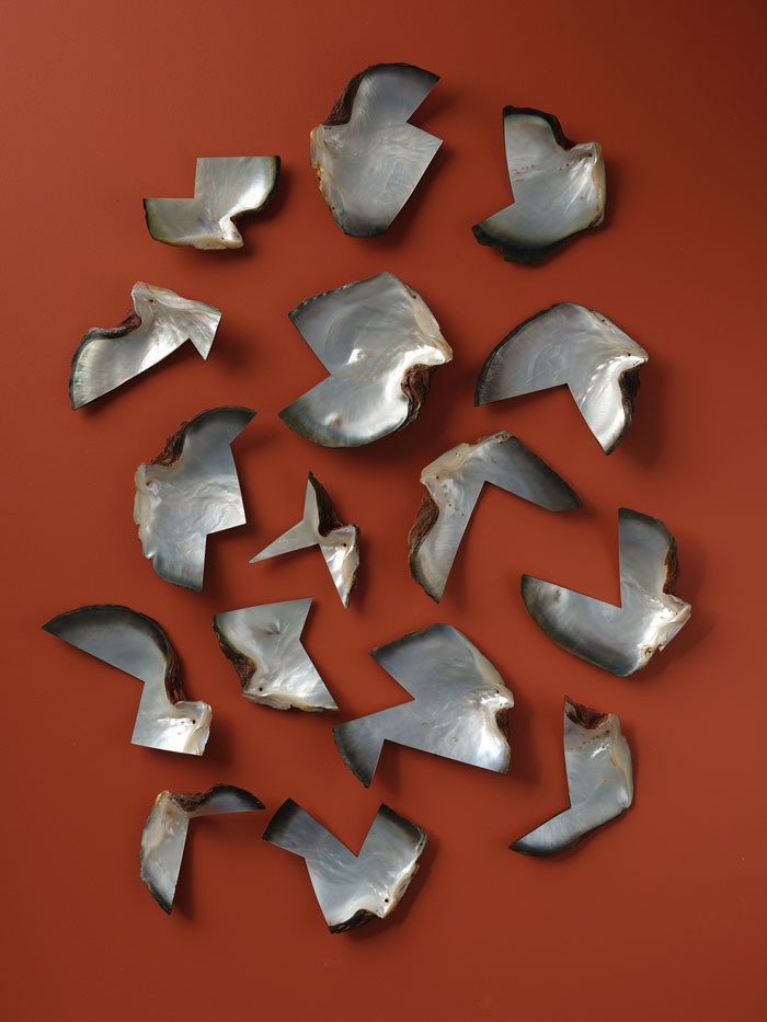 As instalações montadas na parede são uma característica da prática de Warwick Freeman. Os quatro exemplos aqui apresentados vão desde uma assamblage temática de joias em vermelho e preto [imagem 6], um grupo de quatro pendentes de grandes dimensões, até uma montagem abstrata de recortes de conchas [sobras de] outro conjunto de obras [imagem 7]. As placas em grelha de Dust [imagem 4] registam os resíduos da criação e os subprodutos dos materiais que se acumulam no estúdio — são pintadas com o pó colorido de quase todos os materiais com que Freeman trabalhou ao longo da sua carreira. (Freeman, Holscher, Paton, 2025, p. 58) [6]