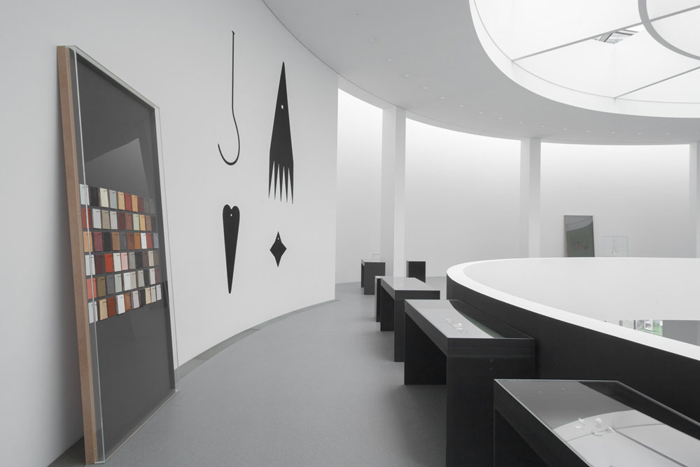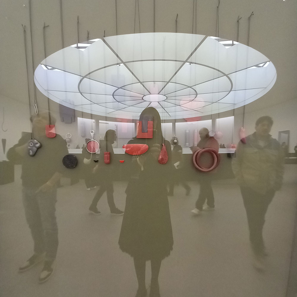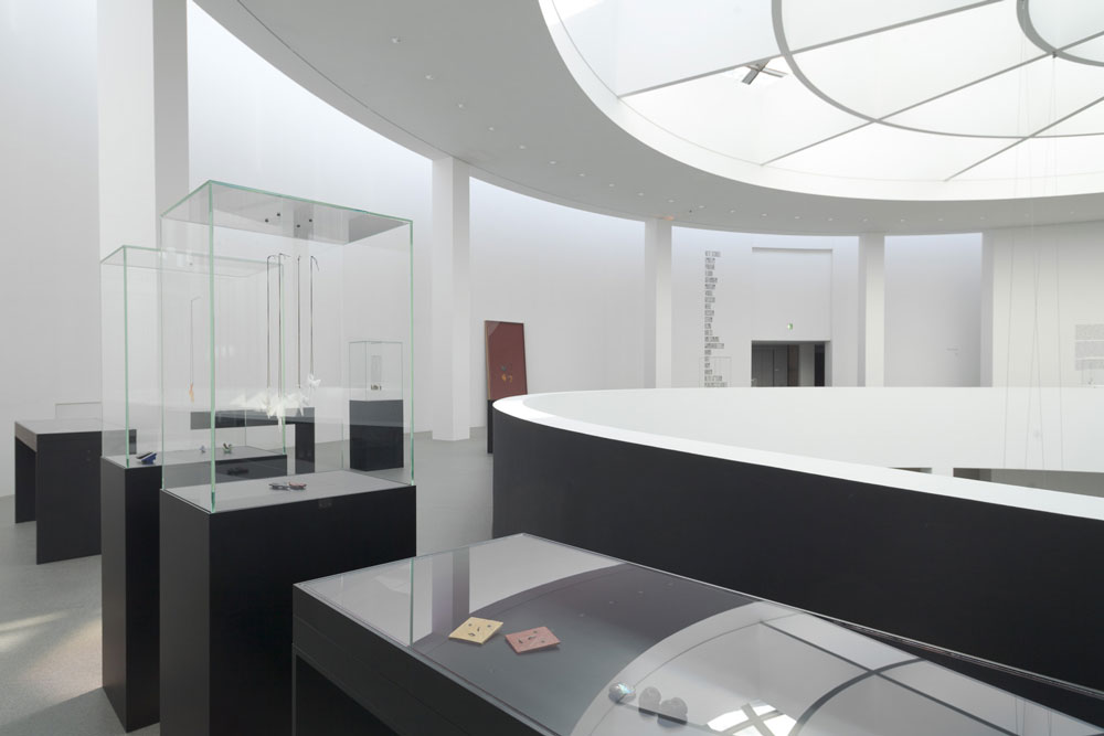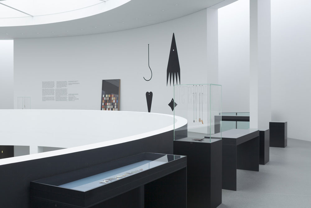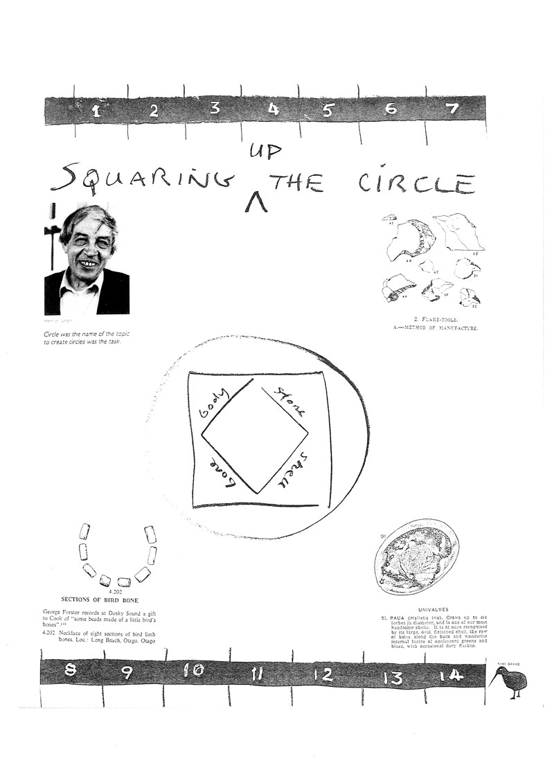 Em 2025, mais de 35 anos depois, é este desenho, «Squaring Up the Circle», que Freeman usa como ideia para o design desta exposição na Pinakothek der Modern. O círculo exterior da estrutura do edifício envolve o quadrado das vitrines, no qual está inscrito o círculo interior da rotunda [imagens 2, 3, 4, 5]. As quatro vitrines altas com molduras coloridas representam os quatro conceitos que sustentam a joalharia contemporânea da Nova Zelândia: osso, pedra, concha e corpo. (Freeman, Holscher, Paton, 2025, p. 15) [3]