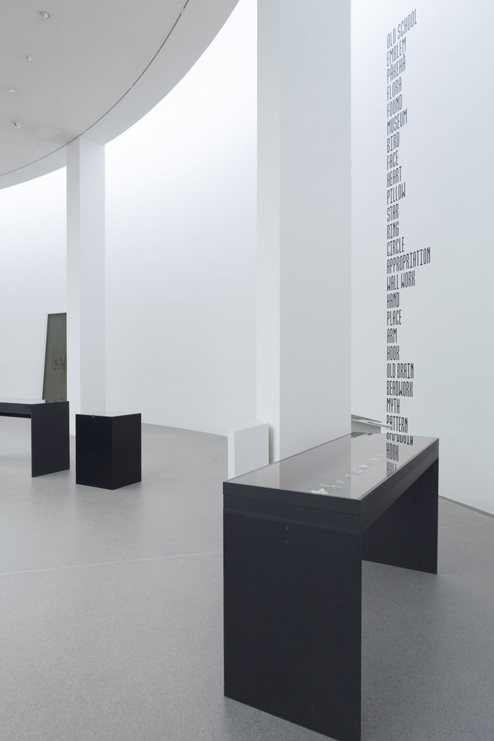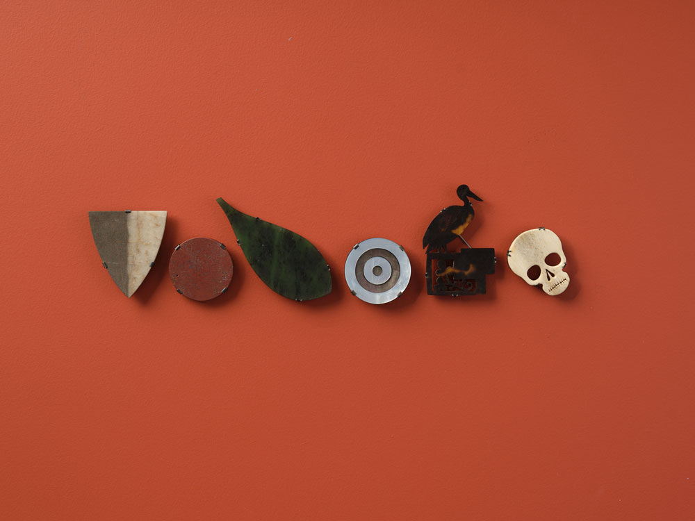 A exposição Hook Hand Heart Star não segue uma ordem cronológica e foi estruturada a partir de uma lista de vinte e quatro palavras que guiam o desenho expositivo, como já foi referido: «Old School», «Emblem», «Pakeha», «Flora», «Found», «Museum», «Bird», «Face», «Heart», «Pillow», «Star», «Ring», «Circle», «Appropriation», «Wall Work», «Hand», «Place», «Arm», «Hook», «Old Brain», «Beadwork», «Myth», «Pattern», e «Sentences» [imagem 5] Os grupos definidos pelas palavras em questão reúnem trabalhos de diversos períodos. Segundo o artista, a lista poderia incluir outras palavras, realçando a versatilidade e/ou a «ambiguidade intencional» [13] da obra (Chitham, 2025, p. 104). Os temas e as formas são recorrentes em épocas diferentes. Há repetições de símbolos nas «frases» que funcionam como um mantra [imagem 15]. O artista costuma criar, pelo menos, três variantes para cada símbolo, em épocas diferentes. Estes símbolos possuem referências afetivas, políticas, sociais e estéticas, e refletem a sua importância, tanto na tradição da sua cultura, como na forma como o artista lida com eles ao longo da sua trajetória artística. No seu texto «The Novelty of Our Own Situation», escreveu: