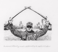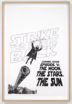 MICHAEL RAKOWITZThe worst condition is to pass under a sword which is not one’s ownTATE MODERN Bankside London SE1 9TG 22 JAN - 12 MAI 2010 Michael Rakowitz nasceu em 1973, em Great Neck Nova Iorque, mas conta já com inúmeras exposições, prémios e livros publicados. É um artista que demonstra sempre nos seus trabalhos um grande engagement político e social e as obras expostas na Level 2 Gallery da Tate Modern em Londres confirmam-no mais uma vez. A Level 2 Gallery, é uma galeria mais pequena, situada no exterior norte do edifício da Tate Modern que é comissariada pelos assistentes do comissário do museu e alberga normalmente exposições de jovens artistas internacionais menos conhecidos e mais experimentais ou ousados. O projecto que Rakowitz apresenta nesta galeria cumpre estas premissas. Centra-se no monumento Swords of Qādisiyyah em Bagdad, um arco triunfal construído em 1989 e também conhecido como Hands of Victory. Este monumento consiste em duas mãos, uma de cada lado de uma estrada, que seguram espadas que se cruzam em cima, formando um arco triunfal. Na inauguração, o convite continha a frase de onde Rakowitz tirou o título para a exposição: “The worst condition is for a person to pass under a sword that is not his own or to be forced down a road that is not willed by him.” Nos trabalhos expostos, o artista faz a ligação entre as actividades militares iraquianas durante e após o regime de Sadam Hussein e o fascínio dos seus líderes pela iconografia de Júlio Verne e da trilogia de Star Wars, passando pelo wrestling americano. Para Rakowitz o Iraque não é um país de que se ouve falar nas notícias ou sequer um país odiado como para a maior parte dos americanos. É o país de onde, em 1946, os seus avós judeus tiveram que fugir, deixando para trás todo um império construído pela família ao longo dos séculos. O seu avô chegou a Long Island e aí criou uma nova empresa de importações e exportações que fechou em 1960. Em 2004, Rakowitz reabre esta empresa e com ela tenta importar produtos que, devido ao embargo imposto pelos Estados Unidos, são impossíveis de encontrar. Abriu também um restaurante, com a ajuda da mãe, recuperando receitas típicas iraquianas. Por tudo isto, “The worst condition is to pass under a sword which is not one’s own”, é um trabalho pessoal e intímo, embora não se sinta nele grande ressentimento ou mágoa, mas sim uma salutar ironia. Logo quando se entra na galeria, Victory Arch Wallpaper mostra-nos uma parede forrada com fotografias de turistas de forma a parecer que seguram as espadas de Hands of Victory. É curioso ver que a maior parte destas fotos são de soldados americanos. Ou seja, os soldados que supostamente libertaram o Iraque do jugo dos seus ditadores, são também aqueles que usufruem e se divertem com os seus símbolos de poder. A maior parte da exposição, consiste num registo em banda desenhada que cruza histórias verdadeiras da guerra do Iraque com narrativas e personagens do Star Wars ou de wrestling. Logo no início, como forma de ilustrar este paralelismo entre o real e a ficção e os seus respectivos heróis e vilões, duas revistas Time mostram, de um lado, o título de capa de 1983, “Defending Defense”, com uma fotografia de Ronald Reagan e do outro, uma capa do mesmo ano, “Star Wars III”, mostra George Lucas ou seja, o herói de um mundo ficcionado em que sabemos exactamente quem são os bons e quem são os maus. Michael Rakowitz trabalha habitualmente sobre a cidade, criando instalações que interagem com a malha urbanística, mas sempre com forte carácter de crítica política e social ao poder instaurado e à sociedade de consumo. Em “The worst condition is to pass under a sword which is not one’s own” pretende mostrar-nos, usando alguma ironia e muito humor, que as histórias de ficção de heróis e vilões dos nossos tempos se transformaram em mitologias que moldam e condicionam os heróis e vilões reais do nosso mundo. Não será talvez o seu trabalho mais interessante ou talvez Michael Rakowitz simplesmente não seja um artista de galerias, mas é inegável a importância e actualidade do seu conteúdo. Joseph Beuys disse sobre a política “No futuro não pode ficar nenhuma área da vida, livre desse conceito”. Michael Rakowitz aplica-o.
