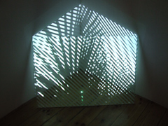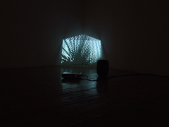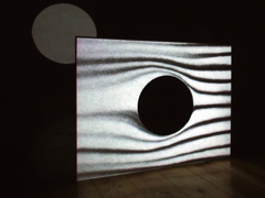 ALEXANDRE ESTRELAViagem ao MeioZDB - GALERIA ZÉ DOS BOIS Rua da Barroca, 59 1200-049 Lisboa 10 ABR - 19 JUN 2010 “Viagem ao Meio†é o tÃtulo da nova exposição individual de Alexandre Estrela e o resultado de uma série de residências concretizadas em diferentes pontos geográficos, ao longo de dois anos, com a produção da Galeria Zé dos Bois. Locais tão distintos como Timor, Bretanha ou Açores fizeram então parte do itinerário desta longa viagem, partilhada com o curador Natxo Checa, servindo também de “paisagens†para a realização de cinco instalações que constituem a presente mostra. Quem visitar a exposição há-de encontrar, logo à entrada da ZDB, colado na parede junto à bilheteira, um poster de médio formato que apresenta um desenho sob fundo branco. Cinco circunferências concêntricas, cada uma desenhada dentro da outra, formam uma moldura, que enquadra um espaço preenchido até à exaustão por uma série de outras circunferências não concêntricas, sobrepostas e a escassa distância entre si. O olhar do visitante é então estimulado pela malha densa e dinâmica sugerida pela profusão de linhas que definem o desenho e subitamente atraÃdo pelo seu centro que, deslocado, se encontra numa das suas margens. Situado na periferia do desenho, o centro introduz neste pequeno trabalho um efeito de perspectiva curva, fazendo mergulhar o olhar naquilo que parece transformar-se num túnel. Para além de actuar como imagem gráfica da exposição, este poster acaba por lançar as problemáticas que a organizam, a saber: a experiência da percepção descentrada e a dimensão escultórica ou tridimensional da imagem. Questões, aliás, que aparecem frequentemente implicadas nos trabalhos de Alexandre Estrela desde 2006, basta lembrarmo-nos de “Solar watch†(“Stargateâ€, MNAC – Museu do Chiado, 2006); “Sistema Solar†(“Radiação Solar e Forças Cósmicasâ€, Galeria Graça Brandão, 2007); “O cancro esconde-se nos cantos†(“Putting Fear in Its Placeâ€, Chiado 8, 2008) ou “Ar Curvo†(Galeria Marz, 2009). Mas se estas peças foram desenvolvidas a partir do atelier, as de “Viagem ao Meio†são a memória, como vimos, de outros espaços. Foi na Ilha de S. Miguel, que o artista encontrou o cenário para a instalação que dá nome à exposição. O Túnel das Setes Cidades foi construÃdo na década de 30 do século passado para drenar as águas da lagoa vizinha, servindo também de passagem à s pessoas que quisessem ir da freguesia das Sete Cidades até à freguesia dos Mosteiros. Mede 7 metros de profundidade e perfura as paredes do maior vulcão do Atlântico. Com a ajuda de uma equipa de vários colaboradores, Alexandre Estrela decidiu tirar partido das particularidades deste túnel/caminho para investigar as potencialidades do cruzamento entre dois sistemas mediais distintos: o filme e o vÃdeo. Tal como o Dr. Otto Lidenbrock e o jovem Axel tiveram de entrar num vulcão para viajarem até ao centro da terra, Estrela entrou no túnel com 1,700 km de pelÃcula fÃlmica, desenrolando-a de uma das suas periferias até ao centro e voltando a enrolá-la depois do trajecto cumprido. Paralelamente, toda a travessia do túnel foi registada em vÃdeo num só plano sequência que demora 2 horas, enquanto um gravador registava o som do escoamento da água. Na instalação de que fazem parte, ambos os registos são projectados em simultâneo e sobrepõem-se no mesmo ecrã. Se no inÃcio o filme queimado pela acção da luz torna a imagem vÃdeo nÃtida, deixando-nos ver o interior do túnel, à medida que avança no tempo vai tornando-a cada vez mais opaca ao ponto de quase anulá-la. Durante cerca de uma hora de projecção, as imagens que percepcionamos transformam-se num monocromático denso. No entanto, existe uma mancha branca brilhante em constante movimento que nunca é apagada pelo filme e que sabota a bidimensionalidade das imagens ao som da água a ser escoada. Esse ponto branco é a luz ao fundo do túnel e a perspectiva da imagem vÃdeo que devolve ao observador mais resistente a saÃda para outro espaço. De facto, “Viagem ao meio†reclama um observador resistente não só porque tem a duração de uma longa-metragem, mas porque lhe dedica uma posição particular e rara, sobretudo se pensarmos nas convenções das salas de projecção. Ao invés de posicionar a plateia de frente para o ecrã, Estrela desloca-a 90º, pelo que o público passa a visionar o filme/vÃdeo a partir desse ângulo e a encontrar diante de si os dispositivos de projecção de cada media. Este extraordinário conflito medial conduz-nos a três vÃdeo instalações apresentadas em salas individuais no primeiro piso, mas com ligação entre si. A primeira intitula-se “Le Moiretâ€, foi filmada na Bretanha e consiste num vÃdeo que regista o movimento aleatório das folhas de uma pequena palmeira desencadeado pelo vento e cujo som provém de uma só coluna, disposta no chão. A projecção é feita sobre um ecrã de vidro que está encostado a um canto da sala. Enquanto a superfÃcie transparente faz trespassar a imagem, o canto devolve à imagem projectada dois planos (as duas paredes) e dois pontos de fuga distintos. Ora as especificidades de ambos os dispositivos de apresentação, conferem à imagem uma sugestão de materialidade escultórica. No entanto, a este efeito óptico virtual Estrela junta um outro, ao sobrepor a imagem de folhas de uma palmeira sobre um ecrã serigrafado com bandas foscas, piscando o olho ao efeito de Moiret tão trabalhado pela Op Art. Assim como em “Le Moiretâ€, também em “Hydraâ€, voltamos a percepcionar visualmente o som. Acontece que o fenómeno natural do vento vê-se substituÃdo aqui por um espectro sonoro de um teste de hidrodinâmica em torno de um centro vazio. Cada linha que atravessa a imagem deste vÃdeo representa uma frequência de som que, por sua vez, cartografa o trajecto percorrido pelo fl