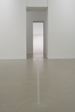 ARMANDA DUARTETrês degraus, uma lageCHIADO 8 ARTE CONTEMPORÂNEA Largo do Chiado, n.º8 1249-125 Lisboa 01 OUT - 23 DEZ 2010 A Chiado 8 tem tido curadoria de Bruno Marchand e apresentado um programa expositivo por vezes bastante arriscado e difícil. É o caso de Armanda Duarte, que ocupa todo o espaço disponível da galeria, mesmo se o deixa vazio. Porque o vazio tal como o cheio, tem matéria dentro, tem volumetria, cor e cheiro, como nos refere Bruno Zevi: “O ritmo dilatado ou contraído, cerrado ou articulado, nítido ou complexo, elementar ou misterioso e transitório de um espaço (...) constitui a consequência emergente da fantasia arquitectónica.” (1) Nos trabalhos de Armanda Duarte estão diluídas as fronteiras entre escultura, arquitectura e instalação, e há geralmente uma relação quase dialéctica com o espaço que os acolhe. Em “Três degraus, uma lage”, Armanda questiona o espaço e a nossa percepção espacial, a matéria e os materiais, e novamente a nossa percepção deles. Convoca também questões de escala e de tempo. A exposição está dividida em duas obras, mas cada uma delas contém várias peças. “Três degraus” (2010) contém “Sopro livre”, que podemos ver quando entramos. Mas também podemos não ver se estivermos menos atentos. Uma pequena estrutura quase invisível feita de esferas de vidro transparente com 48 cm de altura, ergue-se do pavimento, frágil e leve como bolas de sabão sopradas uma a seguir à outra. Este objecto artístico, sem dúvida produto da mão humana, não deixa ao mesmo tempo de mimetizar um caule de uma qualquer flor, a sua fragilidade, elegância e beleza. Atravessamos então uma sala vazia que nos irá levar à segunda peça. Esta sala funciona como um rito de passagem, quase como se nos limpássemos da primeira peça para poder apreciar a segunda. Ao mesmo tempo, a sala vazia obriga-nos a reconhecer a mutabilidade de um espaço quando lá pomos um objecto. Quem não conheça o espaço da galeria pode não se aperceber imediatamente de qual é a alteração introduzida por Armanda Duarte. “A arquitectura sempre foi o protótipo de uma obra de arte cuja recepção foi distraída e colectiva” (2). “Ângulo de repouso” é um plano inclinado que une a parede ao chão, uma espécie de rampa. Este plano parece-nos tão sólido como a própria parede, mas se nos aproximarmos (e teremos de nos aproximar mesmo muito) distinguimos que este plano é composto por areia muito fina e que a solidez e resistência se esvaem ao mais pequeno toque. Um material que parece perene e robusto é afinal inconstante e frágil e exige-nos delicadeza. Deverá a obra de arte ser temporária e transitória? Não será afinal sempre efémera, porque é sempre destrutível? “Uma lage” é uma obra constituída por outras três e encontra-se num espaço expositivo completamente diferente do que alberga “Três degraus”, menos hermético e anónimo. “Coisas redondas e tangentes” é um conjunto de objectos reunidos numa lógica de readymade que vão desde bolachas a elásticos delimitados por um mosaico do pavimento, e que passaram pelas mãos da artista antes e durante a montagem da exposição. “Desenho intermédio” é uma espécie de inventário desses objectos, com todas as suas características físicas descritas como se fosse um catálogo técnico. A obra descodifica também as formas gráficas que a artista lhes atribui e que vemos em “Ao nível dos olhos”. Esta intervenção remete-nos para os antigos frisos romanos que ao longo da parede e à altura dos olhos nos definem o espaço e a altura do plano vertical desta sala. Sem dúvida que “Três degraus” acaba por ser uma peça mais impactante porque convoca uma alteração espacial muito maior e nos permite questionar de modo mais aprofundado e sensitivo o espaço que nos rodeia e a imponderabilidade da matéria. Há também todo um jogo de equações matemáticas que Bruno Marchand explica de forma muito clara no catálogo da exposição e que intuímos quase involuntariamente quando nos encontramos na Chiado 8. No fundo, Armanda Duarte introduz-nos nas questões espaciais e de percepção que convoca através de um processo de redução fenomenológica que nos permite chegar a uma essência do que é o espaço. NOTAS (1) ZEVI, Bruno, Architectura in Nuce: Uma Definição de Arquitectura, Lisboa, Edições 70, 1979, p.51 (2) BENJAMIN, Walter, “A obra de Arte na Era da sua Reprodutibilidade Técnica” in Sobre Arte, Técnica, Linguagem e Política, Lisboa, Relógio D’Água Editores, 1992, p. 109