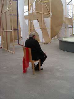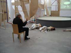 JOÃO VIEIRAABÊCÊPAVILHÃO CENTRO DE PORTUGAL Av. da Lousã 3030-767 Coimbra 20 MAI - 16 JUL 2006 Abandonemos por um momento a preocupação de identificar, de reconhecer, para que a forma que também está em nós se descubra João Vieira, 1979 Dando continuidade ao protocolo que a Fundação de Serralves estabeleceu com a Câmara Municipal de Coimbra, inaugurou no dia 20 de Maio no Pavilhão Centro de Portugal a exposição “ABÊCÊ” de João Vieira. Artista de importância essencial na arte portuguesa contemporânea, articulou de um modo idiossincrático, desde o início da sua carreira nos finais de 50, inícios de 60, a pintura e a escrita, criando espaço para a afirmação de um novo paradigma do objecto artístico. A esta relação de interacção entre texto e pintura não foram estranhos os laços de amizade e discussão que cedo estabeleceu com poetas e escritores – Herberto Helder, Helder Macedo, entre outros. Ideais políticos e estéticos uniram estes autores, cujo contributo para a afirmação da singularidade e do experimentalismo artístico foi fundamental. Para João Vieira a relação entre o corpo do texto e o corpo da pintura não é apenas textual mas iconológica. Mais do que o significado semiótico, interessa-lhe a forma. Progressivamente, durante as décadas seguintes, letra e pintura conquistaram espaço e afirmaram-se simultaneamente como escultura e o contexto de acção propício ao desenrolar de eventos. Neste experimentalismo, os novos materiais industriais (poliuretanos, espumas flexíveis, tinta de automóvel) desempenham um papel fulcral. Exemplo deste processo permanente de construção formal e técnica é o projecto “M.A.R. – 3 letras (7 elementos)”. Pensado em 1970 como uma intervenção pública, não teve até hoje concretização na dimensão em que foi projectado. Foi, no entanto, apresentado em Serralves em 2002 e agora reencenado no exterior do P.C.P. numa escala inferior à inicial. Foram criadas três bóias em poliuretano fibrado, pintadas com tinta de automóvel (no projecto inicial mediam cerca de dez metros) que configuram as três letras que ludicamente ordenadas constituem a palavra “mar”. As enormes letras foram lançadas como dados num tanque especialmente concebido para o efeito. A este projecto não são estranhas as referências à história marítima das viagens míticas dos descobrimentos portugueses e à relação íntima que esta aventura engendrou com a epopeia literária nacional. Ao longo da sua produção, outros projectos revelaram esta estreita relação com a História. É o caso do “Painel do Infante” (1987) integrado na recriação que João Vieira fez dos “Painéis de S. Vicente de Fora”. No interior do Pavilhão dois espaços distintos caracterizam a exposição. No primeiro piso, em duas salas diversas, dois vídeos. O primeiro é uma compilação de três “acções-espectáculo: Expansões” (1971), “Incorpóreo I” (1972) e “Mamografia” (1981). O segundo é o documentário realizado em 2003 por Paulo Cancela e intitulado “Pinto Quadros por Letras”. Precursor do happening e da performance em Portugal, o “Espírito da Letra”, realizado em 1970 na Galeria Judite Dacruz, é o primeiro exemplo de uma performance-destruição levada a cabo por João Vieira. A esta exposição, referenciada no documentário, e que o artista denominou exposição dura, contrapôs, no ano seguinte, na mesma galeria, uma exposição mole – “Expansões”. Letras do Alfabeto executadas em espuma flexível foram manipuladas pelo público numa acção-espectáculo onde o denominador comum foi sempre o carácter lúdico das acções e a proposta de interacção com o espectador de quem se esperava uma participação activa em todo o processo. Em “Incorpóreo I”, um corpo nu feminino foi colocado dentro de um sarcófago de poliuretano, numa clara analogia ao nascimento de Vénus. Sobre esta intervenção disse o artista: “Não podendo matar uma pessoa, por causa da moral, projectei poliuretano (rígido desta vez) sobre duas metades, frente e costas, de um manequim plástico. Obtive assim uma espécie de caixa, ou concha, ou casca, no interior da qual era visível o interior do manequim, e cujo exterior deformava o ser “humano” do interior”(1). Finalmente, em “Mamografias” João Vieira projectou outra provocação à história da arte. Criou em espuma várias representações dos seios da Vénus de Milo, e com eles, várias caixas onde evocou os nomes de Man Ray e Duchamp. No mesmo espaço, um tapete de seios convidava o espectador a passear-se e a provar as maçãs que nele foram espalhadas, ao mesmo tempo que nas paredes adjacentes eram projectadas termografias que indirectamente propunham um conceito distinto de retrato. Nas obras mais recentes, João Vieira alia as suas pesquisas anteriores – onde as letras e a pintura enquanto signo e significante se assumem como o centro do intenso experimentalismo que sempre caracterizou a sua produção – às tradições populares (2). “ABÊCÊ” (2006), instalação e performance especialmente concebida para este espaço, e que ocupa todo o piso térreo do Pavilhão, insere-se precisamente no universo etnográfico das tradições populares infantis. A instalação é composta por uma gigantesca e labiríntica estrutura de madeira onde foram afixadas – depois de recortadas sobre papel – todas as letras do alfabeto. Ao centro, abre-se uma clareira onde foi colocado um poço com celulose. A simbologia da floresta e do ciclo de vida do papel associam-se à própria nomenclatura do projecto – ABÊCÊ - muitas vezes associado não só à aprendizagem da cartilha mas também à noção abreviada de biografia. No dia da inauguração, esta instalação serviu de cenografia a uma performance onde o próprio artista assumiu a direcção de uma cartilha de jogos (da macaca, o salto do elástico, o saltar à corda, da apanhada, a cabra ceg