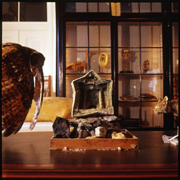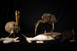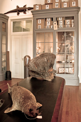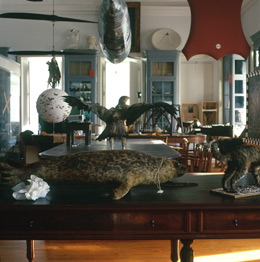 PEDRO PORTUGALGabinete da Politécnica – O Importantário EstetoscópicoMUSEU NACIONAL DE HISTÓRIA NATURAL E DA CIÊNCIA Rua Escola Politécnica, 58 1250-102 Lisboa 18 MAI - 18 DEZ 2011 Só a arte sobrevive a tudo, na sombra ou em gradações O que acontece quando a Natureza deixa de ser objecto de contemplação e representação artísticas passando a ocupar o protagonismo do objecto contemplado? Animais embalsamados, insectos que perpetuam a sua forma dentro de frascos de formol, esqueletos, conchas colossais… o Passado fossilizado e minuciosamente arquivado em vitrinas. Não falamos já de obras de arte? O museu será apenas um arquivo universal onde guardamos o que findou, o que perdeu a vida? Ou será o espaço onde os objectos, através do nosso olhar, ganham uma nova vida? A problemática do estabelecimento de fronteiras entre arte, história natural e ciência, aliado a um questionamento do “arquivo universal” enquanto espaço de ocultação/exibição de objectos, tem constituído nas últimas décadas tema de reflexão por parte de artistas como Mark Dion, que recorre a noções científicas na criação das suas obras, explorando o potencial estético dessas mesmas noções. Exposições que provocam no espectador uma sensação de retorno aos gabinetes de curiosidades, também denominados de “quartos das maravilhas” que, nos séculos XVI e XVII, expunham e arquivavam uma multiplicidade de objectos de enorme raridade para a época, oriundos dos mundos animal, vegetal e animal, bem como quadros e pinturas. Os gabinetes de curiosidades constituem os precursores e antecessores do actual espaço museológico, sendo os seus objectos apenas no século XVIII transferidos para museus de arte ou de história natural, momento em que se delineia a fronteira entre objecto artístico e objecto natural ou científico. Voltando ao Presente, podemos constatar a permanente oscilação e questionamento dessas fronteiras, pois que, perante a evolução da conceptualização estética, parecem deixar de fazer sentido. Deste modo, objectos centenários, cujo valor parecia estar apenas na sua longevidade, são recuperados, adquirindo uma grandeza que provém de uma re-contextualização espácio-temporal e conceptual, na medida em que agora não se tratam já de raridades exóticas e inacessíveis, mas de objectos escultóricos que parecem encerrar em si uma marca da vitalidade que em tempos lhes pertenceu, e é aí que está encerrada toda a sua beleza, na mescla de vida e morte que conciliam e conservam, como se o Tempo, por muito que lhes tenha dado uma nova forma – a morte -, não lhes consegue retirar o vestígio do que já foram: vida. O Importantário Estetoscópico, da autoria de Pedro Portugal, leva-nos a colocar questões em torno do modo como o espectador se relaciona com as obras expostas num espaço, desenvolvendo uma crítica sociológica ao museu enquanto instituição que, ao invés de dar a ver, parece por vezes armazenar objectos, colocando-os em “cofres” poeirentos onde permanecem esquecidos e ocultos à comunidade. O Gabinete da Politécnica parece então, ao dar uma peculiar visibilidade a peças resultantes de processos de investigação científico-natural, ressuscitar essas mesmas peças, conferindo-lhes uma diferente natureza, pois que agora as contemplamos como se de obras de arte se tratassem. E se assim o é, haverá alguma legitimidade na trivial distinção entre obras de arte e obras da Natureza? O homem é o autor da arte ou apenas o seu juiz? Pedro Portugal fez uma selecção de peças pertencentes ao Museu de História Natural e, transformando algumas e dispondo-as estrategicamente numa sala, criou uma obra que encerra uma totalidade que nos coloca num espaço onde o tempo parece cessar. Objectos pertencentes a um tempo pretérito, animais embalsamados, insectos dentro de frascos, peles penduradas dentro de vitrinas, numa estrutura de biblioteca onde uma grande mesa central está rodeada de armários, se cruza com a actualidade da nossa presença viva no interior do espaço e com o Futuro do que parece estar ainda por descobrir para incluir nos espaços por preencher. I. A Natureza: eterna criadora de obras de Arte Antes de Duchamp ter transposto um mero urinol para o território artístico, ao dar-lhe um nova designação e uma marca autoral, poderíamos dizer que uma obra de arte se definia pelo processo criativo humano que lhe era intrínseco. O ready-made representou uma ruptura conceptual no âmbito da estética, “desumanizando” um pouco a arte no sentido em que esta se veio progressivamente a emancipar do acto de produção humano a que, no seio de uma classificação clássica, correspondia. Assim, as obras que a Natureza produz poderão, através do mesmo processo de classificação e autoria artísticos, ser abordadas enquanto obras de arte, o que permite ao espectador contemplá-las sob uma perspectiva totalmente antagónica à abordagem puramente científica que busca apenas um conhecimento prático ou taxionómico das peças. “É neste sentido que o Gabinete da Politécnica deve ser entendido. É a constatação do all-ready-made que é a artephysis, ou seja, da inseparabilidade entre processos da arte e os processos da natureza” [1] II. A Natureza Morta desemoldurada Ao entrarmos no Gabinete da Politécnica temos a sensação de estar dentro de uma pintura de naturezas-mortas. Numa mesa, sobre um fundo de pano preto podemos contemplar uma caveira sob uma redoma de vidro e uma ave embalsamada, o que nos remete de imediato para as obras Vanitas, excepto que agora podemos tocar essa fatalidade e angústia da mortalidade inerente à vida, uma vez que ela não é tinta sobre uma tela, ela invade o espaço, o nosso espaço. A intensidade da experiência estética está aí, pois que ao invadir esse espaço quebramos o silêncio e a quietude da morte – uma estaticidade secular que contrasta com a vida, com o movimento, com o som 