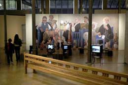 COLECTIVARepresentaciones árabes contemporáneas. La ecuación Iraqui.FUNDACIÓ ANTONI TÀPIES Carrer d'Aragó, 255 08007 Barcelona, España 28 ABR - 25 JUN 2006 Está instalada na grande sala de exposições temporárias da Fundação Tàpies a terceira parte do projecto “Representaciones árabes contemporâneas”, um ambicioso programa de reflexão interdisciplinar sobre as especificidades e os contextos da produção estética contemporânea em diversos países árabes. Iniciado pela própria Fundação em 1998, com direcção da comissária Catherine David, o projecto “Representaciones árabes contemporâneas” está concebido como plataforma/observatório de diferentes realidades locais e reporta os tecidos singulares da criação e reflexão estética contemporânea, e sua ligação com a criação moderna, igualmente obscura para o mundo ocidental. Mais do que anunciar novidades, este projecto a longo prazo cartografa e, nas palavras de David, visa “um conhecimento mais preciso do que ocorre actualmente em várias zonas do mundo árabe, equacionar as complexas dimensões do feito estético na relação com as situações sociais e políticas, e ajudar a pensar com maior facilidade o papel que desempenham hoje as práticas culturais nos nossos próprios países”. Materializa-se através do levantamento, compilação e selecção rigorosa de participações artistas e materiais audiovisuais diversos, plasmados na criação de pequenos centros de documentação, na publicação de livros e na exposição pública do material recolhido. “La ecuación Iraqui” é a terceira desde o início do projecto, segue o mesmo princípio metodológico que as duas primeiras partes - respectivamente sobre Beirut-Líbano e Cairo-Egipto – e está dedicada à análise e documentação do Iraque, e não apenas de Bagdad. “La ecuación Iraqui” não é uma exposição de arte ou de artistas Iraquianos, mas antes um exercício complexo de reflexão sobre o poder da imagem na representação da sociedade iraquiana contemporânea, durante e após, as agitadas ocupações do seu território, e sobre condições da produção estética iraquiana, gerada maioritariamente do exílio na Europa. A exposição configura uma grande praça, central, à qual se acede através de um percurso por imagens da história do Iraque Moderno. Um diaporama seleccionado por Yto Barrada no arquivo “Arab Image Foundation”, Líbano, recupera imagens do Iraque moderno, da sociedade burguesa, dos edifícios “estilo internacional” e da prosperidade de uma sociedade evoluída, que as imagens televisivas exclusivas do caos e da destruição provocada pela guerra ocultaram. Dominando a imaginável praça, “Democracy” (2005) um enorme banco de madeira, de Talal Refit, é uma interpretação ampliada dos bancos tradicionais da paisagem urbana de Bagdad; ocupa o espaço central da galeria e convida ao repouso, articulando a imaterialidade da informação recolhida no centro de documentação, com a presença física do corpo doobservador, aludindo com forte fisicalidade à violência que é ainda infligida ao tecido cultural do Iraque. O “Democracy” é a única peça exposta não reprodutível, todo o demais emprega medias tecnológicos. O espaço central é uma plataforma onde se estabelecem diversos diálogos: uma bateria de televisões conversa com o visitante, apresentando elementos da diáspora iraquiana. “An Artist with a View” é um conjunto de entrevistas/documetários realizados por Sawsan Darwaza, documentando os percursos, produção artística, acesso a referências Ocidentais, saída do Iraque e regresso, nos casos em que foi possível, de artistas, músicos, arquitectos, escritores, e outras individualidades da vida cultural do Iraque. Coexistem com os trabalhos artísticos, conteúdos retirados de meios de comunicação da actualidade do mundo Árabe, tecendo diferentes discursos que contextualizam os trabalhos: excertos de noticiários de cinco emissoras de televisão, oferecem imagens e versões antagónicas dos factos (Al-Jasera, Al-Forat Network, Al-Arabiya, Al-Sharqiya, Al-Iraqiya), projecções multimédia de directórios de sites e blogs independentes sobre os conflitos e a recuperação do Iraque, e ainda livros e catálogos sobre a ocupação, a sociedade, a política e a economia do petróleo. Um pequeno auditório projecta curtos documentários concebidos e produzidos para a BBC pelo blogger (arquitecto) Salam Pax, a partir dos conteúdos tratados no blog “Where is Raed?” para a BBC e o Channel 4 News, retratando a tortura e desaparecimentos nos tempos de Sadam Hussein, a guerra e a lenta recuperação de uma nação sem organização nem economia própria. Uma excepcional imagem mural, de Faisel Laibi, “Coffee Shop in Baghdad”, ampliação digital de uma pintura consagrada, de 1984, retrata uma cena quotidiana num café, onde convivem militares, vendedores, crianças, consultando jornais e cartas estrangeiras e consumindo produtos tradicionais, indiciando a importância da imprensa no a dia-a-dia do Iraque, e articulando os elementos da exposição. A coexistência da documentação e dos trabalhos artísticos expostos, através de técnicas reprodutíveis e multiplicáveis, contextualiza as dificuldades de uma sociedade em reconstrução lenta, sem economia alternativa ao petróleo, com conflitos internos e na luta diária pela subsistência. As condições de grande dificuldade de conservação do património (recordemos o saque do espólio mesopotâmio), impõe-se à produção estética, comprometida com questões fundamentais da sociedade iraquiana, conquanto, aqui, representada por actores da diáspora. “Representaciones árabes contemporáneas. La ecuación Iraqui” é uma exposição que transforma a neutralidade da galeria, propondo um ambiente de grande informalidade, como noutros projectos desta comissária, convidando à consulta, visionamento e manus