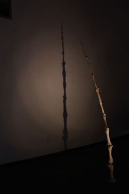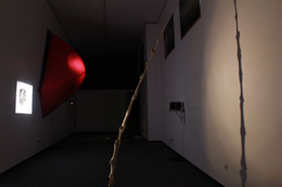 ANDRÉ TRINDADEGoing nowhere and getting there3 + 1 ARTE CONTEMPORÂNEA Largo Hintze Ribeiro 2E-F 1250 – 122 Lisboa, Portugal 24 FEV - 07 ABR 2012 Let there be light A atual exposição de André Trindade surge como um culminar das problemáticas conceptuais que marcam o percurso artístico do autor. Um trabalho de cariz arqueológico, mediante o qual nos é sempre devolvida uma abordagem da espacialidade muito própria, convoca um pensar os objetos e os lugares enquanto extrapolação metafórica para domínios sempre humanos, demasiado humanos. Uma arqueologia da essência humana converte-se, através das obras expostas, numa revelação dos mais recônditos abismos de uma existência errante. O osso é a última camada. O artista assume aqui a intencionalidade de ir, sem preâmbulos, ao núcleo conceptual das questões a que se entrega. É osso após osso que vemos erigida a primeira peça, a “coluna vertebral” de um colosso, numa verticalidade que anuncia a queda, mas cuja sombra dita uma altiva perfeição. A debilidade e fragilidade presentes na obra contradizem uma ânsia de ascensão pela verticalidade, a mesma que sempre nos comove nas esculturas de Alberto Giacometti, sempre obstinadas em chegar mais alto. Uma composição de ossos dá forma a um rosto que, aliado ao célebre diálogo de Doolitle com a bomba do filme de Carpenter Dark Star (1974) parece formar um díptico objeto/palavra. Um retorno a um momento primordial parece ditar o acaso que constitui o facto de tudo ser como é, e não de outro modo. O modo como os ossos estão articulados sugere uma ossatura humana, no entanto, são apenas fragmentos, longe de ser aquilo de que realmente somos feitos. O díptico é iluminado por uma ruidosa projeção de luz, que nos remete para a ficcionalidade do que está representado. E uma consciência aguda da solidão que é a perceção do ser no mundo. “And in addition to the darkness there was also me. And I moved upon the face of the darkness. (…) And I saw that I was alone.” [1], lemos no excerto, refletindo este um pensamento fenomenológico através de um diálogo quase platónico. A perceção do isolamento humano está expressa de um modo mais evidente na obra que se segue: uma tenda armada na parede da sala, iluminada no interior, sugerindo que está habitada. A tenda, sendo um espaço solitário, é-lhe intrínseca uma constante mobilidade. O modo como a tenda está exposta representa um desenraizamento total do mundo, pois que nem a gravidade aqui existe – é lugar de um homem só, e move-se com ele, pois que não somos mais que o corpo que habitamos, e o esqueleto é a nossa eterna morada. E somos por fim devolvidos à gravidade e à materialidade rochosa da Terra. O não-humano que nos é tão próximo, pois que a pedra está para a Natureza como o osso está para o Homem. Uma pedra obsidiana (vidro vulcânico) sobre um quadrado negro encerra a exposição. Também a pedra, na sua presença inexorável, parece conhecer o isolamento, e um foco de luz que ilumina a obra cria uma sombra na parede na qual o quadrado preto que serve de base à pedra se torna branco, como que num processo de revelação. Mais uma vez parece ser a luz, através da sombra que desenha, a causa do desvelamento: o duplo que a sombra cria parece revelar mais do objeto do que ele próprio, como que pedindo para o olharmos mais atentamente. Esse é o fio condutor de toda a exposição: trazer a verdade à luz; iluminar as trevas para que, no fim, possamos ver o que se esconde, e aceitá-lo, simplesmente porque é a verdade. NOTAS [1] Excerto de Dark Star (1974) de John Carpenter.