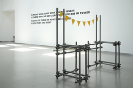 COLETIVAF for FREEDOMGALERIA FILOMENA SOARES Rua da Manutenção, 80 1900-321 Lisboa 05 JUN - 08 SET 2012 F for FREEDOM é a mais recente proposta expositiva do espaço da Galeria Filomena Soares, em Lisboa. F de Freedom, F de Fake, (evocando o ensaio/documentário de Orson Welles, de 1973) e de “várias palavras famosas (em inglês ou português), cuja primeira letra é um ‘F’.â€[1] É neste tom provocatório que Alexandre Melo introduz a exposição. No sucinto manifesto de F for FREEDOM, o curador refere que esta não é uma exposição que pretenda vender ou impor uma noção de liberdade ou que a pretenda confinar a uma acepção puramente polÃtica ou social, apesar de a envolver. A liberdade é, segundo Melo, parte intrÃnseca da produção artÃstica. Tal como refere no seu texto, esta mostra centra-se na “diversidade das práticas, métodos e materiais de cada artista. Choque de perspetivas e multiplicação de possibilidades de interpretação.†[2] Numa reunião escandinava, artistas dinamarqueses, noruegueses e suecos apresentam o seu trabalho sob a insÃgnia da “Liberdadeâ€. Nas circunstâncias em que Portugal se encontra, esta palavra, surja em que contexto for, ganha proporções e expectativas que, por vezes, correm o risco de ser desmesuradas. De imediato, o nome da dupla Elmgreen & Dragset (1961, Dinamarca; 1968, Noruega), cuja identidade, vincada e sobejamente conhecida pelo mundo fora, ajuda a criar uma imagem de comprometimento polÃtico, cultural e social, de contestação e, porque não, de ativismo para esta exposição. É de louvar a diretriz central da proposta: trazer alguns artistas que não estão na linha da frente do nosso universo de cauda da Europa, alargando horizontes e abrindo mercados. É de realçar a força e o cariz interventivo – diria até – de militância da primeira sala onde, frente a frente, Elmgreen & Dragset e Gardar Eide Einardsson (1976, Noruega) lançam os dados e introduzem a exposição. Em letras garrafais pode-se ler “1) Those who agree with you are insane/ 2) Those who do not agree with you are in power. 1) Some of those in power are insane /2) And they are rightâ€. Como clara cabeça de cartaz, a dupla Elmgreen & Dragset carrega o peso da temática e da exposição à s costas. Há uma tentativa, por parte do curador, de partilha desse peso com Einarsson, mas a forma como as suas peças se dispersam pelas duas salas faz com que a força do seu statement se perca entre paredes. Elmgreen & Dragset são representados por três imagens de grande formato, algumas das quais fizeram recentemente parte da exposição Amigos, na Galeria Helga de Alvear, em Madrid. Em Amigos, parte da série era apresentada num contexto singular, uma apresentação de um ambiente, um espaço essencialmente cénico, que evocava uma sauna/balneário gay, aprofundando as narrativas e o discurso da dupla aquando da sua participação na Bienal de Veneza. Em F for FREEDOM, apesar da distância e da descontextualização, mantém-se o discurso sobre o corpo masculino, sobre o universo gay, sobre estereótipos e clichés instituÃdos, indissociáveis da dupla, que agora surge em confronto com o trabalho in your face de Einarsson, artista definido pela Interview como um dos mais mal amados artistas emergentes, na Noruega. Não é o que se verifica fora do seu paÃs, onde tem vindo a afirmar-se e a construir um percurso sólido. A viver em Nova Iorque, Einarsson ganha um vocabulário muito próximo das culturas ditas marginais urbanas, no entanto, os seus trabalhos não são apenas puros atos de rebeldia, são reflexões acerca dos limites da transgressão, dos limites da liberdade. O trabalho de Einarsson centra-se no questionar das estruturas e do sistema, num jogo permanente entre o desafio à s autoridades e a afirmação do poder. Einarsson é apresentado em Lisboa com quatro peças que poderão não ter a leitura que tiveram na sua recente mostra itinerante Power has a fragrance (tÃtulo retirado da música dos Death in June) sobretudo devido ao facto de se tratar de uma coletiva e à dispersão espacial a que são sujeitas. Ao entrar na segunda sala, continua-se na presença de Einarsson, agora com Lagomarsino, Rolf Nowotny e Alexander Tovborg em conferência. Runo Lagomarsino é apresentado com Untitled (Extended Arguments) , de 2005, que necessitava de um espaço com menos luz para ser apresentado. É uma peça que explora, através de um momento especÃfico vivido no campeonato do mundo de 1973 no Chile, a estreita relação entre futebol e polÃtica. Uma relação que sempre foi relevante, mas oficialmente negada, pois sendo um desporto de massas – um jogo de futebol é um espaço privilegiado para celebrar a amizade entre as nações participantes – não fará sentido criar outro tipo de expectativas, particularmente de cariz nacionalista ou polÃtico. Contra estes argumentos, muitos factos se apresentam: esta exposição foi inaugurada em ano de campeonato da Europa, e, este texto, escrito depois das seleções grega e alemã terem jogado, naquele que foi tido como o jogo que poderia dar lugar ao derradeiro grito de revolta grego, uma espécie de exorcismo da extrema tensão polÃtica entre os dois paÃses. A Grécia acabou por ser esmagada pela poderosa seleção alemã, numa réplica da vida polÃtica atual. No entanto, a possibilidade de ainda se poder vir a assistir a uma Alemanha derrotada é um sonho de muitos dos que vivem sob o domÃnio do triunvirato conhecido como troika. Através desta peça, Lagomarsino faz-nos reviver, vezes sem conta, o momento em que a seleção chilena, que “jogou†sem adversário, devido ao boicote da seleção da União Soviética (consequência do golpe de estado que depôs Salvador Allende), marcar um golo. Golo este que passa a ser um sÃmbolo do fim da democracia no Chile e a “rendição†dos jogadores e, consequentemente, do povo chileno ao regime militar de Pinochet. Rolf Nowot