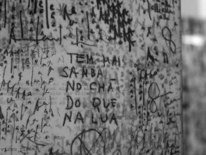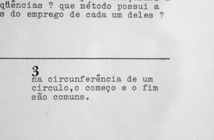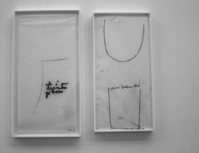 MIRA SCHENDELMira SchendelMUSEU DE SERRALVES - MUSEU DE ARTE CONTEMPORÂNEA Rua D. João de Castro, 210 4150-417 Porto 01 MAR - 24 JUN 2014 O que vive choca, tem dentes, arestas, é espesso. Sobre Mira.O que vive é espesso A obra de Mira Schendel é espessa. E, acompanhando o poema de João Cabral de Melo Neto inscrito por Mira em um de seus Objetos gráficos, é mais espesso o sangue que o sonho de um homem; é mais espessa a maçã para quem come do que para quem vê – ou para quem vê e não pode comer. Diante do trabalho de Mira (como a artista assinava), é preciso ver sua espessura: na transparência do acrÃlico e na opacidade da linguagem; na espessura da tinta (misturada à terra, tijolo, gesso ou serragem) e a linha sulcada na superfÃcie, delimitando um vazio acima e outro abaixo. E ver também a espessura do espaço vazio (no papel finÃssimo e no ar, também denso e difuso). Cada um vê como pode Guy Brett fala sobre Mira Schendel em um pequeno vÃdeo institucional no site da Fundação de Serralves. Ele diz que Mira (de quem se aproximou nos anos 60, tendo contribuÃdo para a visibilidade internacional de seu trabalho), era tolerante e que nas situações em que tinha seu trabalho criticado, costumava dizer: não se preocupe, cada pessoa vê como pode. É, para Brett, uma maneira sábia de ver as coisas, de colocá-las em perspectiva. Partindo das limitações e também das potencialidades do olhar de cada pessoa, não tenho como escapar de ver como posso. Ver como e o que posso, na fragilidade institucional do que é exposto e guardado na esfera pública. E me apoio no que os outros podem ver também, acompanhando as leituras, dando um crédito de confiança à inteligência e à sensibilidade do outro. Então, vejo como posso, mesmo se/quando desejo ver mais do que eu posso. Redemoinho Sônia Salzstein usa a imagem do redemoinho para acercar-se do processo de Mira: um movimento circular e expansivo, insubordinado à narrativa linear/evolutiva de somatórias. Mira insistia nos materiais, repetia os motivos (cÃrculos, linhas, palavras), recorrendo a procedimentos comuns e revisitava com renovada perplexidade as questões matriciais que moviam suas indagações em arte. Descrita como um vulcão interrogativo, Mira experimentava e produzia intensas e extensas séries heterogêneas, muitas vezes realizadas simultaneamente, cujos pontos de contato e eixos comuns (sejam conceituais, formais ou processuais) desmentem uma aparente descontinuidade. Thaisa Palhares descreve como um sutil movimento em espiral, reconhecendo a inadequação de uma abordagem convencional de fases que se sucedem temporal e causalmente. Aqui vai o desenho bem feitinho[1] A exposição Mira Schendel é a primeira grande retrospectiva internacional da artista, considerada uma das mais importantes, originais, complexas da arte brasileira – como convém ao tom superlativo dos textos de apresentação e divulgação institucionais. Conta com mais de 200 obras e adota a lógica monográfica retrospectiva de mostrar alguns ´exemplares´ das ´principais´ séries - agrupadas em um percurso expositivo cronológico. Estão presentes na mostra os primeiros trabalhos, naturezas mortas e abstrações geométricas dos anos 50 e 60 (incluindo a primeira obra que conheci de Mira, da Coleção Adolpho Leirner, exposta em 1998 no Museu de Arte Moderna de São Paulo e posteriormente vendida pelo colecionador ao Museum of Fine Arts, Houston, entre 2005-07), as monotipias, bombas e droguinhas, objetos gráficos, trenzinhos, transformáveis, discos e toquinhos. Nas duas salas menores, no fundo da ala direita do museu, estão instaladas Ondas paradas de probabilidade e Variantes. Há ainda outros trabalhos como os cadernos, perfurados, mandalas, datiloscritos, sarrafos e pinturas da década de 80. Organizada pela Tate Modern (onde foi exibida primeiramente, no ano passado) e Pinacoteca do Estado de São Paulo (onde será exibida a partir de julho), a exposição tem curadoria de Tanya Barson (curadora de Arte Internacional da Tate) e Taisa Palhares (curadora da Pinacoteca). A exposição situa-se num percurso de crescente internacionalização da produção da artista e da visibilidade da arte brasileira contemporânea (é a terceira artista brasileira a ter mostra individual na Tate, antecedida por Helio Oiticica, 2007 e Cildo Meireles, 2008), e é o primeiro projeto da parceria firmada entre os dois museus, em 2012. Tem mais samba no chão do que na lua Suas depuradas manobras conceituais, conforme assinala Salzstein, são combinadas a uma adesão desconcertante à s coisas cotidianas. A atenção aos materiais e à manualidade, uma produtividade desviante – porque focada no processo – reitera o trabalho de Mira como prática, como uma experiência distendida com a espessura das coisas. Seu trabalho inclui geladeiras e maçãs (mais ou menos frutas, série não apresentada na mostra), letras que flutuam como um enxame de abelhas, linhas feitas sob o vento, nomeações do espaço (aqui, canto), comentários humorados, o universo, a palavra deus, a palavra tempo, letras de sambas, um pequeno triângulo de ouro, mandalas coloridas, sarrafos e fios. Inclui papéis em branco enfileirados em um varal e também papéis torcidos e amarrados. Papéis perfurados, pressionados e manchados, papéis embebidos em tinta azul, com escuras e densas superfÃcies (o céu de Itatiaia), quadrados e retângulos de arestas irregulares, ‘peludas’, vÃrgulas. Há uma complexa diversidade de materiais, suportes, procedimentos. Ainda que sob um viés cronológico, a pintura está na primeira e na última sala: não há passagem da figuração a abstração tampouco do plano ao espaço, não há de fato possibilidade de construir uma narrativa evolutiva. Há pinturas onde gesto e materialidade não se escondem, há uma construção geométrica, há o trabalho com materiais industriais, mas com a precariedade de quem vai as fabriquinhas d