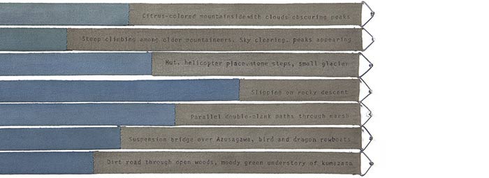 HELEN MIRRAHabitat de TransiçãoCULTURGEST Edifício Sede da Caixa Geral de Depósitos, Rua Arco do Cego 1000-300 Lisboa 07 JUN - 14 SET 2014 Habitat de Transição é uma retrospetiva sobre a obra ímpar de Helen Mirra. O seu fazer está no encontro e no cruzamento de diferentes diálogos, obstina-se a usar o mínimo dos mínimos. Tem em si um universo poético semelhante ao Haiku, onde a forma poética de origem japonesa expressa em três linhas a visão da realidade procurando um significado inteiro, um significado além da superfície. Ao percorrermos as salas da Culturgest em Lisboa, temos em nós um espectador imbuído, cúmplice da obra de Mirra. Nas paredes começamos por vislumbrar algo a que poderíamos chamar uma subtil linha do horizonte, traçada a cerca de metro e meio de altura. Aproximamo-nos deste horizonte que é afinal composto por fitas de algodão de 16mm costuradas entre si, de comprimentos variáveis e que atravessam uma paleta de cores entre o azul, o cinza, o branco, o verde, o castanho… tons que nos levam e conectam com o mar, as florestas, os vales, as montanhas, são como energias vitais da natureza irradiando no espaço. Estas fitas de algodão surgem-nos datilografadas, por vezes a palavra, por vezes a frase, implicando forçosamente a ação do espectador, onde este transforma a contemplação em actividade não-passiva, caminhando em busca da sua paisagem, o visitante impõe o seu ritmo, tem vontade própria, convoca as suas memórias. São, poderíamos dizer, paisagens interiores que nos transportam por entre mares revoltos e florestas habitadas por ursos, são filmes mudos detentores de um imaginário, uma visão explosiva e que contêm o tempo em si, o tempo medido. O tempo medido... um conceito a reter na obra da artista, e que assume também a forma de gravações áudio, mapas onde temos uma escala de dez segundos por um grau, permitindo identificar a que ponto no mapa pertence aquele apontamento, aquela construção sonora onde a dada altura conseguimos distinguir o som das cordas da sua guitarra. A linguagem da obra de Mirra está impregnada de formas estratégicas e sistemáticas para trazer ideias visuais e auditivas, assim como está pejada de referências filosóficas, literárias e cinematográficas que vamos descortinando à medida que percorremos o espaço. Não é de admirar, pois, encontrar ainda na sua obra referências como Cage que ganham expressão no seu interesse de duração ou no que toca ao “quase” aleatório. Quando aproximei a obra de Helen Mirra à tradição oriental, criando uma relação entre as suas paisagens interiores e o conceito da poesia Haiku, tinha também em mente não fechar este pequeno texto sem antes referir a proximidade latente que se sente na obra da artista com a tradição oriental, onde questões como a honra do trabalho, a meditação, as ações repetitivas são elementos integrantes do seu processo, visíveis em todo o seu campo estético, no caminhar implícito ao espectador, às dobragens do cobertor de lã pousado sobre a palete, ao costurar, à relação com a natureza. Cada uma das suas peças estende, no tempo e no espaço, um momento convocando-nos ao espaço absoluto, ao espaço do mundo. :::: Cláudia Ramos Artista Plástica e Curadora Independente