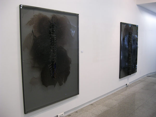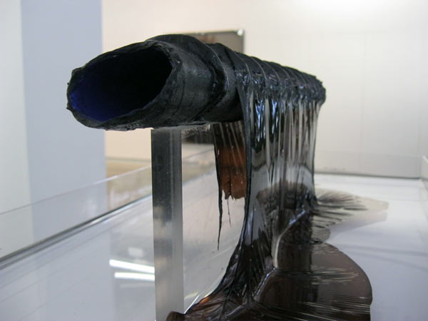 Em Visgraat, Nádia vai ainda mais longe e na sua pulsão artística usa cortes nesse tubo que nos lembram as telas de Lucio Fontana em que o rasgo simula a acção da mão escultórica no imaculado suporte da pintura. Também as esculturas de Nádia estão penduradas na parede, tendo por base uma placa de acrílico que funciona como substituto da tela.