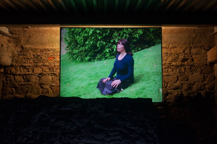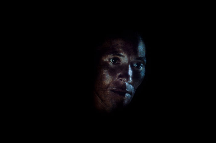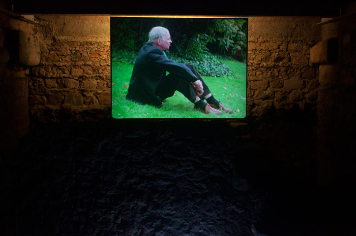 Apesar do contexto museológico, Pedro Costa resiste (e o termo não é em vão) à tentação de extravasar para lá do cinema. Os rostos dos seus filmes (Casa de Lava (1994) e Cavalo Dinheiro (2014)) habitam, e vigiam, as celas dispostas ao longo do túnel e o fundo negro dos planos imiscui-se na escuridão de cada divisória. Para o espectador, a sensação de abismo é permanente, não havendo referências espaciais, e a necessidade de tocar paredes para prevenir a queda, torna evidente, mais uma vez, o carácter exploratório da exposição. As vozes firmes dos actores de Straub-Huillet ressoam por todo o espaço, entoando o poema “Um lance de dados jamais abolirá o acaso”, de Mallarmé, mote para esta primeira edição da bienal. Filmado em frente a um dos muros onde foi levado a cabo o massacre da Comuna de Paris, a curta-metragem “Toda a revolução é um lance de dados” (1977) explora a manipulação tipográfica e a vertente composicional do poema seminal. Nove oradores encarnam, de forma metódica e rigorosa, os nove tipos de letra apresentados por Mallarmé na versão impressa, colocando em evidência os cortes abruptos da montagem fílmica tão característicos em Straub-Huillet.