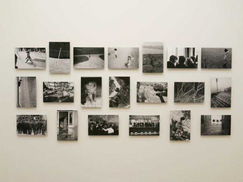 Mas depois não. Esta qualificação é demasiado rápida, demasiado reduzida, porque faltam duas séries de fotografias a ver, e que estas duas séries abrem uma perspectiva bem diferente, uma outra relação com o mundo, o que faz com que realizemos então que as ideias que pudémos construir até agora são demasiado limitadas para avaliarmos as investigações artísticas de Ângelo de Sousa. Se o trecho aqui apresentado da sua série intitulada Epiphanies desconcerta um pouco, um conjunto de cadáveres de animais, alguns num estado de decomposição avançado, descobertos no solo durante as suas peregrinações quotidianas, outra série, estranhamente intitulada Les Umanistes (sem H) ocupa uma pequena parede com uma vintena de pequenas tiragens reunidas de esguelha. Acontece que Ângelo de Sousa, que sempre teve um dedo no gatilho, realizou milhares de fotografias do mundo à sua volta, pessoas vistas da sua janela, árvores, paisagens, solos, ramos; mais que um catalogar deliberado do mundo, era uma pulsão obsessiva, um sonho inteligível. Portanto aqui não há mais do que uma pequena amostra da sua produção fotográfica, a qual se liga ao resto do seu trabalho (mais outros diapositivos, as quase abstracções e as mãos mencionadas anteriormente) de forma mais alargada, não apenas pela sua aproximação serial (que intervém aqui bastante à posteriori), mas sobretudo pela sua preocupação de explorar, de experimentar, de não se deixar constranger por nenhuma regra, de estar sempre aberto à descoberta, à surpresa. É um outro lado do seu trabalho, não tanto um subproduto dos seus trabalhos plásticos, mas um verdadeiro corpo autónomo, um alargamento que se inscreve num momento histórico, toda uma reflexão sobre o «medium» fotográfico para lá do documental, que teve lugar a partir dos finais de 1960, em particular com o trabalho fotográfico dos artistas conceptuais. Não tanto que Ângelo de Sousa pertença a esta corrente, mas estudar melhor a sua obra fotográfica permite melhor compreender a liberdade da sua procura experimental, que é a sua própria essência.