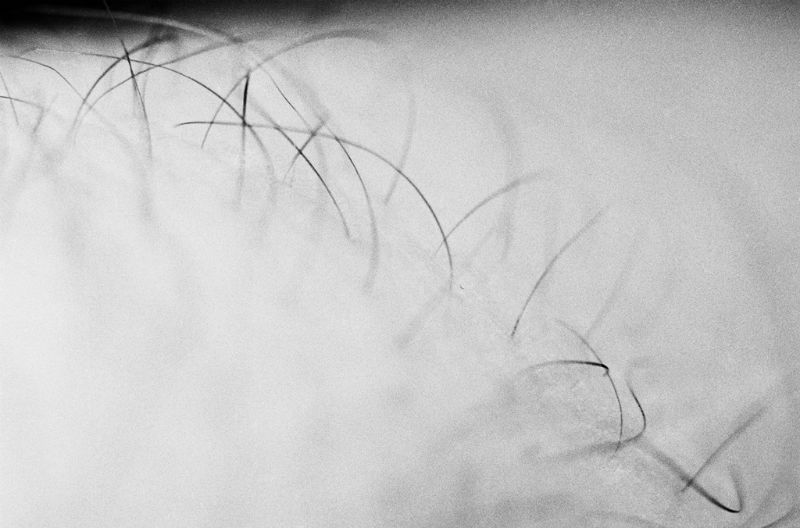 Enquanto que as suas telas, supostamente abstractas, contêm estes elementos bem reais, as suas fotografias, que deveriam elas representar o mundo, encontram-se, pelo contrário, conduzidas pelo lado abstracto. Por certo a abstracção na fotografia é rara, visto que (em qualquer caso quando se utiliza um aparelho), a imagem não pode representar senão aquilo que está diante da objectiva, mas muitas das suas fotografias são, antes de mais, difíceis de decifrar. É preciso identificar alguns pêlos na sua pele e compreender aqui que, aquela forma serpentina quase viva, que passa do desfocado ao nítido é uma corda de roupa presa a uma parede. Muitos dos seus temas são assim coisas muito simples, muito banais, prosaicas, poeira, cabelos, teias de aranha, um lenço de papel. Uma peça vai ainda mais longe na abstracção, não é senão uma película raspada e aumentada, um testemunho da própria materialidade da fotografia e do gesto da mão do artista intervindo directamente nesta matéria.