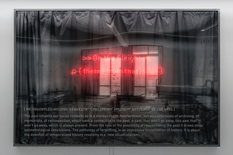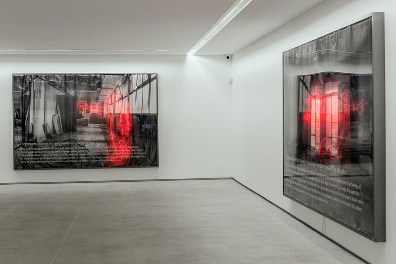 A galeria, habitada por uma luz natural que faz o seu caminho através das grandes montras e se projeta ao longo das paredes brancas, encontra-se desta vez perante uma proposta invulgarmente mais escura. O espaço passa a ser iluminado pela eletricidade da galeria e a que sai de cada obra de Filipe Marques, a partir de tubos de luzes néon. Este material, particularmente apreciado pelo artista, constrói e molda formas, figuras e letras em grande escala, por cima de imagens visualmente e tematicamente intrigantes. Consolidando a qualidade do trabalho, acrescenta-se a colaboração de João Sousa Cardoso. Também ele criador nacional, junta-se a esta produção e, numa das obras mais marcantes da exposição, é a sua voz que ouvimos ler um poema escrito por Filipe Marques. Com um tom e ritmo marcantes e cativantes, expandindo-se pelo espaço numa determinação que lhe é própria, é-nos dito que "não toldemos mais os olhos com sucessivas braçadas, para que as nostálgicas víceras deles se cubram em memória". O título Fell it, no fear. The flesh yields and is numb, apela ao contacto, ao físico, ao corpóreo. Pede o sentir, o expressar, e afasta-se do medo e da morte. Assim se anuncia uma exposição com intensa força de caráter e expressão. Mais palavras nos são ditas, em cada obra, através das luzes néon, umas brancas e outras vermelhas, de um impacto visual enorme que compõem, certamente, um dos maiores e mais complexos trabalhos de Filipe Marques. Esta forma de construção artística relembra, para alguns, inevitavelmente, a utilização do mesmo material por vários dos maiores autores do nosso tempo, como o minimalista Dan Flavin ou Joseph Kosuth, de cuja forma de expressão e dinâmica conceptual, sobretudo deste último, se aproxima particularmente o trabalho sobre o qual, hoje, nos debruçamos. Através da compreensão desse grande artista esclarece-se o sentido empregue pela patente utilização de palavras. Com Kosuth, a arte devolve à palavra um poder linguístico que não é literal, sendo, aqui também, proposto observar e receber as inscrições do texto de um outro modo que não o mais evidente. Filipe Marques aborda a questão da palavra e do seu sentido, defendendo que, para si, "não há arte nenhuma, nem mesmo as literárias, que sejam uma linguagem". Sabemos que a arte foi linguagem enquanto a segunda estava inscrita na primeira, como nas legendas descritivas de obras de arte, e, nessa medida, era a significação da representação. Possibilitando-se uma distinta situação e dinâmica, libertamo-nos de qualquer obrigatoriedade de sentido pois, tal como Kosuth explicou, "texto sobre obras de arte é experienciado de forma distinta do que texto que é, ele mesmo, uma obra de arte". No caso do trabalho de Filipe Marques, é-nos proposto o segundo entendimento, para que, através da utilização arrojada e contemporânea da palavra, a arte se processe como arte ela mesma, arte pela arte. Assim, no trabalho deste artista contemporâneo não há um uso da palavra como motor de comunicação, mas sim de expressão, criando e adquirindo a sua própria linguagem. Por sua vez, Wittgenstein defendia que o sentido das palavras dependem do contexto em que ocorrem, sendo isso importante para compreender o que nos é apresentado neste trabalho artístico. É preciso, então, considerar os desenhos que se anunciam atrás das letras néon e o próprio contexto expositivo que reclama por uma experiência estética do espetador. Assim, as palavras saem de si mesmas e expandem-se pelo espaço, para serem livremente interpretadas e compreendidas por cada um, em relação à sua experiência vivencial e à experiência estética, visual e sensorial na exposição. É-nos feito o convite a entrar num universo de jogos de linguagem, de cruzamento de plásticas e práticas artísticas onde o limite não se esgota no imediatamente recebido mas prolonga-se, mentalmente, em cada um de nós. Surgem também palavras em inglês que não estão iluminadas, tanto na direção correta como invertidas. Dificultam-nos a sua compreensão e desafiam-nos sugerindo um quase infinito de interpretações. Os desenhos a grafite e carvão e o vídeo que se revelam são peculiares, pertencentes a um universo sombrio, cinzento, dramático, de cenários quase cinematográficos que representam não-lugares carregados de histórias humanas. Tal como a voz de João Sousa Cardoso se faz ouvir pela galeria, são espaços vazios, "onde não estava, como um eco entre ecos". Pedro Marques Pinto sugere no texto que produziu para a exposição que o trabalho apresentado seja entendido como um tríptico, na medida em que é a continuação de pesquisas passadas e criações do artista, uma fase exposta no Espaço Mira, A Carne que os Guindastes Suspendem (2015), e uma anterior em Londres, no âmbito do Bermondsey Art Project, intitulada de Art Stabs Power Qué se Vayan Todos (2014). Este foi, por sua vez, o seguimento de uma exposição coletiva no mesmo ano, na Plataforma Revolver, em Lisboa, sendo este apenas um caso entre os numerosos realizados em Portugal. Ainda se acrescentam as exposições em várias cidades estrangeiras, como Macau, Pequim e Florença, solidificando-se a diversidade e o progresso do curriculum do artista. A relevância desta mais recente exposição vem também do propósito que Filipe Marques lhe atribuiu, de provocar e produzir sensações no espetador. O artista esclarece que, para si, a sensação estética não é percepção nem emoção em sentido corrente, mas sim um afecto, apresentando sempre uma ligação com algo real. É deste modo afetivo, profundo e genuíno, que a obra se aproxima de nós. Representativa mas abstrata, reside algures num imaginário que prolonga o real para um quase infinito de leituras, interpretações, linguagens e significados. A pluralidade das vozes que ecoam do trabalho é imensa, densa, ampliando a obra, o artista e nós próprios.