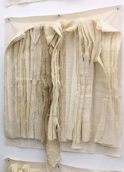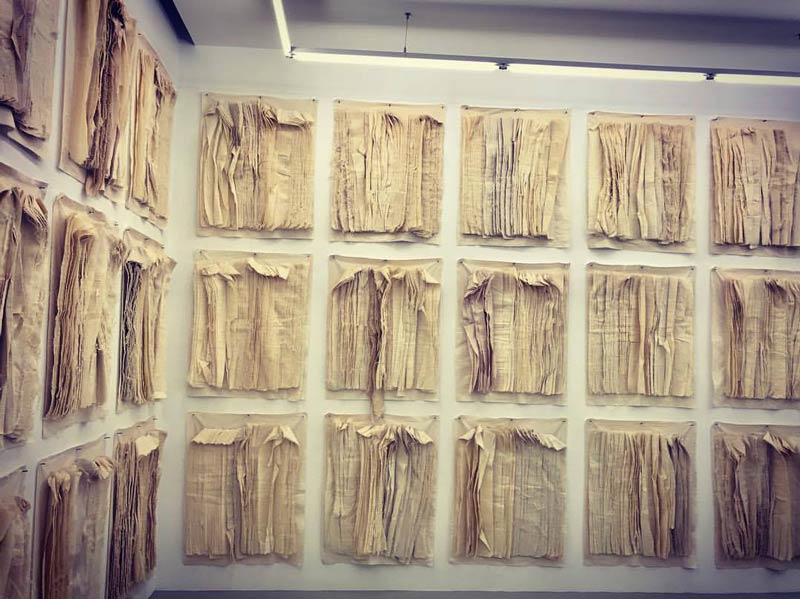 Não é surpreendente que o encontre em Lisboa, na exposição inaugural (visitável até 18 de janeiro) da galeria Uma_Lulik_ (“a casa sagrada” em tétum, uma língua de Timor) que acaba de abrir Miguel Leal Rios (que mostrará novamente o seu trabalho na Fundação Leal Rios, ali ao lado, a partir de maio próximo). A exposição chama-se Ausência, Absence, e é antes de mais a ausência do preto que salta aos olhos. Na parede, as formas brancas, painéis de tecidos dobrados que nenhum vento agita, e cuja proximidade, sem recuo possível, oprime e seduz ao mesmo tempo. O jogo de luz sobre esses livros suspensos de páginas virgens redobradas sobre elas mesmas ("as ninfas profundas") são fascinantes. É um apagamento, uma raspagem, um desaparecimento onde mesmo assim subsistem vestígios de imperceptíveis traços: são peças para se olharem longamente, atentamente, para discernir as formas mutáveis, cintilantes, animadas no seio dessas dobras imobilizadas, dessas fendas congeladas, dessas profundezas fantasmáticas. Tentação do monocromático, certamente, declinação barroca talvez, mas sobretudo luto: que ausência está ali? Que corpo amado não está mais lá? Por quem choramos? O artista evoca as camadas de tecidos brancos sobrepostos que são os sudários dos mortos malgaxes, e é mesmo ante uma obra fúnebre que estamos.