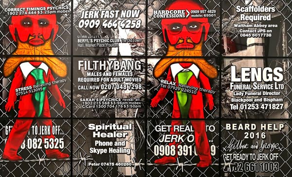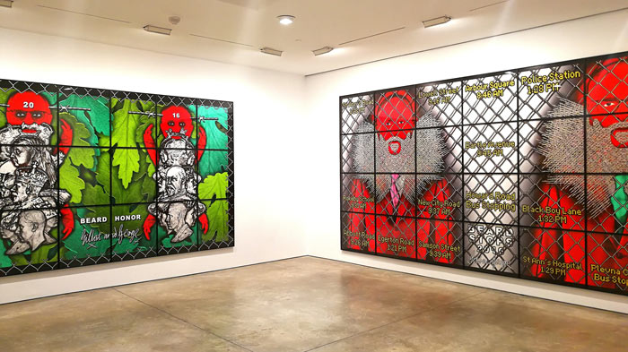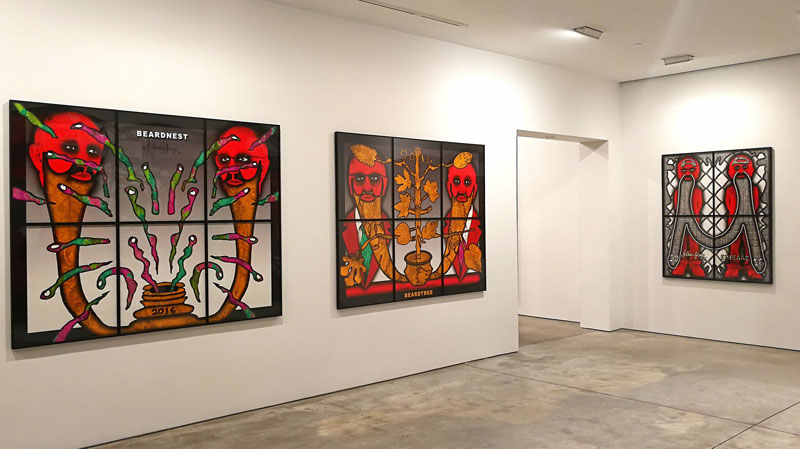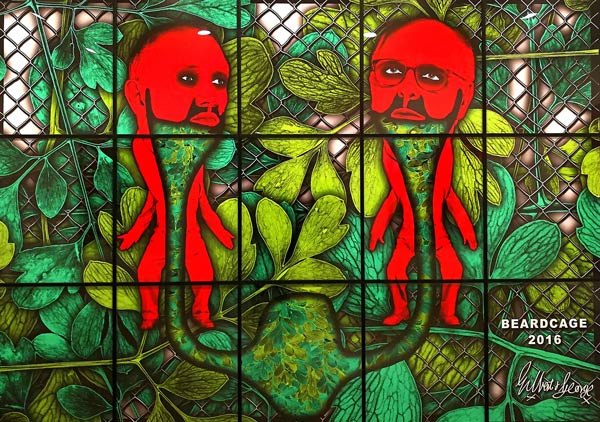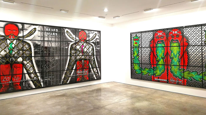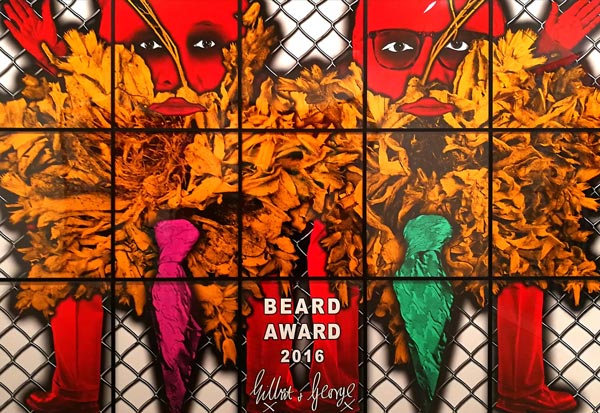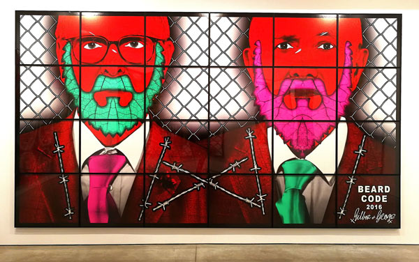 Não é muito vasto o número de artistas que podemos enumerar que se juntaram no matrimónio e igualmente na carreira artística, tornando ambas as uniões em acontecimentos de sucesso. Podem-se destacar Marina Abramovic e Ulay, Diego Rivera e Frida Kahlo, Pablo Picasso e Françoise Gilot, Man Ray e Lee Miller, e evidentemente Gilbert Proesch e George Passmore. Todos estes casais, de alguma forma alimentaram a sua produção artística da existência e interação com o seu parceiro, nuns casos mais denotados do que outros, mas no que respeita a Gilbert & George essa corelação, interligação, e presença constante situacional transformou-se numa intensa produção artística. Com diferentes nacionalidades, Gilbert, Italiano e George. Britânico, conheceram-se a 25 de Setembro de 1967 enquanto ambos estudavam escultura na Saint Martin´s School of Art, e segundo George, isto aconteceu pois ele era o único que entendia o medíocre Inglês de Gilbert. Pouco tempo depois decidiram juntar-se e criar uma entidade artística única que perdura até hoje. A exposição que vi recentemente destes artistas em Nova Iorque na galeria Lehmann Maupin (lehmannmaupin.com), com uma exibição simultânea em Paris (Galerie Thaddaeus Ropac, ropac.net), é representativa da genialidade de Gilbert & George, e uma vez mais certifica e patenteia uma assinatura formal à qual nos foram habituando, que raramente desaponta, e que manifesta uma coerência invulgar naquilo que poderíamos designar de uma fórmula visual de indubitável êxito e mestria. Eu diria que vejo centenas de obras de arte contemporânea mensalmente; percorro eventualmente uma média de 10 galerias por semana, e curiosamente, ou raramente me encontro perante uma experiência que eu posso considerar extasiante. Quando isso acontece, tenho necessariamente que pausar, e tentar perceber e entender as razões, embora esse exercício possa ser ingrato quando articulado à exaustão, aniquilando eventualmente o impacto da experiência do usufruto da obra de arte, que creio todos nós um pouco expectamos que se aproxime do sublime. Esta nova série de obras de Gilbert & George intitulada The Beard Pictures, e que celebra 50 anos de criação dos padrinhos da Brit-art, capta de imediato a nossa atenção e acuidade visual, pelas suas intensas cores e dimensões. Todas as obras/imagens tem mais de um metro de largo e altura, e outras mais de três metros de largo e dois de altura, o que faz com que estas representações nos absorvam por completo. O espaço da galeria transforma-se num ambíguo habitat pictórico de cor, em que figuras embarbadas se repetem em diferentes cenografias e short film stories, aludindo simultaneamente ao universo da banda desenhada satírica ao género cartoonístico. Nos meandros da simbologia ficcional, Gilbert & George, nomeiam todas as obras com um imaginário non-sense dadaísta, Beard Alarm, Beard Alert, Beard Attack, Beard Aware, Beard Beers, Beard Code, Beard Cross, Beard Front, Beard Green alarms, Beard Garden, e por aí fora. Outro elemento comum a todas as obras é o arame farpado, que numas imagens mais do que outras transforma os abarbados Gilbert & George em alegóricos prisioneiros das suas criações. Há inúmeras conotações possíveis nestas obras, mas seguramente podem identificar-se referências bélicas ao terrorismo, à exclusão e separação, à guerra e insegurança, ao próprio new status do Reino Unido e o Brexit, e naturalmente a mundificação e banalização da imagem masculina do homem com barba, que o duo parodia personificando a barba como máscara do género másculo. Cinquenta anos atrás vivíamos numa lógica do formalismo e do minimal, em que o artista não considerava sequer enquanto individuo e personalidade, incorporar as suas criações artísticas. Gilbert & George foram pioneiros ao se posicionarem no espaço de contemplação do objeto artístico, sendo também essa a sua mais significativa revolução, a identidade pessoal enquanto objeto de arte.