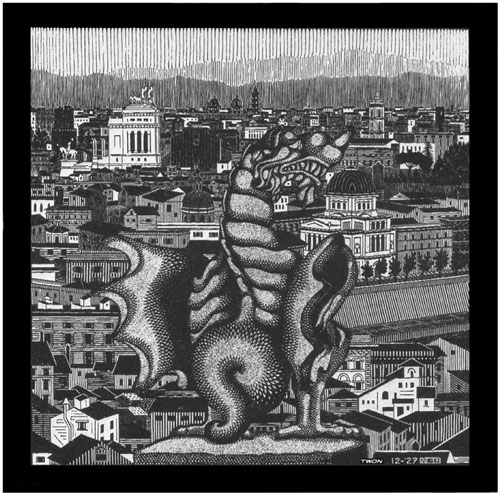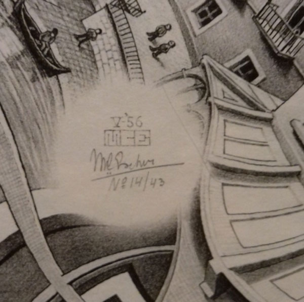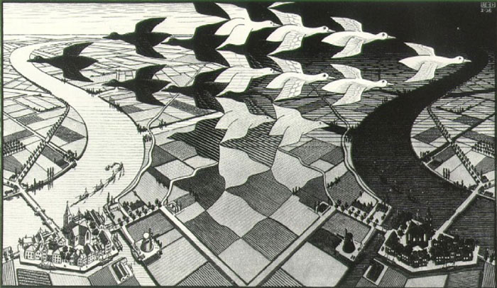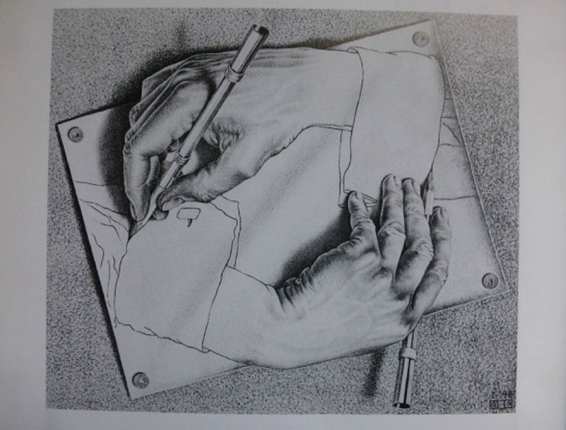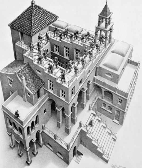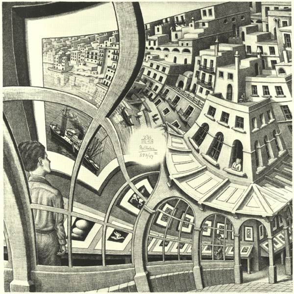 Antes de 1937, data a partir da qual ele se consagrará exclusivamente às suas "tilings", ele já era um gravador sobre madeira talentoso, banhado por influências italianas (e, em particular, do extremo sul da península, de Influências árabes) e andaluz; a sua visita ao Alhambra de Granada e à mesquita de Córdoba em 1936 fizeram-no descobrir (ou pelo menos conhecer melhor) a arte maurisca não figurativa, poesia de sinais entrelaçados que o inspirariam fortemente. Mas, nas suas xilogravuras, ele integrou também a influência da Art Nouveau e do seu professor Samuel Jessurun de Mesquita, cuja linha artística evoca os contornos fluidos de um Samico, sem ter a riqueza emocional ou onírica. Este primeiro período de Escher, menos conhecido, inclui, portanto, essencialmente desenhos ou gravuras de paisagens: alguns são simplesmente realistas, como as suas paisagens de Calabria; outros incluem vistas mais audaciosas, atalhos surpreendentes. Assim, essa visão de Roma a partir de 1927 sobre a qual o griffon de Villa Borghese vem taxando impostos já introduz uma forma de surpresa, para ver desconforto no espectador. Outro assunto favorito de Escher durante este período: a arquitetura, com desenhos muito complexos, mas que, tão vertiginosos quanto são, respeitam ainda um espaço lógico tridimensional e uma perspectiva não equivocada e ainda compreensível, como essa "Torre Babel de 1926 (mais alta)". E assim, é a partir de 1937 que a Escher desenvolve o que o fará passar à posteridade, esses desenhos de paradoxo e ilusão, que estão entre os jogos visuais mais intelectualmente estimulantes, frente dos quais o olhar se interroga, a mente hesita e procura em vão reconciliar o que ela vê e o que ela pensa que deveria ver. A sua construção assenta em loops, cada um dos quais é coerente, mas cuja justaposição é incoerente. "As mãos desenhando" são bem entendido absurdas, os dois níveis do loop, o desenhador e o desenhado, não são mais hierárquicos (um desenha o outro), mas eles voltam-se un para o outro e criam um emaranhado de hierarquias; e é preciso imaginar a mão de Escher desenhando essas duas mãos ... A maioria dos loopes subjacentes às suas composições são mais complexos: seis graus no "Movimento perpétuo" onde a água flui, 45 graus em "Ascensão e Descida" onde os monges escalam os degraus. Cada escada, cada passo é um determinado elemento, mas esses elementos são montados de maneira não padronizada, criando uma impossibilidade flagrante, uma incerteza total. É um processo infinito, que é representado de maneir finita, e portanto absurdo. Nas suas peças baseadas na metamorfose, ele já não joga com a gravidade mas com a transformação: as figuras tornam-se fundo, os fundos figuras, as partes de um objeto constituem-se cópias, positivo e negativo interlaçam-se, ressaltam as oposições entre formas e cores, e afastamo-nos do ponto de partida para retornar a ele. No "Dia e na Noite" os pássaros tornam-se campos e os campos pássaros, e o dia e a noite confundem-se, até forçar a nossa mente a abandonar toda a lógica. Em Metamorphose II, a composição, com um comprimento próximo de 4 metros, é ainda mais complexa, da palavra à forma geométrica, da forma ao animal, de um animal a outro, do animal à arquitetura, da arquitetura à forma geométrica, e de volta à palavra. Finalmente, uma das composições mais fascinantes de Escher é certamente "A Galeria de Gravuras": é uma pintura que representa uma pintura, representando-se ela mesmo; a menos que não seja uma exposição que se represente a ela mesmo; ou talvez uma cidade represendanto-se ela mesmo; ou um jovem se representando ele mesmo. O museu está na cidade, a cidade está na pintura, a pintura está no museu. Somos aspirados para o olho do ciclone? Escher não pôde resolver o enigma final e, portanto, teve que parar a sua composição e colocar a sua assinatura no centro, onde ele encontrou a sua própria lógica. Mas, em 2003, 47 anos depois, o matemático Hendrik Lenstra e a sua equipa conseguiram resolver o enigma e preencher o vazio central. Vários fizeram a analogia entre os desenhos de Escher e as fugas de Bach. O filósofo e lógico Douglas Hofstadter também os comparou aos teoremas de Gödel, acreditando que essas três pesquisas eram facetas de um mesmo sujeito, nossa incapacidade essencial para compreender a própria natureza do nosso processo de pensamento, que ele considera como a incompletude da auto-referência (simplificando grosso modo as suas 880 páginas). Livro um pouco árduo, certamente, e que alguns extratos são legíveis aqui, mas um livro emocionante e muito bem escrito. Mas parece-me que, mesmo para um ignorante em música, para alguém que não conhece a arte da fuga e do contraponto, para um ouvinte que não compreende o arranjo de uma fuga de Bach, permaneceria no entanto um sentimento de beleza, de harmonia, sem dúvida impossível de analisar, de expressar, mas no entanto muito presente. Da mesma forma, olhando para as obras surrealistas, por exemplo, de frente para um Magritte, eu não ficarei somente surpreso com a aparência, pergunto-me sobre o significado da imagem, sobre a ligação entre o mundo exterior e a sua representação mental, mas também verei uma pintura cuja estranheza perturbadora é mais forte do que o jogo único da construção e destruição lógica que lhe está subjacente. Assim, por exemplo, "A reprodução proibida", o conteúdo não questiona apenas o meu senso de lógica, mas confronta-me também com o absurdo, a inquietação, o duplo, o espelho, a morte.