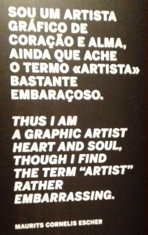 Diante de um Escher, não sinto nada parecido: o propósito limita-se a uma transgressão virtuosa das regras da perspectiva e da representação, a um enigma lógico admiravelmente bem construído, mas, aos meus olhos, sem ir além, sem trazer uma pequena qualquer coisa mais, que me inquietasse em vez de somente me intrigar. E não é a inclusão simplista de um crânio na parte de trás da retina que irá preencher essa lacuna. Por muito que o meu sentido lógico seja despertado pelo desenho de Escher, no entanto, nunca me sinto desestabilizado no mais profundo de mim, como posso estar diante de um Magritte (ou um Dali, ou um Tanguy). Talvez o próprio Escher sentiu essa lacuna, essa limitação da sua "arte" a um simples (mas maravilhoso) jogo da mente, e talvez seja por isso que ele hesitou em se qualificar como artista ...