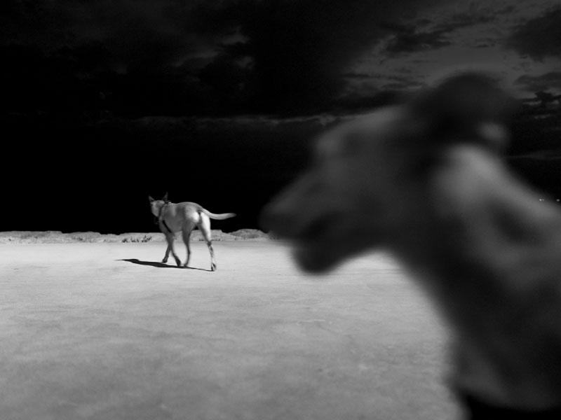 A abordagem de João Miguel Barros (no Museu Berardo até 3 de junho) é diferente: a partir de séries fotográficas (de uma a vinte e quatro fotos) que ele organizou em catorze scripts (Photo-metragens), escreve depois pequenos textos que não descrevem, mas que evocam. Estes textos são, na maior parte, cheios de nostalgia, de melancolia, de memórias de infância, reais ou inventadas. Trata-se de caminhos a escolher, do amor das árvores, do equilíbrio, do corpo e dos músculos, da inquietante estranheza à noite ou ao amanhecer, à beira-mar, da representação do amor (que não é o amor), da maré eterna, da névoa, da noite e (a minha favorita), de uma velha atriz, que advínhamos cega, que vem revisitar o teatro dos seus sucessos passados (daí a imagem "Teatro Vazio"). Estes são breves poemas em prosa, cinzelados e percussivos, e a sua ligação às as imagens é mais ou menos tênue.