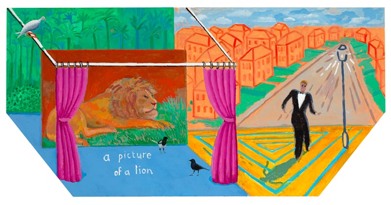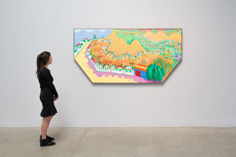 When we firstly look at this work, we can easily recognize, even without identifying as familiar the space where the action unfolds, or knowing what the artist physically looks like, that it may be the artist studio and that the person in the center of the space of this representation should be David Hockney himself. All those assumptions will be confirmed when reading the title of the work, “In the Studio, December 2017.” The narrative starts to get complicated when the viewer begins to understand that his scale is loyal to his real human dimensions if he was actually placed in perspective on that precise place at that viewing-point. Simultaneously, and after being confronted with the presence of Mr. Hockney in both rooms, the physical gallery space and also in his studio, we realize that all the paintings present in the gallery exhibition are also reproduced with the same loyalty in this work, through that same allusive perspective. The technique and medium used, photographic drawing printed, could answer some of the enigmas about the complexity of the final artistic product. However, the fact that the narrative crosses transversely with the techniques of execution raises questions to the comprehension of the outcome of the experience and tends to disorder one more time what we could have thought to have methodically achieved during our initial contemplation. Mr. Hockney’s paintings and drawings have shown throughout his artistic career that perspective as we know it, with one single vanishing point, or several aligned in the sea-line, are not his concept of a truthful representation of the world. He has been defying this logic either by reversing the perspective or challenging what we may recognize as a logical transposition of reality. There is nothing to question in this way of representation and it is one of his recognizable aesthetics which he often explores with acrylic paint. Nevertheless, the ability to deform physical space, from a malleable artistic medium such as acrylic to a photographic form of representation that our senses believe to be loyal reproduction method, confuses the perception of a biased eyeball reading. Throughout his career, Mr. Hockney has been successfully exploring landscape narratives, some simply architectural, others more nature related, several encompassing both themes, and more recently human portraiture. In this piece, Mr. Hockney approaches most of these topics, keeping them actively in dialogue and enriching what we understand has a characteristic narrative through his whole body of work. Simultaneously, and by introducing new techniques to this medium, the work provokes disguised sensations to the viewer, adding new levels of interpretation to the initially conscripted narrative.