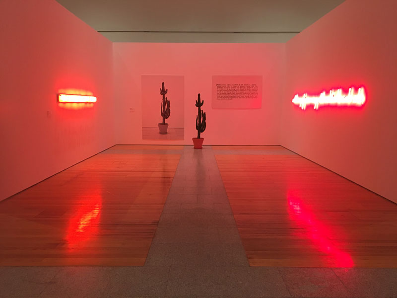 O casal de curadores foca-se nos fluxos da história da arte - ou a “coreografia de gestos mínimos”, como eles nomeiam seu exercício de curadoria remetendo à dança e parafraseando o filósofo português José Gil. Eles tomaram como ponto de partida o excepcional grupo de obras da Coleção Berardo dos anos 1960, 1970 e 1980, e fizeram diversas intervenções numa timeline já existente, aproximando e colocando em diálogo obras de nomes inquestionáveis do minimalismo e da arte conceptual com outros artistas contemporâneos, principalmente portugueses. Dou destaque ao grupo de obras acachapantes assinadas pelos maiores artistas do século XX como Vito Acconci, Carl Andre, Richard Serra, Bruce Nauman e Dan Flavin, aqui admiradas não somente pela reviravolta que as suas obras propuseram no contexto dos anos 60 e 70 nos Estados Unidos da América, mas também pelo modo como eles mudaram a maneira de pensar a arte e o mundo em todo o Ocidente. Foram esses artistas que trouxeram ideias como o espaço como obra, a linguagem nas artes visuais, o conceito como principal elemento de um trabalho, o uso de materiais simples, a não-subjetividade da arte, a separação entre arte e técnica. Tantos foram os seus méritos e questionamentos e tão abrangentes foram suas conquistas que se tornou impossível não encontrar os seus traços em qualquer produção posterior no mundo ocidental. E, ao aproximá-los com a prática artística portuguesa, os curadores também diminuem a distância entre eles e o público local e trazem para um mesmo palco grandes nomes internacionais e nacionais num movimento de experimentação e liberdade. É assim que uma escultura luminosa de Dan Flavin é colocada ao lado de uma série de fotografias do coletivo Os Espacialistas. Para além da aproximação cromática (ambos trabalhos funcionam no branco sobre branco), o diálogo entre elas está na espacialização da obra de arte. A partir de 1963, quando Dan Flavin fez a sua primeira escultura com tubos de luz (e continuou até à sua morte, em 1996), ele objetivava não apenas a apropriação de materiais industriais, mas o construir um espaço a partir da luz, pensando na relação que ela criaria com o público. Os Espacialistas, por sua vez, que trazem o vocabulário da arquitetura para sua produção visual, apresentam a foto-performance “Canto Branco (Dan Flavin)”, em que registram os seus próprios corpos na sua relação com o espaço. Outra aproximação genial é dos trabalhos geométricos de John McCraken com a escultura de parede de Fernanda Fragateiro. Como outros artistas minimalistas, o americano usava a geometria para indicar o máximo de objetividade na obra. Para eles, o que era importante não era a mensagem e sim o meio: a verdade era aquilo que se via, sem margens para interpretações. “Pylos”, uma escultura de laca rosada, é exposta ao lado de “Having Words”, de Fernanda Fragateiro, que consiste num bloco amarelo criado por páginas de um livro. Elas perderam a sua função original de transmitir mensagens através da palavra para se tornarem suporte de um objeto visual. Outras afinidades são homenagens mais descaradas como a de João Onofre, que nunca escondeu a sua admiração por Bruce Nauman, nome incontornável quando o assunto é a arte conceptual na performance e vídeo. Na videoarte do artista lisboeta, uma personagem anda continuamente dentro de um círculo, numa ação monótona e interminável; logo em frente está a emblemática escultura “Smoke Rings”, que mostra a pesquisa de Nauman em torno de esculturas espaciais circulares. Já de Richard Serra, grande entusiasta do minimalismo num período pouco posterior às primeiras produções de Sol Lewitt, Dan Flavin e Carl Andre, está uma das suas esculturas de aço em pequenas dimensões. O trabalho “Point Load” ganha uma releitura nas mãos de Diogo Pimentão, que usou grafite sobre papel para emular as chapas de aço dobradas de Serra. Tais aproximações também são um bom chamariz para introduzir produções locais aos visitantes internacionais do museu. Num núcleo voltado para a linguagem e a arte conceptual, estão obras não menos impressionantes de nomes como Art&Language, John Baldessari e Joseph Kosuth. Deste último está presente um exemplar da famosa série “Three Installations”: uma planta, a fotografia desta mesma planta e a descrição da palavra “planta” no dicionário constroem a máxima de Kosuth que era usar a palavra nas artes visuais aproximando-a da ideia e da imagem. Ele pregava pela não-representatividade da arte. A frase “Self-Described and Self-Defined”, escrita num luminoso rosa, tem a mesma resolução formal do neon de Ana Pérez-Quiroga, que esboça a frase “A tua roupa ficava um espanto no chão da minha sala”. A proposta pedagógica também traz textos complementares de parede que indicam as tais constelações e se mostram resultado de uma investigação de anos por parte da dupla de curadores. “Nós conhecemos a coleção de trás para a frente e desde 2011 estamos trabalhando com constelações em termos formais e conceptuais. Tentamos incluir na parte académica a curadoria investigativa, ou seja, um projeto de pesquisa através do ato da curadoria. Isso vai de encontro com a vontade da direção artística de que haja uma constante investigação e reformulação da coleção”, explica Ana Rito. Esse não deveria ser um mérito do Museu Berardo, visto que o papel de uma instituição deste tipo não é apenas criar, manter e apresentar um acervo coerente e relevante, mas explorar a sua potencialidade e abordagens de acordo com o contexto presente dos seus interlocutores. E quantos presentes não poderiam existir? O projeto ganha uma segunda edição a partir de outubro, quando obras de outros artistas serão trazidas para construir novas relações com as obras do piso -1. Já no próximo ano, Ana Rito e Hugo Barata farão as suas intervenções n