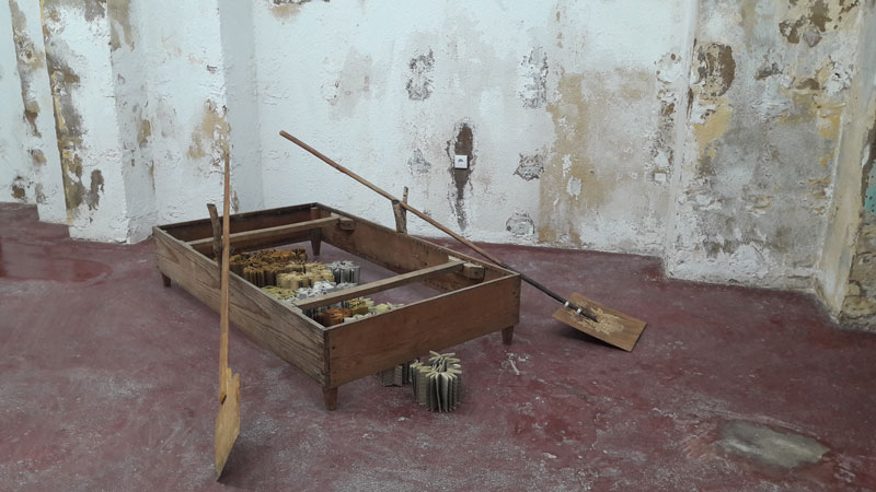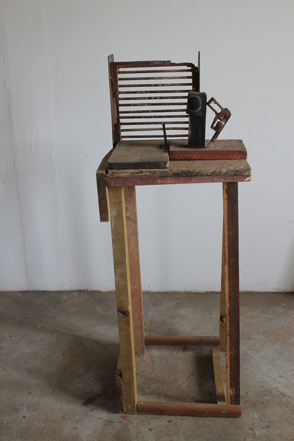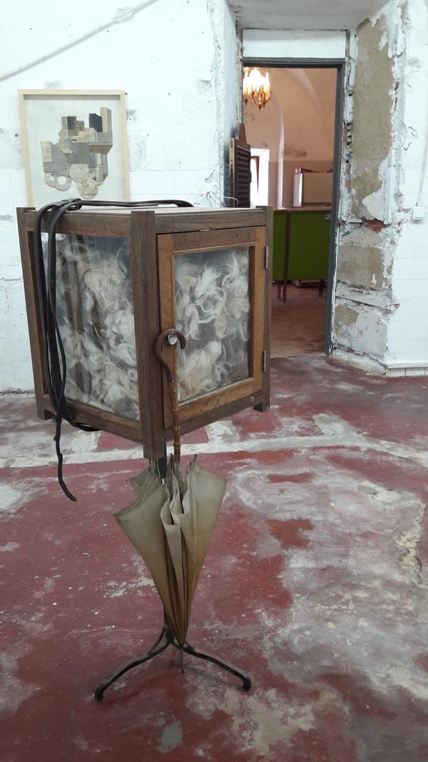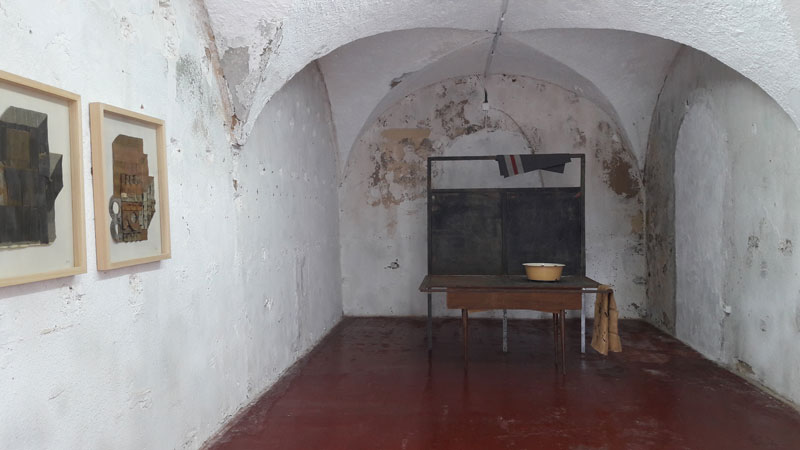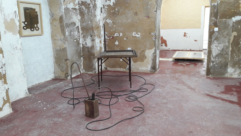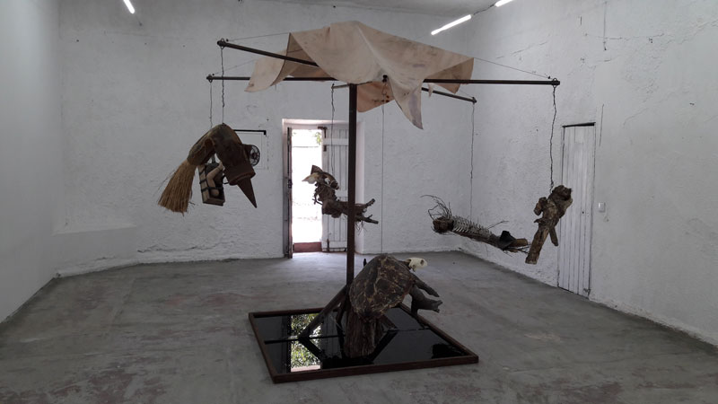 As restantes esculturas, construídas com matéria semelhante, contam-nos pequenas histórias: a fuga dos pais pelas estradas francesas, com o carro a abarrotar de objetos pessoais que não se queria abandonar durante a II Guerra. Linha de demarcação une o quotidiano, uma mesa, ao inusitado e demarca um espaço, o limite, ou a fronteira buscada não só pelos seus pais, mas por muitas famílias que fugiam da ocupação alemã. Esta mistura de objetos banais – mesas, cadeiras e camas, com elementos estranhos como os filtros de ar dos carros, que se convertem em desenhos e objetos escultóricos, ou os pelos da crina dos cavalos, retirados a cada escovagem, ou ainda os ossos de animais encontrados nas suas caminhadas pelo campo, são transformados em suporte e material para as suas criações. O resultado final – entre o lúdico e o tenebroso, entre o belo e o sublime, são sempre objetos políticos que transfiguram as ideias da artista em formas mais ou menos reconhecíveis, mas nunca as mesmas- tudo é recodificado, transformado, recomposto. E nada existe em solidão: cada objeto relaciona-se com o seguinte. É uma exposição de esculturas, naquilo que a escultura tem de ser/pertencer a um campo ampliado, em que mesmo as fotografias não são apresentadas como tal, mas servem como elo de ligação entre o demasiado humano e o etéreo – são superfícies onde a luz atua e deixa marca. Porque há uma esperança em meio ao tom mais lúgubre que o tema, e as peças, possam emular. Há esperança porque há luz, no fim ou no começo, como um facho que ilumina uma noite escura. Como um holofote acendido num estúdio vazio pelo cineasta Federico Fellini para provar a todos que, afinal, nos seus filmes, sempre houve luz – matéria-prima da fotografia e reveladora de imagens. Uma cama que se transforma em embarcação; restos de um portão de ferro que se convertem numa mesa de ping pong; um revólver desgastado que aciona uma bomba de gasolina… Nada é o que parece ser, ou melhor dizendo, tudo se transforma e assume uma nova dimensão. Porque esta exposição fala da humanidade e do seu movimento contínuo a fugir, muitas vezes, de si mesma. Como na fortaleza, de Dino Buzzati, o tempo e o espaço deixam de fazer sentido, porque funcionam numa outra dimensão. E A Fortaleza é a peça que está no princípio da fuga, ou fora dela, como quem espreita: através do desenho sobre fotografias, a artista insinua a montanha inacessível, sugerindo uma paisagem fantástica e simultaneamente sóbria, que representa, quiçá, o ponto de fuga que o soldado de Buzzati (ad)mirava. Um ponto na paisagem. Numa paisagem da qual não se consegue nunca fugir.
