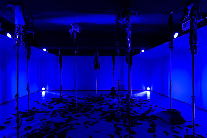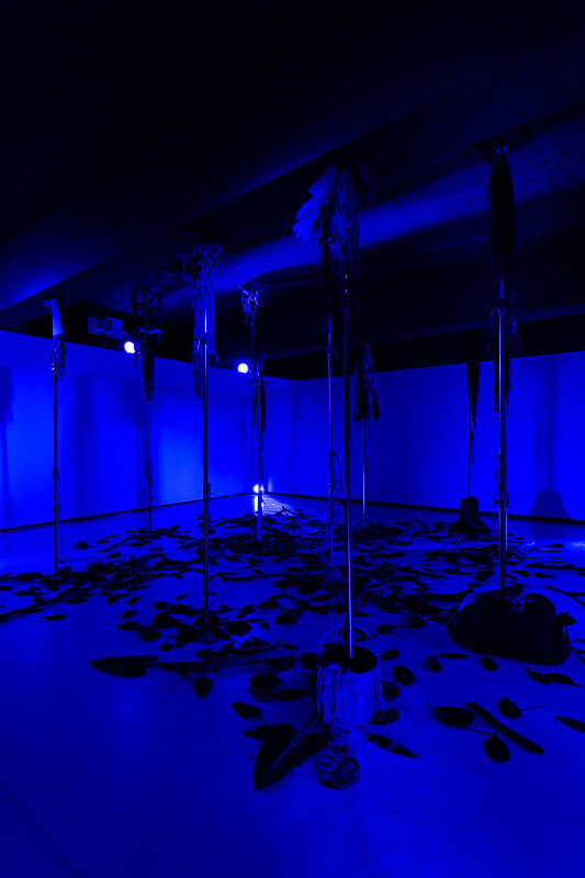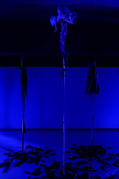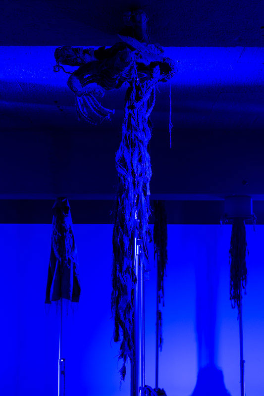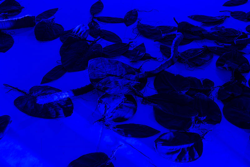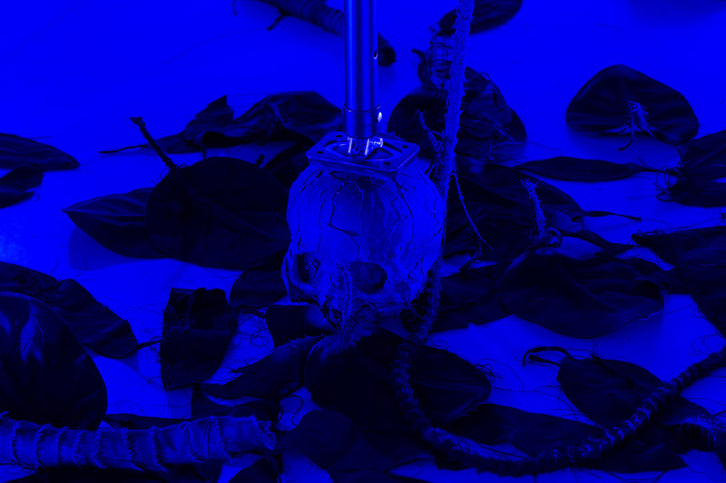 “O Filho do Caçador” de Pedro Valdez Cardoso encena um exercício estético e narrativo, deliberadamente oculto e fantasmático, que procura refletir sobre a identidade sexual, as relações familiares, o poder, a perda de inocência e o segredo. Este corpus artístico criado por Valdez Cardoso é constituído por três obras interdisciplinares - uma instalação ( expandida e fragmentada no espaço, onde predomina o azul e transforma o espaço expositivo da Box da Appleton numa enorme sombra tridimensional que se assemelha a uma floresta ) ; uma peça de teatro ( cuja ação se desenrola numa cabana de caça numa floresta do norte da Europa) ; e um livro de artista (onde se enumeram as distintas referências visuais que inspiraram este projeto) – que sugerem uma intenção narrativa semelhante, embora expressa e materializada de distintas formas. Deste modo, o artista retoma um discurso já conhecido do seu léxico temático, regressando a temas antigos do seu imaginário, como a caça, a sombra, o poder e a monocromia visual. A ideia inicial para o “O Filho do Caçador” surgiu há alguns anos atrás a partir de uma notícia que narrava uma história macabra passada no norte da Europa: Um caçador acidentalmente teria morto o seu próprio filho durante uma caçada. Partindo desta história, o artista, em parceria com Nuno Sousa Vieira, concebeu uma curta peça de teatro, que se apresenta como folha de sala da exposição. Na peça, ao início da noite, pai e filho preparam-se para jantar, enquanto uma breve conversa faz despoletar um misto de sentimentos aprisionados e traz à tona um segredo do passado. As duas personagens que apresentam traços emocionais opostos potenciam a reflexão sobre o poder e a identidade. Se por um lado, o pai se apresenta como uma figura autoritária patriarcal, que transparece uma tranquilidade sinistra oriunda da consciência do poder e da invulnerabilidade; em oposição, o filho representa a fragilidade, a complacência e a ingenuidade curiosa. À medida que nos aproximamos do final da peça, a tensão dramática adensa-se e os segredos outrora guardados acabam por se revelar: o irmão do filho do caçador (Jens G.) foi morto pelo próprio pai, devido à sua incompreensão do facto deste ser homossexual. A tensão latente, a agitação, a indiferença e austeridade do pai, anunciam-se tenuemente pelos interstícios da narrativa, como sendo os atributos do seu verdadeiro caracter. Trata-se de uma história sobre verdades apagadas, ocultação e dissimulação.