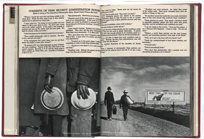 Página do jornal U.S. Camera 1939, editado por T. J. Maloney, (New York: William Morrow, 1939), 46–47. Fotografias de Walker Evans e Dorothea Lange.
