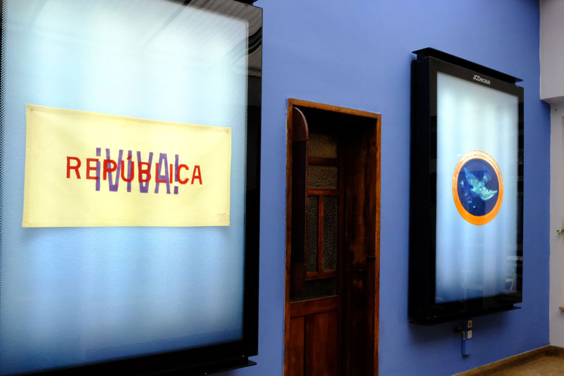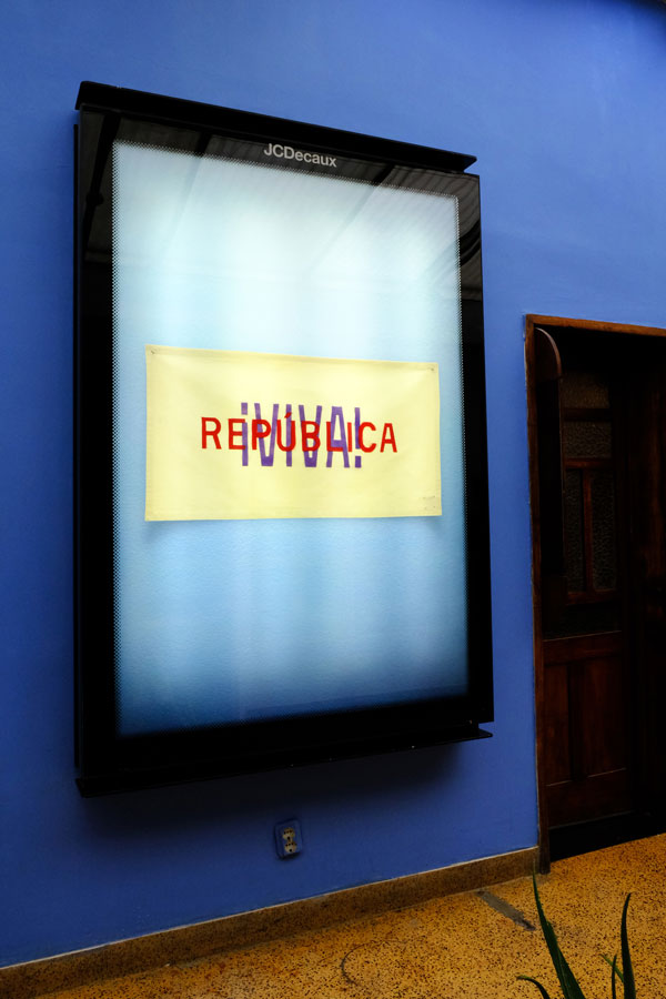Servindo-se dos mupis como molduras de grandes dimensões e em plena interação com a estrutura Ana Pérez-Quiroga apresenta-nos imagens como se de spots publicitários se tratassem e cujos signos e seus significados desejamos ler. Numa clara alusão e homenagem à Mãe, e acreditamos que a todas as Mães, a artista apresenta-nos numa caligrafia infantil, como infantil é também o traço que acompanha o desenho que lhe serve de fundo, a palavra mamã. Qual criança que oferece um desenho à mãe, a artista oferece-nos esta imagem, a mesma que numa anterior exposição surgia gravada na parede à altura de uma criança – denunciando o seu autor – ganha agora uma nova dimensão, uma outra visibilidade, preservando as marcas do seu traçado na parede. Da inocência pueril e de um retorno à infância a artista transporta-nos para o imaginário revolucionário de causas e lutas. Pintada numa tela de algodão a palavra de ordem ¡VIVA! República, apresenta um duplo sentido e leitura, ao mesmo tempo que nos remete pelas cores vermelha e roxo à bandeira republicana espanhola. À medida que observamos a expressão ¡VIVA! República – República ¡VIVA! deixamo-nos conduzir pelo espírito de lutas e de perseverança, que a artista habilmente resgata para o presente, para que o mantenhamos vivo e sobretudo para que não o esqueçamos. O resgate para o presente de um dos eventos de fragmentação do período da Guerra Civil Espanhola, materializado num trabalho de raiz sociopolítica, no qual História e autobiografia se cruzam, atinge uma dimensão pessoal na imagem apresentada no último mupi. Partindo da narrativa de memória familiar, Ana Pérez-Quiroga apresenta-nos o desenho pintado de um dos objetos trazidos pela mãe aquando do seu regresso a Espanha: uma pregadeira esmaltada. Dezanove anos depois da partida para o exílio na União Soviética em 1937, aos quatro anos de idade, a mãe da artista regressa a Espanha em 1956, com 24 anos e licenciada em medicina. A partir do conteúdo da mala de viagem da mãe, Ana Pérez-Quiroga cria um arquivo (sentimental) com desenhos de uma seleção dos objetos trazidos da Rússia. Para além da investigação histórica em fontes literárias e documentais, a artista recorre a estes objetos desenhando-os, servindo-se do traço como gesto de intimidade e ao mesmo tempo como processo de investigação e de registo de bens que podemos interpretar como fonte de um trabalho científico. Não deixa de ser curioso, e com certeza nada inocente, a escolha da artista em apresentar no mupi uma pregadeira, adereço de adorno normalmente utilizado na zona do peito, e que ostenta ao centro o signo da pomba da paz. Se por um lado a escala da imagem do objeto ampliado promove um rompimento com a sua vertente mais íntima, por outro lado o fato de ter sido um adereço selecionado e trazido pela mãe da artista, da União Soviética para Espanha, revela-nos a importância do mesmo enquanto adereço que nos serve também como autorretrato. A significância do objeto que, entre outros, vieram na mala remete-nos também para a própria ideia de mala enquanto casa, que por sua vez se relaciona com o título da exposição ¿De qué casa eres? pergunta comum entre os niños e niñas quando se encontravam durante a sua estadia na Rússia e mesmo depois, quando regressaram a Espanha. A expressão comporta uma dimensão de identidade e de pertença - quem somos, a quem e onde pertencemos, a que família, género – que carateriza o universo artístico de Ana Pérez-Quiroga e que nos lança numa reflexão sobre estas temáticas, numa análise de pós-memórias que agora materializadas na Mupi Gallery como imagens propagandísticas adquirem uma nova dimensão.