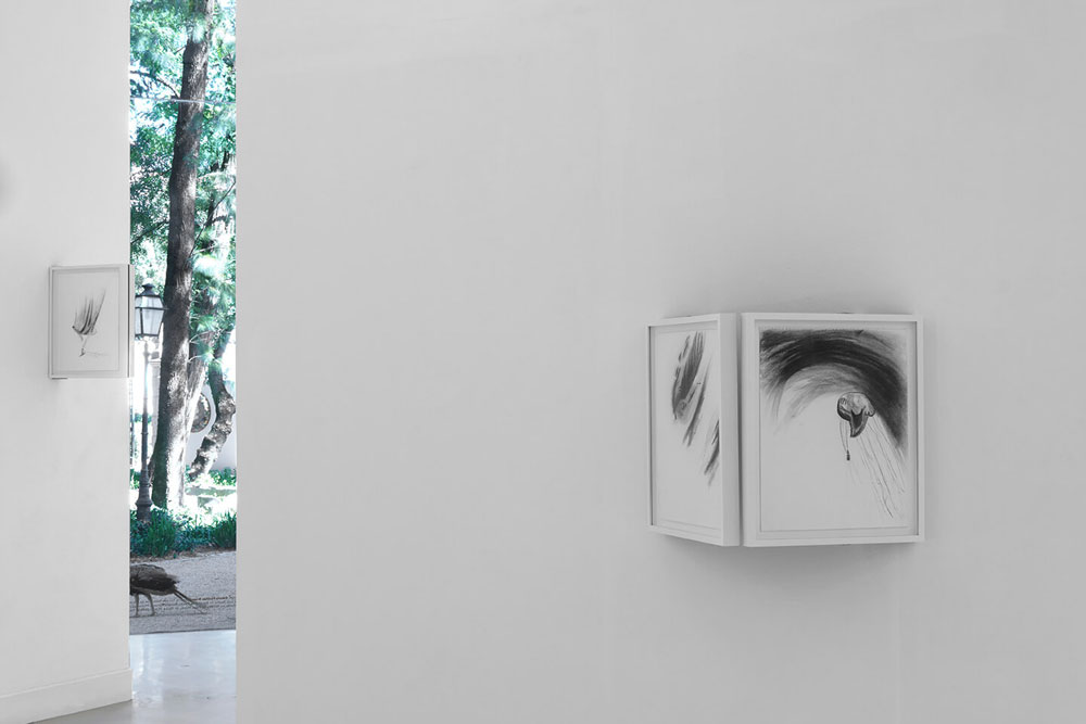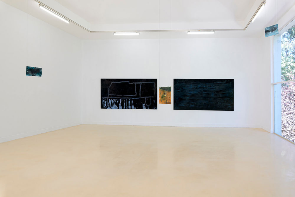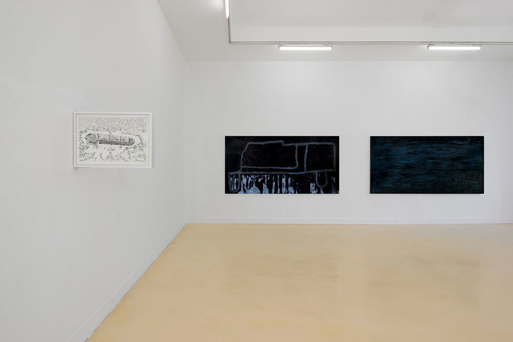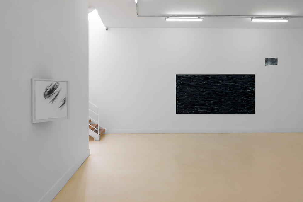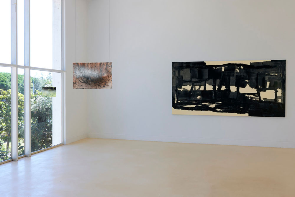 Um estranho aqui cheguei, de Pedro Calapez e Alexandre Conefrey, celebra a contemplação da obra poética e lírica “A viagem de Inverno” de Wilhelm Müller, posteriormente, composta por Franz Schubert, numa série musical, cujo conjunto de 24 lieder se revelou no ciclo Winterreise. Esta série poética e musical de Winterreise canta um viajante numa solitária jornada, que deambula para o desconhecido, envolto em névoa e neve, numa paisagem invernosa, transparece o seu universo conturbado e introspetivo do estado da alma: “My heart is as good as frozen; /within it her image gazes coldly. /If ever my heart thaws again, / her image too will melt away” (Erstarrung). O diálogo estético entrelaçado de Pedro Calapez e Alexandre Conefrey cria uma simbiose do universo pictórico que louva o sentimento trágico do ser humano, apresentando, assim, não uma leitura ilustrativa da obra romântica, mas, porventura, uma inspiração meditativa do que se entende por sublime na atualidade. Ambivalência das duas linguagens dos pintores que se cruzam e se movimentam no espaço, transfere para o observador as tonalidades melancólicas e caminhos trágicos do estado da alma do ser contemporâneo. Em Pedro Calapez, as pinturas de grandes dimensões projetam a performance do corpo no espaço infinito, numa aproximação da metafísica do ser, onde o campo de visão se expande para além do caminho introspetivo e se dissipa na paisagem. A cor negra que produz nas pinturas, cria uma visão da tragédia, de sofrimento e dor, que se manifesta num fluxo orgânico da expressividade da cor, acabando por quase abandonar a representação figurativa, para sugerir um “organismo vivo da paisagem”. Caminhamos no espaço. Sentimos o corpo. Somos arrebatados pela imensidão do escuro, o infinito da cor negra que expressa o vigor do gesto como se fosse um deslocamento da pincelada. A emoção transparece na ação. Na profunda obscuridade, o impulso e o gesto repetem-se até à exaustão.