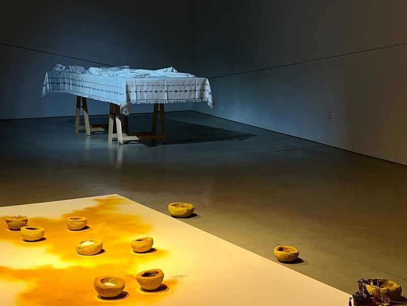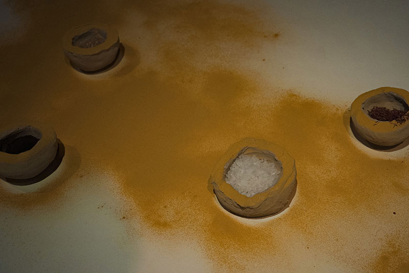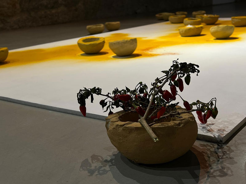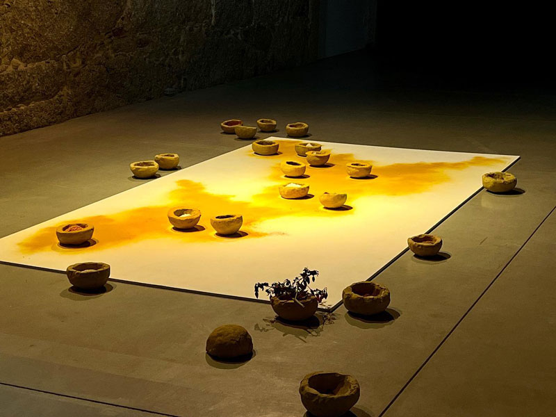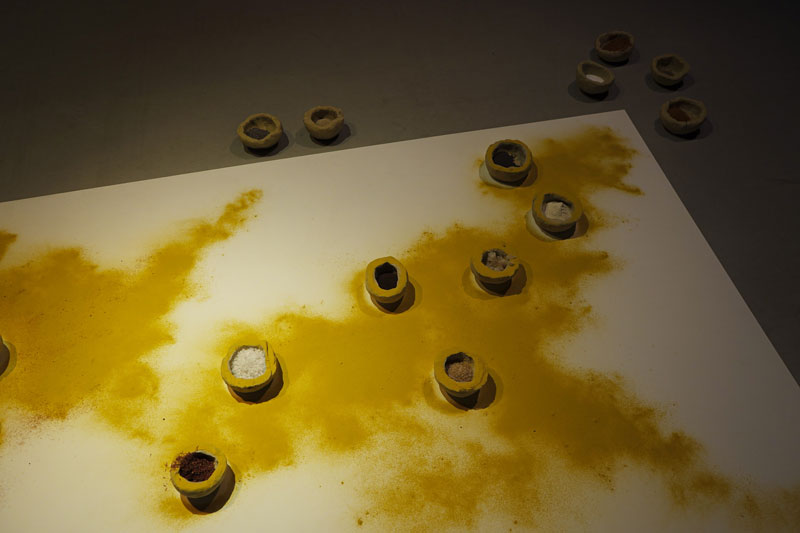alheava_Primeiro, conheci o desconhecido; depois, desconheci o que conhecera; mais tarde, abordei o que conheço como quem desconhece, é o título do trabalho central que reflecte bem o que acima expusemos. O barro volteado parece pão, o pão que se partilha à mesa, a mesa que será a reconstrução de algo que também não existiu ou que existe apenas na imaginação. O ritual e o performativo em potência tomam lugar de anteriores projectos a solo mais coloridos e cinematográficos. Mesmo assim, temos um quase país desenhado a açafrão - a mãe assim o interpretou! - com especiarias que se podem moer, para condimentar essa comida que chegarà à mesa, por onde os corpos comungaram; os doze guardanapos usados, a remeterem para o cerimonial da refeição, onde se deixa o rasto das bocas falantes e comentes, da comunhão, onde se deixa um rasto da desejada união entre povos, etnias, simplesmente pessoas. A ucronia é quase inevitável quando se tenta uma reconstrução do passado. E o artista, agora adulto, aproxima-se da etnografia construindo um imaginário num regresso às tradições, à manualidade onde a mão activamente prepara, molda, borda, actua e torna possível um sentido de comunidade e de um tempo interior, um tempo do pensar, um tempo para o silêncio, um tempo que se sobreponha às ruínas, aos fragmentos e aos medos e que permita a existência viva e o reencontro em diálogo com o lugar.