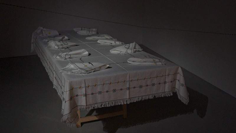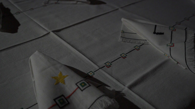 Rever o passado também transforma as memórias que muitas vezes não têm uma correspondência real, há algo que não foi dito, algo que não foi lido e que é percebido mais tarde, como na ampliação das fotografias do pai, António Machado Maia, apresentadas na exposição individual alheava_Nampula na galeria Quadrado Azul em 2012. Esta permitiu ao artista questionar e reflectir a condição dos autóctones e de si e dos seus familiares descendentes de portugueses na machamba (fazenda), onde aqueles trabalhavam. Afinal não viviam nas mesmas condições, apesar da boa relação que mantinham com os trabalhadores. Em alheava_filme, de 2007, o artista recupera os filmes super 8 do pai e coloca-o enquanto narrador de um discurso recolhido em diversas vezes, ao longo de três anos. Aqui desvela-se mais uma vez, através da vivência pessoal de alguém nascido em território colonizado, o seio familiar e a complexa realidade que foi, de parte a parte, a guerra e descolonização e a barbárie, a crueldade e a miséria por elas provocada. Mas voltemos à criança que regressa ao lugar de origem dos seus avós, que na realidade não é um regresso porque vem para o desconhecido: é agora estrangeira, alheada, num universo com uma língua outra, que tem de aprender para passado um ano entrar na primeira classe. Faltam-lhe as cores vibrantes, os cheiros, a paisagem, os sons da mestiçagem singular de Nampula. Existe uma ruptura com o seu país, os amigos, a natureza, a liberdade e descontração que o calor permite. É essa não pertença e o que ficou para trás, que a leva, em adulto, a desenhar este projecto que se desdobra numa série de trabalhos entre a performance, o teatro, a instalação, a fotografia, a imagem-movimento, o som e a pintura apresentados em mostras colectivas e individuais. O título da presente exposição, Um lugar sem país no mundo, patente no espaço Mira, revela a criação de um outro lugar, um lugar inexistente enquanto espaço físico. Um lugar que se estabelece pelo fazer, pelo vínculo e afeição, por um fazer de mãos dadas. Pela devolução de um tempo ao tempo. Cria-se um novo lugar de reflexão, de idealizações, de aprendizagem; um lugar que também pertence a quem vê e que surge dessa sinergia entre o artista, o colaborador, o espectador e a obra. Santos Maia recorre novamente à família e aos amigos para esta construção; são as mãos da mãe Albertina que bordam a toalha e guardanapos com os signos retirados da bandeira de Moçambique (o fuzil, a enxada, o livro aberto, a estrela) e desenhos da cestaria daquele país. Padrões que se re-apresentam em alheava_configura-se em função da origem, não da memória, mas daquilo que não aconteceu ainda (ucronia)_III, realizado pela amiga Maria José Correia. Esta fita de missangas que envolve o recanto da mesa como que tornando visível o que os conecta, o imaginário. O sobrinho Afonso Alexandre, que o ajuda na recolha do barro em Quiaios (a localidade onde cresceu), para juntos moldarem as rudimentares taças-almofariz que contêm as diversas especiarias e sementes trazidas da sua viagem-regresso a Moçambique em 2014. E o último trabalho que dá título à exposição, no qual colabora mais uma vez a mãe Albertina e a irmã Anabela Maia, que remete a outras intervenções e exposições anteriores.