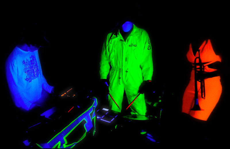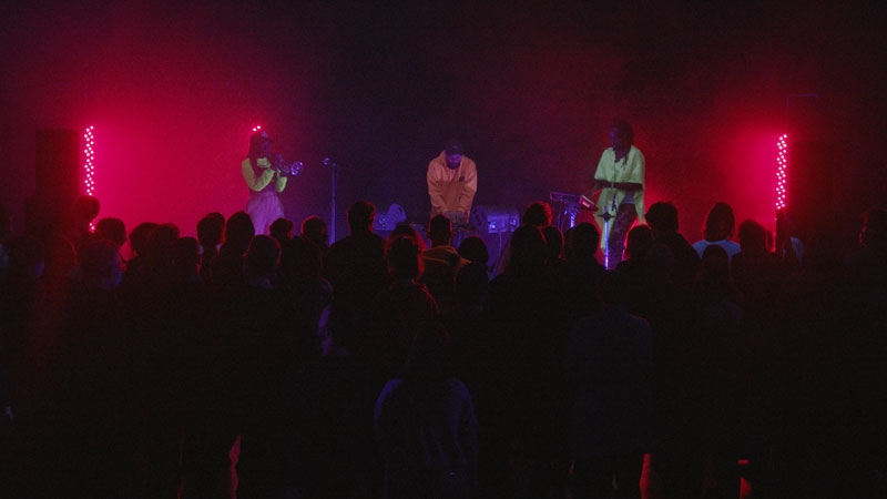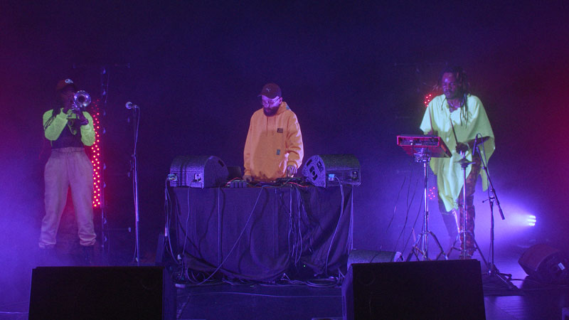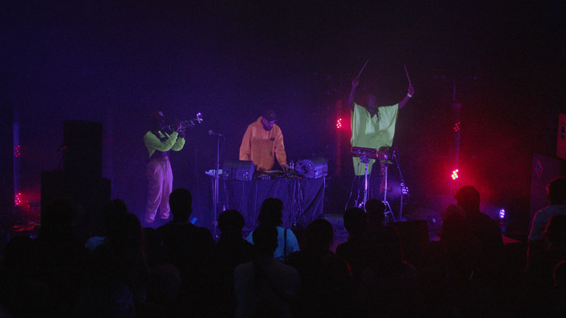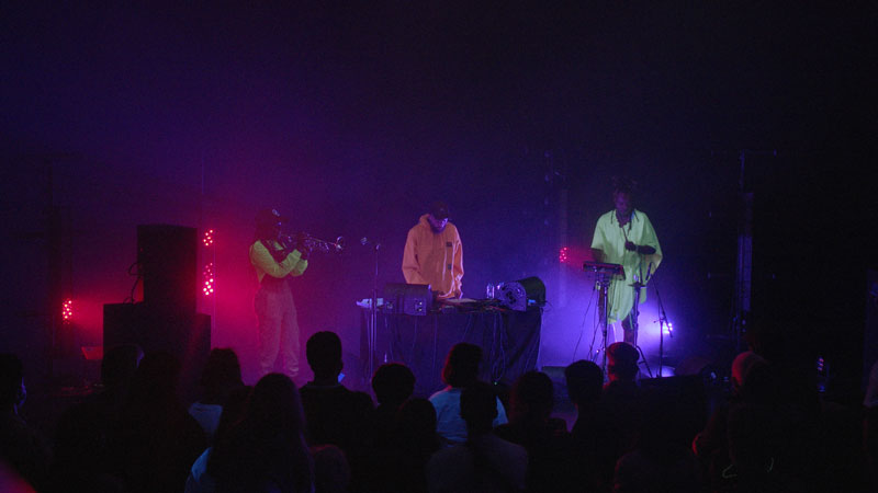 HHY & The Kampala Unit é um projecto musical e performativo criado por Jonathan Uliel Saldanha. Este projecto pretende pesquisar o hibridismo da música electrónica criando um lugar exploratório onde o dub, o techno, a percussão visceral e os sopros marciais se misturam. Desta forma, nasce um espaço onde a repetição de sons e batidas hipnotiza o corpo conduzindo-o a um universo de paisagens sintéticas. Este concerto faz parte do conjunto de espectáculos da curadoria do artista português que terá lugar no Centro Cultural de Belém (CCB). Carta Branca a Jonathan Uliel Saldanha procura desenvolver uma curadoria que nos revela novos mundos. Este concerto teve lugar dia 29 de Janeiro no pequeno auditório do CCB e tem a co-produção do Teatro Municipal do Porto. Jonathan no computador criando texturas sonoras, disparando frases rítmicas e controlando os volumes de todos os instrumentos na mesa de mistura. Florence Lugemwa, artista e activista ugandesa, no trompete esculpindo a plasticidade melódica da paisagem e Sekelembele, artista congolês, na percussão desenhando o fio condutor da música que se está criando. O som do trompete de Lugemwa é manipulado através de efeitos como echo e reverb, desconstruindo o som clássico deste instrumento. A percussão de Sekelembele é uma mistura entre pads electrónicos que proporcionam uma vasta gama de sons e instrumentos acústicos como pratos de bateria e chocalhos. O concerto começa com um dj set de Florence Lugemwa e Sekelembele. A artista ugandesa abre a pista de dança através de sons metálicos, escuros e flutuantes. Lugemwa coloca-nos num lugar futurista onde habitam a artificialidade e um certo imaginário futurista. Sekelembele dá seguimento ao dj set imprimindo ritmos da cena alternativa electrónica ugandesa, nomeadamente afro-house e kuduru, imbuídos numa atmosfera hardcore que dá continuidade ao imaginário artificial futurista ainda agora referido. Simultaneamente, dança freneticamente energizando a sala e o público. O ambiente da sala de espectáculos é povoado pela escuridão da luz negra, exaltando o branco das roupas dos espectadores e as cores fluorescentes das roupas dos artistas. A plateia é uma pista de dança, todos e todas estão de pé a dançar, algo bastante incomum num espaço institucional como o CCB. Na plateia, de frente para os músicos, vê-se uma pessoa com uma máscara tribal laranja fluorescente colocada na parte de trás da sua cabeça. A máscara está de olhos postos no público. Esta figura tem vestida uma t-shirt com um grande smile amarelo acompanhado pela frase Bless This Acid House, uma referência clássica à cultura underground da free party e do acid techno. Ela faz parte do espectáculo, coloca uma certa performatividade e invoca um certo espírito ritualístico no concerto que estamos a assistir. São vários os momentos onde vemos Sekelembele a dirigir-se a esta figura. Fá-lo de forma teatral-performativa com recurso a gestos amplos e lentos. Sekelembele parece pedir-lhe permissão para continuar, ou um sinal de que tudo está a ir na direcção certa. A figura em questão responde-lhe afirmativamente abanando a cabeça e levantando o seu braço direto.