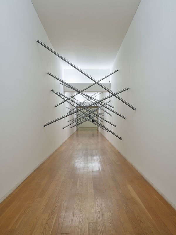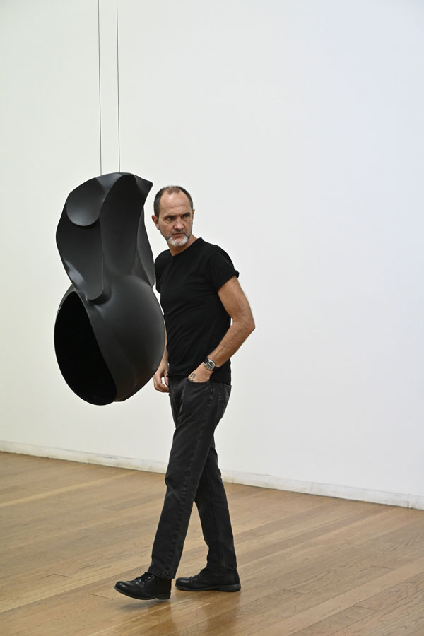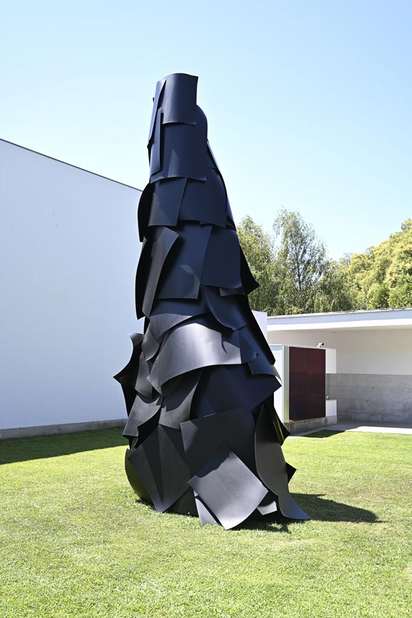 A mostra intitulada Chegar sem Partir, passível de ser visitada até ao dia 15 de janeiro, distribui-se ao longo da ala direita do edifício e no parque. Deste modo, a obra de Chafes dialoga tanto com a arquitetura de Álvaro Siza, como com a natureza envolvente. Várias peças foram recuperadas e reinterpretadas e, outras, criadas propositadamente para a ocasião. Chafes é autor de uma obra singular e atemporal. Tendo concluído a licenciatura em Escultura pela Faculdade de Belas-Artes da Universidade de Lisboa e frequentado a Academia de Arte de Düsseldorf sob a direção de Gerhard Merz, situa as suas principais referências no gótico tardio, no romantismo alemão e nas heranças de Marcel Duchamp e Joseph Beuys. É, hoje, um dos maiores artistas nacionais e enaltecido a nível mundial, o que se justifica por deter um sentido estético raro, uma invulgar virtude criativa e um rigoroso formalismo. Sendo que, assinale-se recorrendo a Grosso, a atual exposição é “tão rigorosa quanto a sua própria obra”. O trabalho de Chafes cedo se afirmou enquanto sui generis e os materiais precários que definiram o seu início não tardaram a ser substituídos, tendo-se tornado, sobretudo, reconhecido pelo uso do ferro. Este último, preferencialmente polido e pintado a negro mate, é martelado, soldado e moldado, método a partir do qual emergem figuras singulares cujas formas orgânicas contrastam com a habitual utilização industrial da matéria que as constitui. Inúmeros exemplares desses objetos habitam, agora, o Museu de Serralves, ora fixados nas paredes, ora suspensos com uma aparente leveza, também esta contrária à sua pesada e maciça composição. Nas galerias encontram-se esculturas site-specific, mas também um conjunto vasto de desenhos, prática constante do artista e cuja descrição “técnica mista” se atribui à utilização de matérias prosaicas tais como a tintura de iodo, o chá ou o café. No que diz respeito às obras tridimensionais, será inevitável começar por referir a que ocupa a primeira galeria, Tranquila ferida do sim, faca do não (2013/18), propícia a uma experiência particularmente desafiante e inquietante. A escuridão da sala instiga um inicial desconforto que lentamente se desvanece, à medida que a visão se adapta, assim se desvendando a instalação, processo que se cumpre numa invulgar sucessão de estímulos sensoriais. Tais construções cénicas colocam o espectador totalmente imerso, presente e atento ao que lhe é dado, razão pela qual se encerraram todas as janelas do museu, impossibilitando quaisquer pontos de fuga do olhar. Ao mesmo tempo, é este fechamento em relação ao exterior que melhor permite testemunhar a dinâmica e a convergência entre a criação artística e a arquitetura. A obra e o espaço alimentam-se reciprocamente, num desenrolar de ações que, embora em harmonia e equilíbrio, são simultaneamente marcadas por uma contínua tensão, como é exemplo a obra que ocupa o corredor final da exposição, Medo não medo (1988/98). Tais forças contrárias são também nítidas em A não ser que te amem (1987), peça que, iluminada por um vivo azul Klein, ao mesmo tempo que, curvilínea e sinuosa, se instala como que naturalmente no espaço que lhe foi destinado e parece preparar-se para eclodir para lá do mesmo. Destaque-se, ainda, Burning in a forbidden sea (2011), onde se conjugam o som, por meio da palavra e da melodia, com uma escultura invulgar, ameaçadora e igualmente cativante, uma entidade híbrida que aparenta ser produto tanto da técnica quanto da natureza. Diferentemente das suas anteriores exibições, a peça apresenta-se, desta vez, envolvida por uma luz verde magnética, condutora de uma inebriante atmosfera. Enquanto um todo, a instalação serve como exemplar de uma densa interação entre objeto, espaço e espectador, dinâmica que, como se vem a compreender, repercute-se ao longo da exposição. Ademais, todas as peças desafiam e diluem dualismos tais como presença e ausência, real e espiritual, vida e morte, física e metafísica, material e imaterial, interior e exterior, claro e escuro. Este último, exercido pela luz e pela sombra, é predominante no trabalho do artista e fundamental tanto para o modo como as peças se instalam e manifestam, como para a sua recepção, percepção e experiência. Com efeito, é transversal à obra de Chafes um jogo de visibilidade e invisibilidade que, na atual exposição, manifesta-se, inclusivamente, no modo como nove esculturas se distribuem no parque, tanto em locais centrais, como recônditos e inesperados.