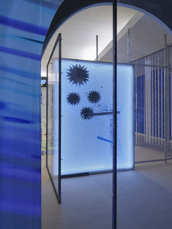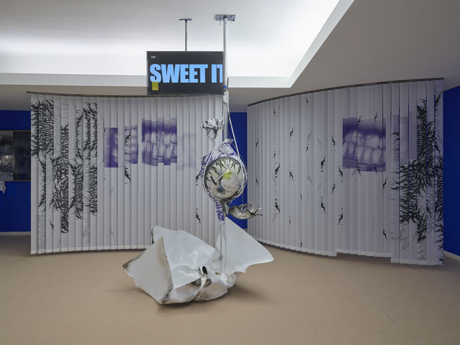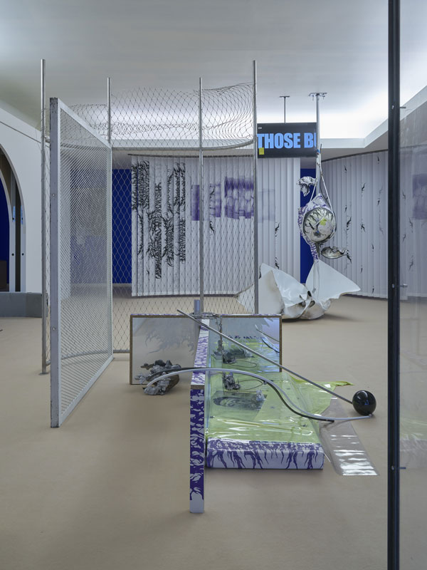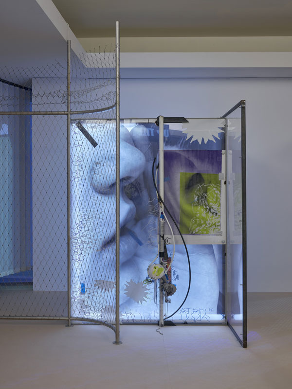Apontamentos estéticos: a psique gótica e as referências urbanas A cenografia fantasmagórica de David Douard pode, assim, implicar uma desencriptação multidirecional, devido à utilização de um amplo espectro de matérias, mas também de referências que vão desde a história da arte (em entrevista o artista faz referência aos artistas japoneses do movimento Fluxus, como Tetsumi Kudo, assim como a Mike Kelly, como fontes de inspiração), à ciência, tecnologia, o mundo virtual (uma vez que os elementos linguísticos são recolhidos online), à cultura mainstream e, de forma vincada, como já suprarreferido, por elementos do espaço urbano. (vide folha de sala da exposição) Acrescenta-se, no entanto, a estética da psique gótica que transborda para a arte contemporânea através da celebração da ambiguidade, da ritualização do caos (Momin, S.M., 2007 [2004], p. 49), da fragmentação e narrativas inconsistentes, do excesso de formas morfológicas e desconexas que Wilhelm Worringer (apud Grünenberg, C., 2007 [1997], p.42) definiu como um pathos estranho que se liga à animação do inorgânico e que traz as interligações e a paradoxalidade das matérias diversas e, ainda, através do deleite pela materialidade voluptuosa e sensual (Momin, S.M., 2007[2004], p. 51) que brota do excesso, de desejo ou fantasia, e que impele a imagens de horror, luxúria e repulsa. (Grünenberg, C., 2007 [1997]. p. 38) E exemplifica-se através: da profusão de representações de bocas, dentes, saliva e línguas compridas, carnudas e pontiagudas que nos remetem para um mundo erótico, mas também de repulsa; dos tecidos de rede, das correntes, fechos éclair, máscaras e cabelo postiço que representam nuances do universo estético de dor, prazer e secretismo das práticas sadomasoquistas; do fantástico e dos filmes de terror, cuja estética e transgressão têm servido a arte contemporânea a nível formal, estilístico e temático (Grünenberg, C., 2007 [1997]. p. 40) e são assumidos através da dentadura de vampiro e da figura estampada do palhaço Pennywise, do filme de terror IT, que aparecem na obra Cortex OV Light 3 (2020-22); de possíveis analogias a mundos distópicos e/ou paralelos pela sonoridade aguda e repetitiva que paira no espaço e que se assemelha a alguns traços sonoros da série sul-coreana Squid Game, e as pequenas casas de plástico invertidas da obra EV’R 2 (2021) que nos projetam para o mundo invertido da série norte-americana Stranger Things; e da referência aos espinhos que, em desenho serigrafado, atravessam várias obras e revelam o interesse do artista pela natureza, o black metal e os graffiti, essa arte urbana expressiva, efémera e ilegal. Este universo imagético protagoniza, desta forma, a transgressão da normalidade e das convenções impostas pela sociedade através da subversão da beleza agradável institucionalizada; da tensão entre o orgânico e o artificial e da dilaceração de binómios como bem/mal, sanidade/loucura, prazer /ofensa visual. (Grünenberg, C., 2007 [1997], p.38) Consequentemente, transparece a ideia de William Burroughs, de que não existe um exterior real na cultura contemporânea, o que leva ao desenvolvimento da designada utopia pirata que consiste num reino mental ou físico que nos liberta das condições de controlo. Estas novas formas do mito podem ser descritas como espaços liminares, transicionais, desancorados, não fixos e resistentes (Momin, S.M., 2007[2004], p. 54) , como acontece com a paradoxalidade que o artista assume ao considerar que O’Ti’Lullabies tanto serve uma realidade urbana pública, aberta, despida e cruel, como a intimidade e a privacidade do quarto de um adolescente que, nesta fase particular de desenvolvimento, experiencia oscilações naturais de humor, a descoberta da sexualidade, a constituição da espinha dorsal da sua personalidade que culmina no que o neurocientista António Damásio designa o sentimento de si, e a vivência das consonâncias e dissonâncias entre o seu mundo privado e a esfera pública das relações sociais. Esta dualidade e a sua transitoriedade de estados (abertura/encerramento; público/privado) foi representada através de objetos como cortinas, grades de metal, fechos, correntes e portas envidraçadas que, por não se encontrarem sempre dispostos de forma a cumprirem a sua funcionalidade, aludem, simultaneamente, a uma concetualização de um mundo desconexo e fragmentado. Este mundo onde, também, a poesia surge em versos inteiros (U/They ((, 2021) ou incompletos pelas folhas rasgadas ou por se encontrarem parcialmente dentro da estrutura que parece guardá-los (For thee Secretion’2, 2021), e onde os reflexos surgem múltiplos pelas superfícies vidradas (Lick´ng a’n OrchiD 6, 2021; U/They, s.d.) e espelhadas (U/They ((, 2021), através dos quais nos encaramos, assim como aos outros que circulam pelo espaço, e às obras e objetos em redor, e nos traça a metáfora entre o concreto e o abstrato que caracteriza este espaço organizado como um Cadavre Exquis de signos, objetos e palavras.