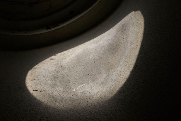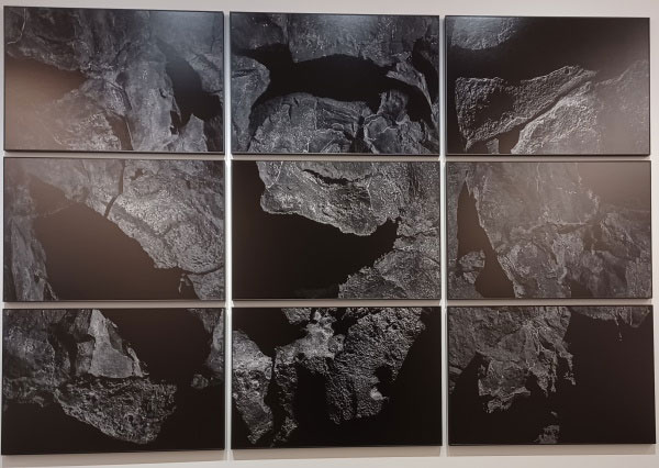 Mas parece que depois as imagens (ou em todo o caso a maioria delas) lhe escaparam e adquiriram a sua própria autonomia, o seu discurso independente, que se despojaram do seu argumento natural para se tornarem puros objectos culturais: esqueça o que representamos, dizem elas, não leia as legendas, contentai-vos em nos olharem fixamente, longamente, com atenção. Nós somos objectos, matéria, esculturas planas, composições de formas e de cores abstractas; não tentem decifrar-nos, “compreender-nos” e abandonai-vos à contemplação, à meditação. Este é um rasgão branco sobre um fundo preto: mas isso não basta para saboreá-lo, para desfrutar deste recorte de renda, desta inquietude sombria que devora a luz. É um lago de montanha, é, dizem-nos, uma ilha, uma parte de arquipélago, outras são vizinhas na parede, e claro evocamos o Atlântico e os Açores, mas é necessário? Sentem-se mais ricos, mais felizes em saber que esta fotografia foi pensada e construída assim? Esta é uma forma perfeita, eterna, arcaica, podemos imaginar uma pedra na mão de um Neandertal, ou então um ídolo primitivo, um símbolo andrógino. A sua superfície é picotada, marcada, como traços de uma história desconhecida. E ficamos quase desiludidos de ler a legenda, Onda, e de perceber que é um jogo de luz sobre a areia à beira-mar: não que não seja também uma pista interessante, transporta-nos para uma fusão sensual de elementos, mas porque não é só isso, isso limita o meu olhar, a minha fantasia, afasta-me da forma pura para me constranger a uma única leitura. Sísmico (2019) é um magma fusional onde formas indistintas se entrelaçam num abraço infernal, e fico feliz de não compreender nada, de não saber do que se trata (e de me abster de o perguntar à Manuela): eu não quero saber, eu quero somente mergulhar nessa imagem, nessa matéria ao mesmo tempo atraente e repulsiva, e deixá-la penetrar o meu corpo, o meu cérebro e as minhas entranhas (e, graças a Deus, ela chama-se Sísmico, o que não diz nada de preciso). Da mesma maneira, uma parede de imagens a cores, intitulada Superfícies Sensíveis, oferece ao olhar uma sinfonia visual complexa, que, podendo evocar a química dos fotogramas, derrota à vontade, e isso está muito bem assim.